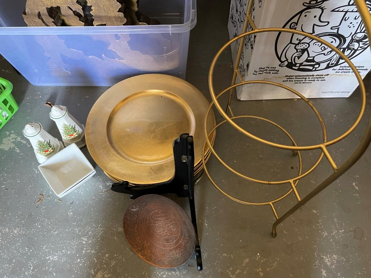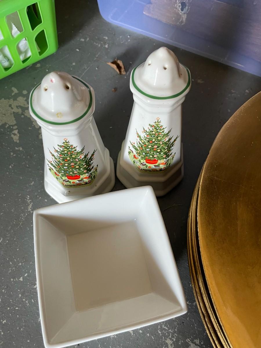 Holiday Salt & Pepper Shakers, 8 Gold Chargers, 1 Asian Bowl, 1 Easel, 1 3-Tier Plate Holder, 2 White Soy Serving Bowls