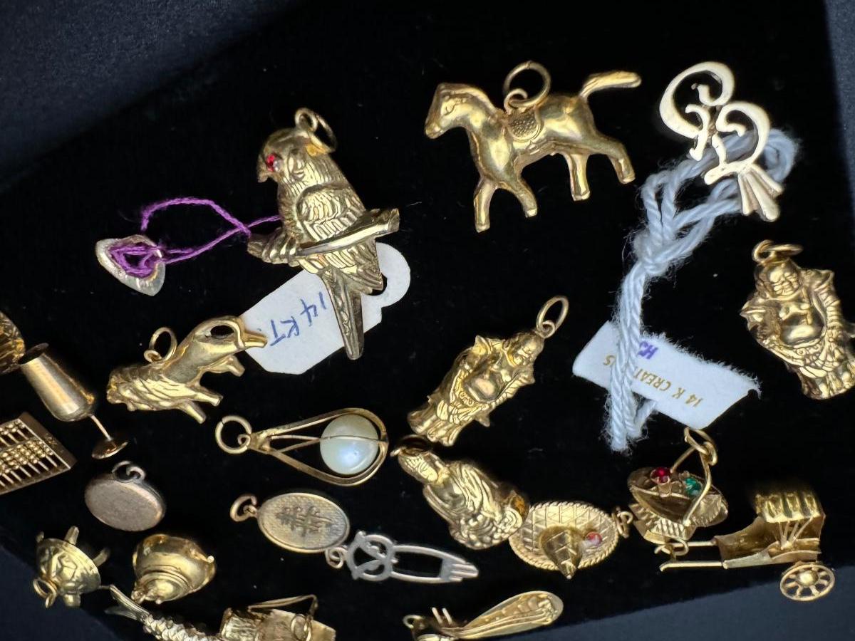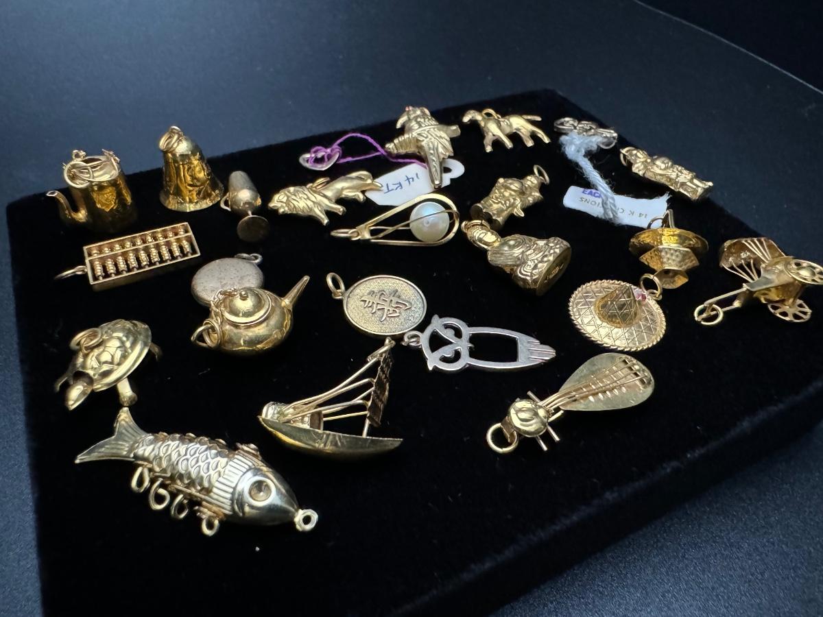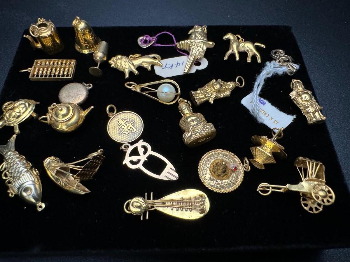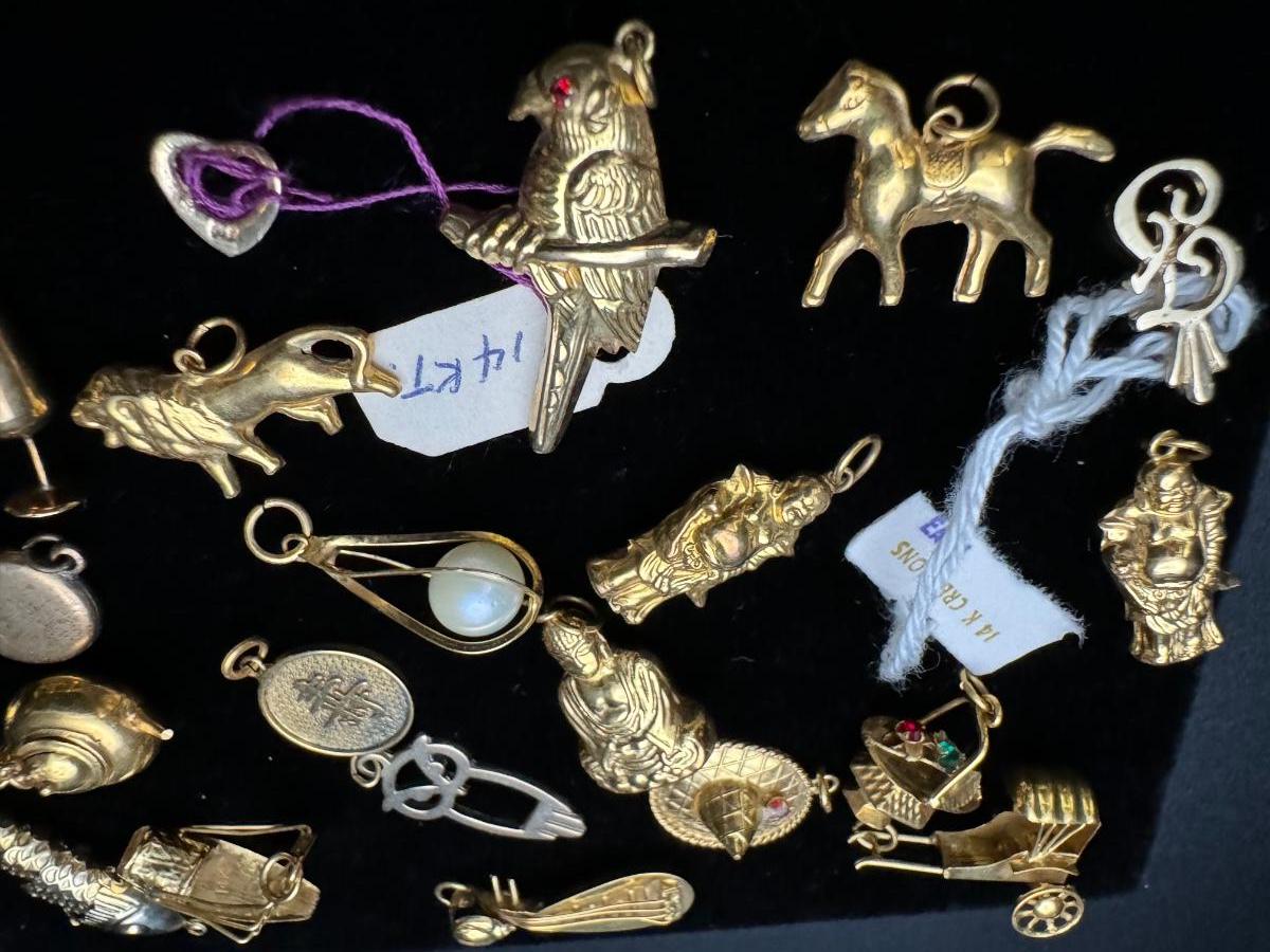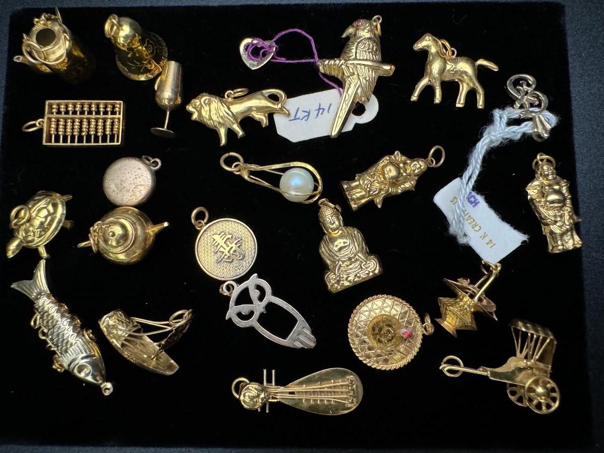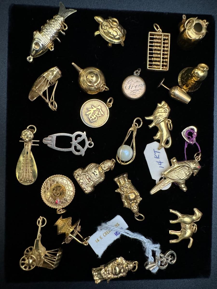 Buying as is, as found in this wonderful estate. See MANY PHOTOS for Content, Condition & Dimensions. NEVER a Buyer's Premium or Credit Card Fee. All "lots" start at just $10 and sell with No Reserve to the highest bidder. Most charms are stamped 14K.