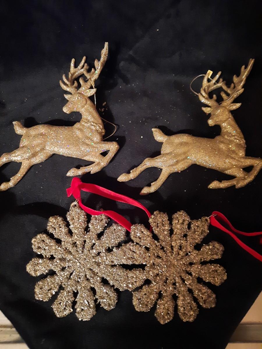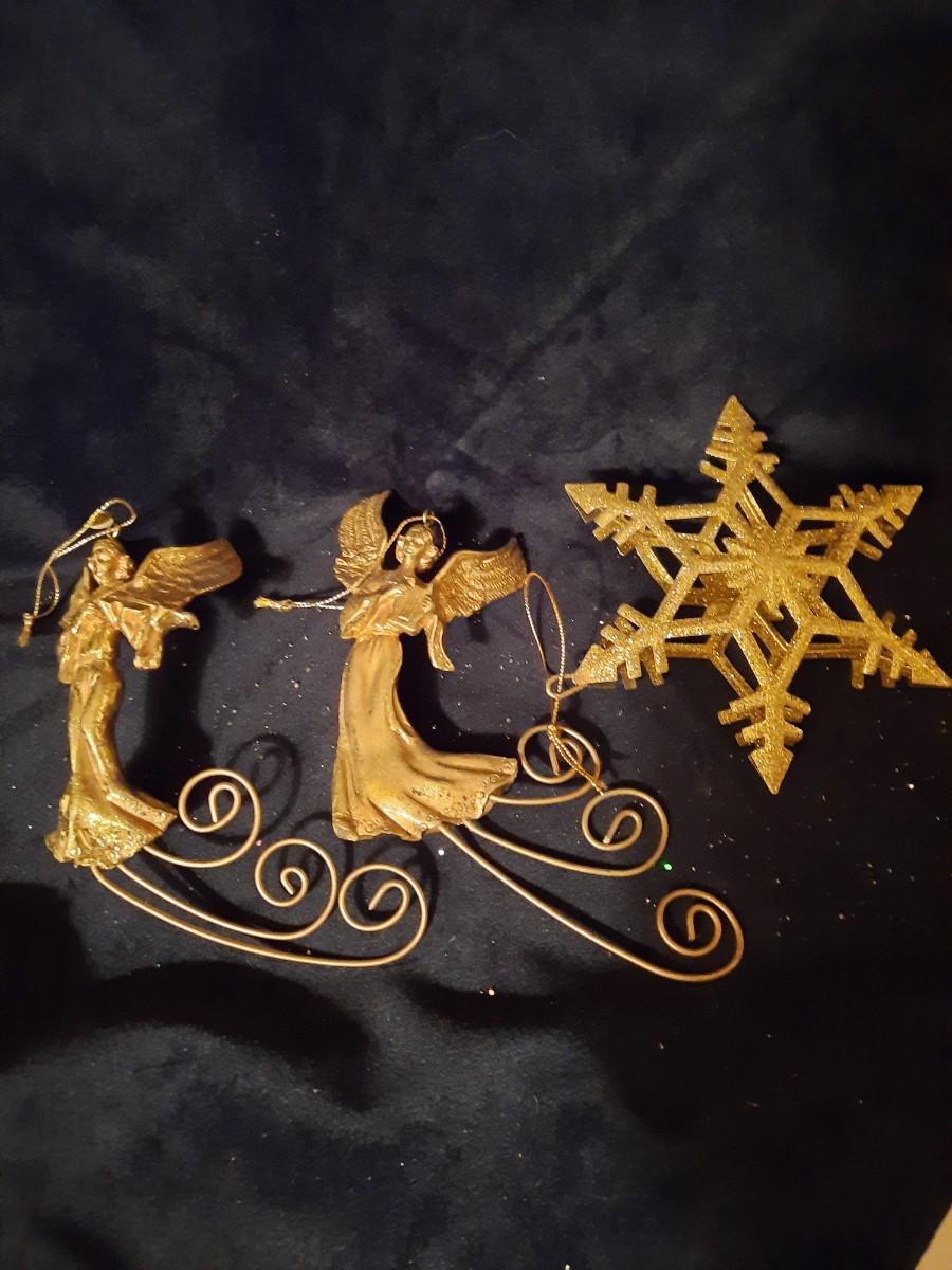 Super shimmery gold Christmas ornaments - snowflakes, reindeer, cherubs, angels, and more.