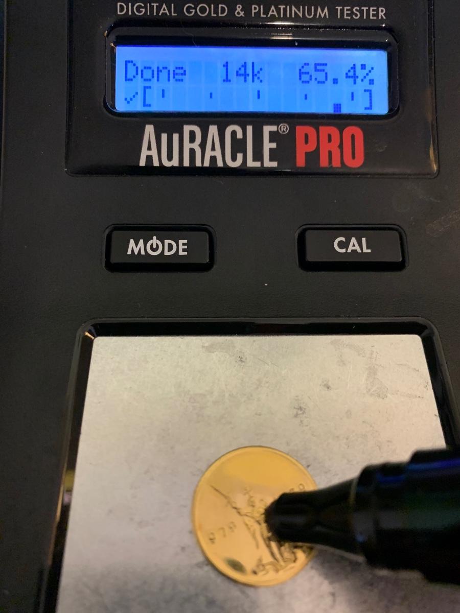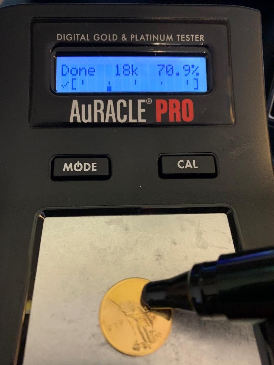 Authentic Gold Coin. See final few photos, we got tests results between 65-70 percent which is standard for coins. Coin weighs 6.45 grams. Close-up photos shot thru our grid magnifier to show nice surface condition of coin. Case shows some wear. Unless you are a frequent flier with us - Out of state buyers must pay via cleared check, money order, or wire transfer - no credit cards on Precious Metals. We ship via USPS Priority Mail and Insure to you bid value. Buyer pays shipping/insurance fees.