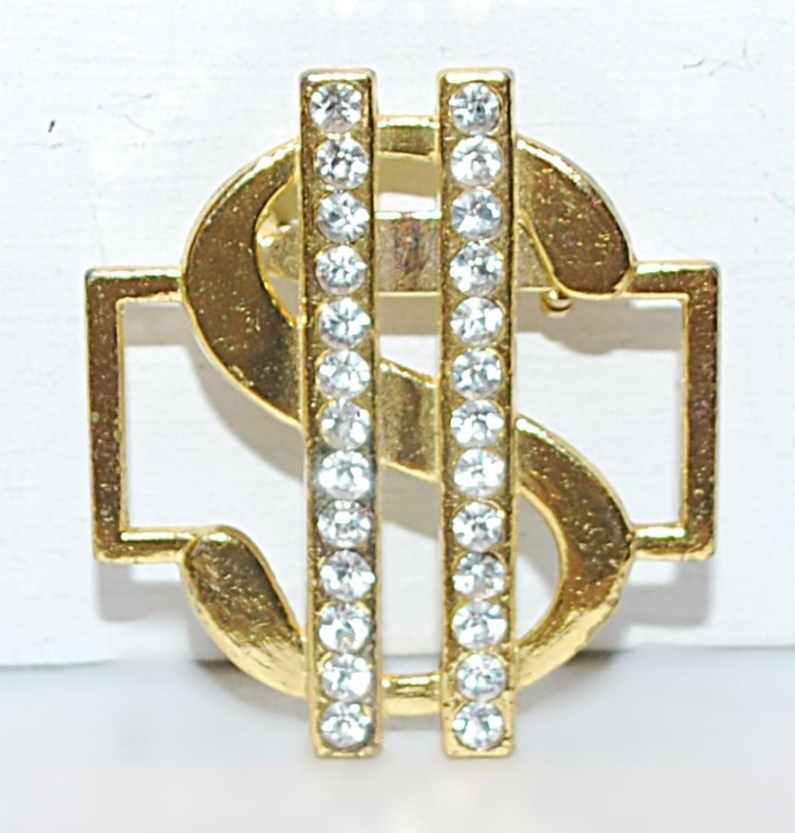 Gold Color DOLLAR SIGN BROOCH (1½" x 1¼") with 2 Vertical Rows of Round Clear Stones on a Gold Tone Setting