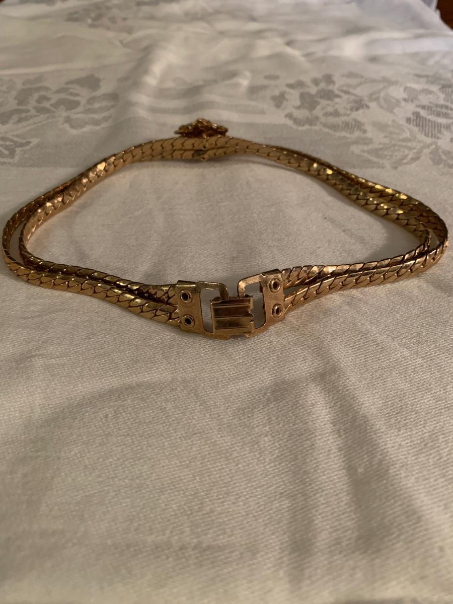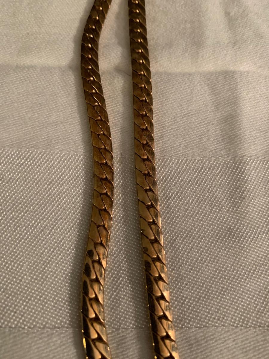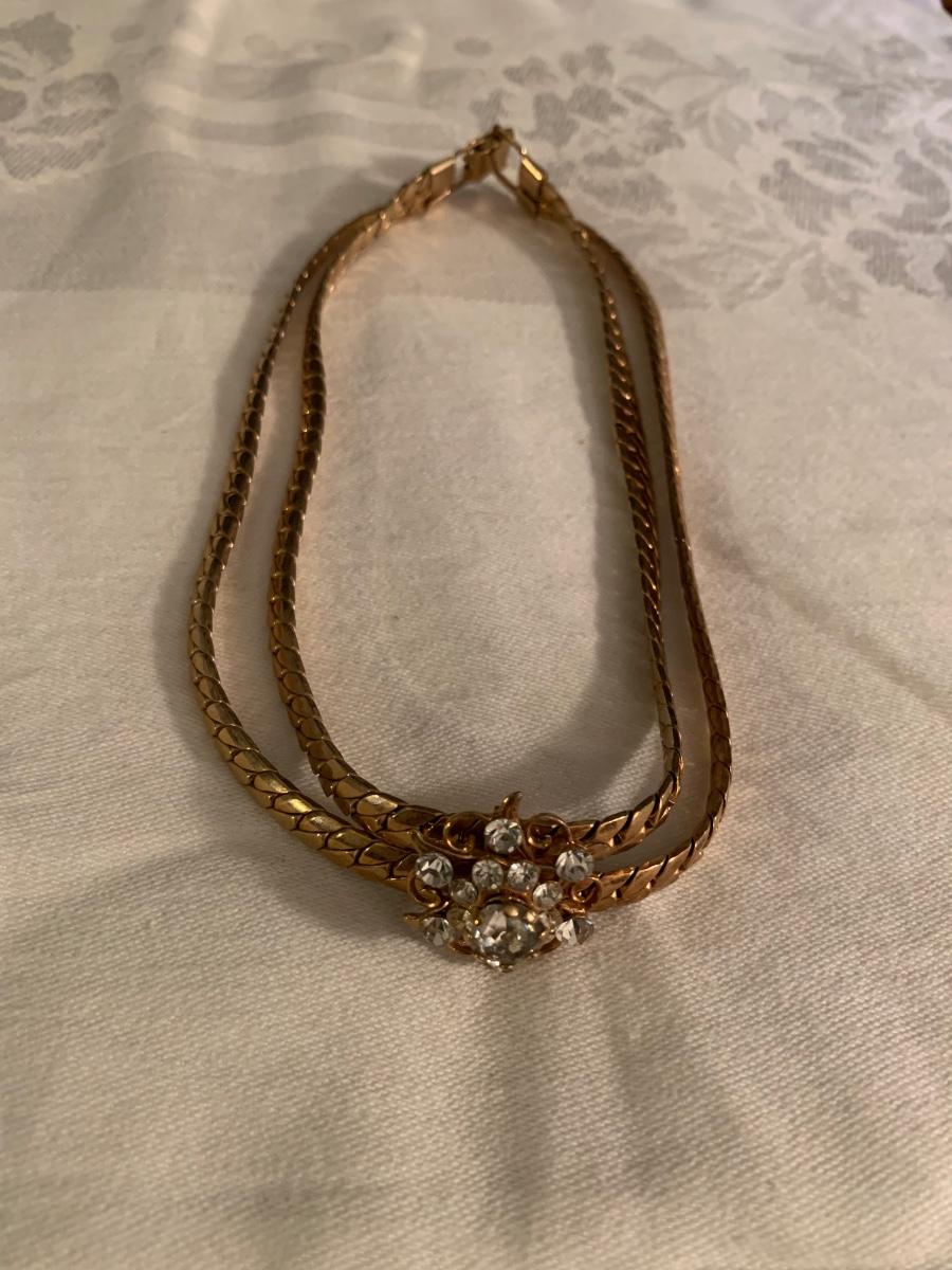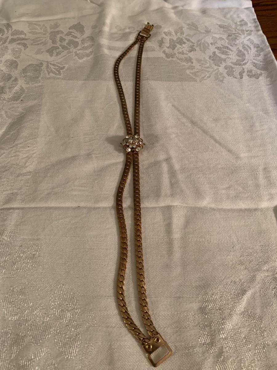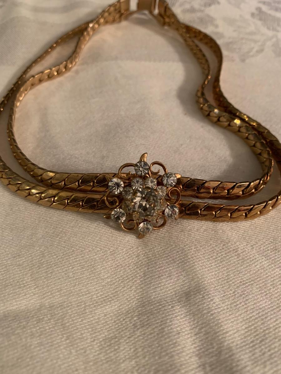 Gold colored herringbone necklace with secure latch and rhinestone decorative center