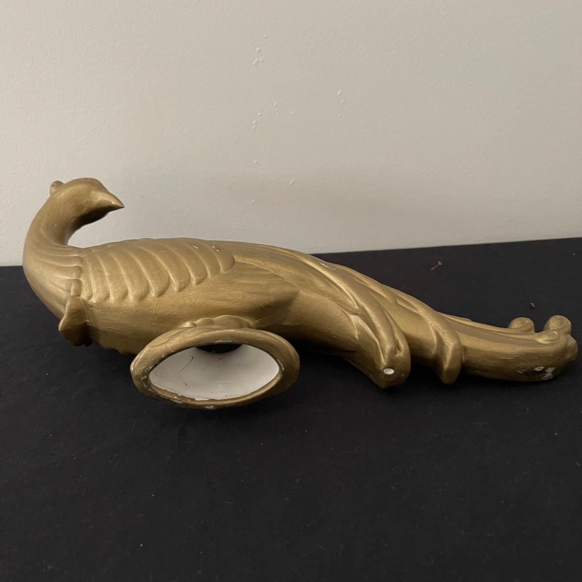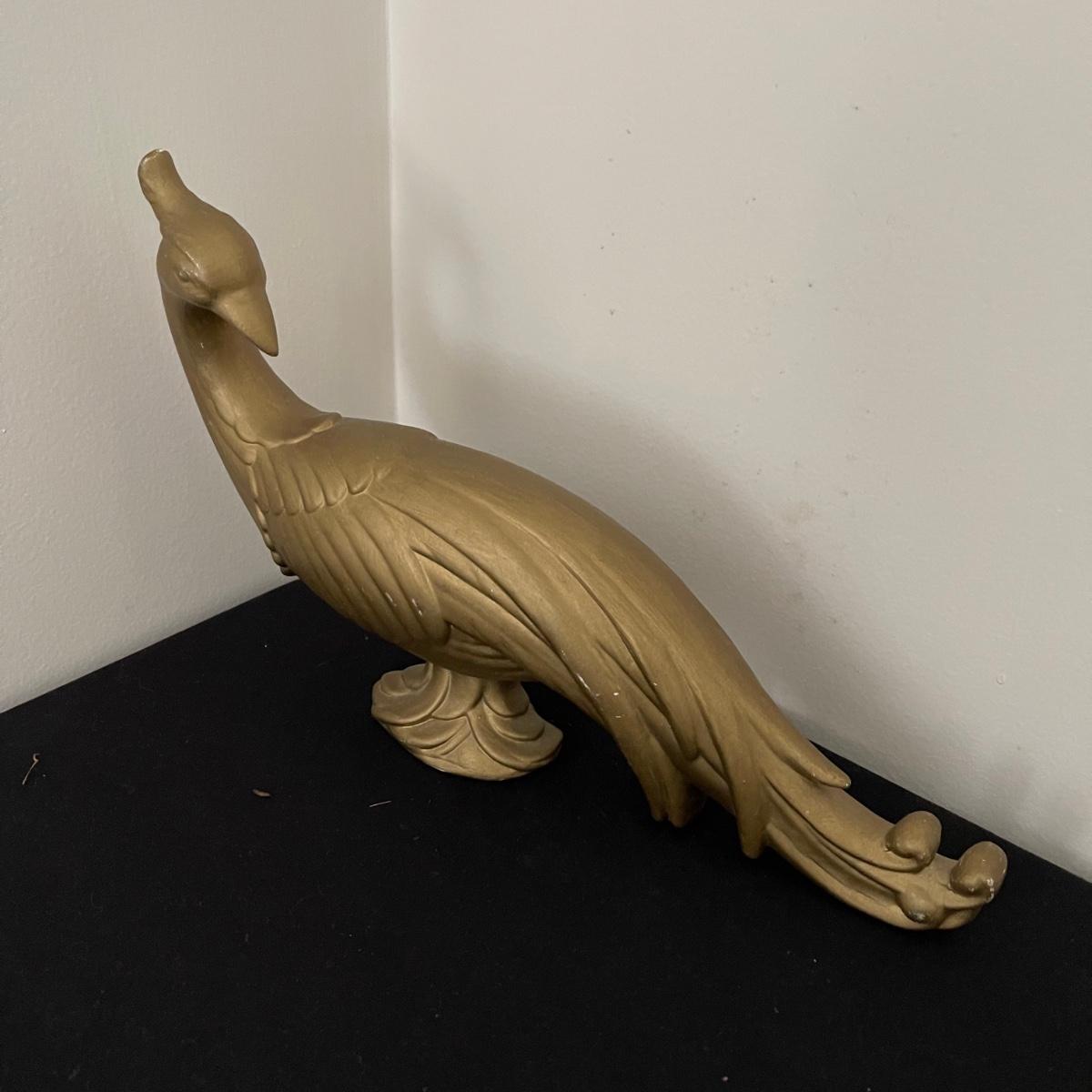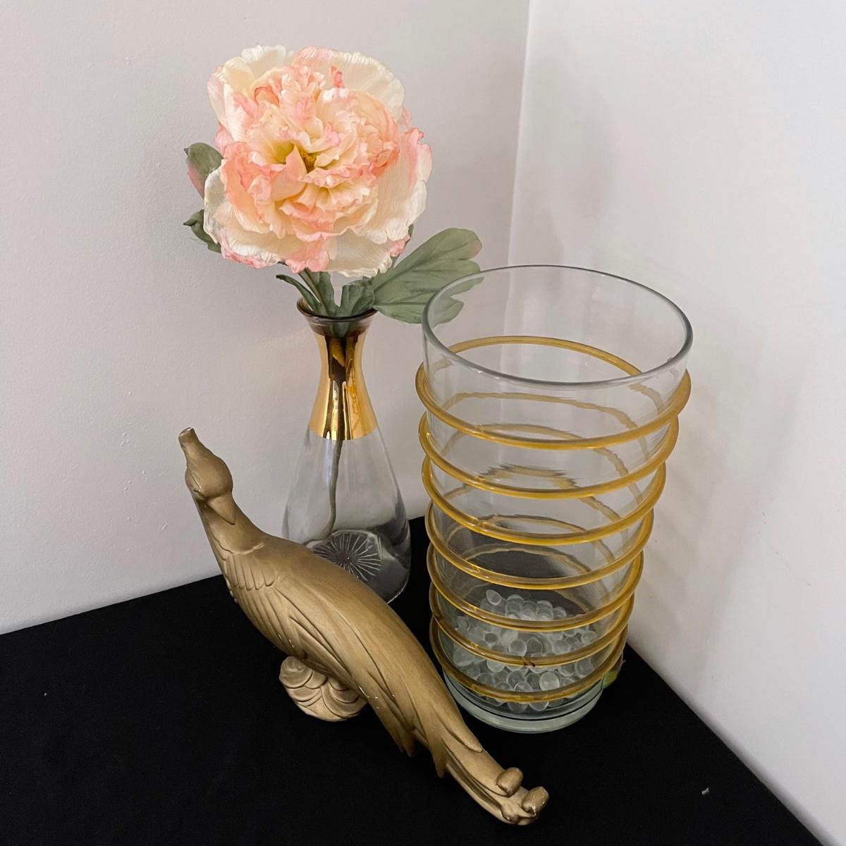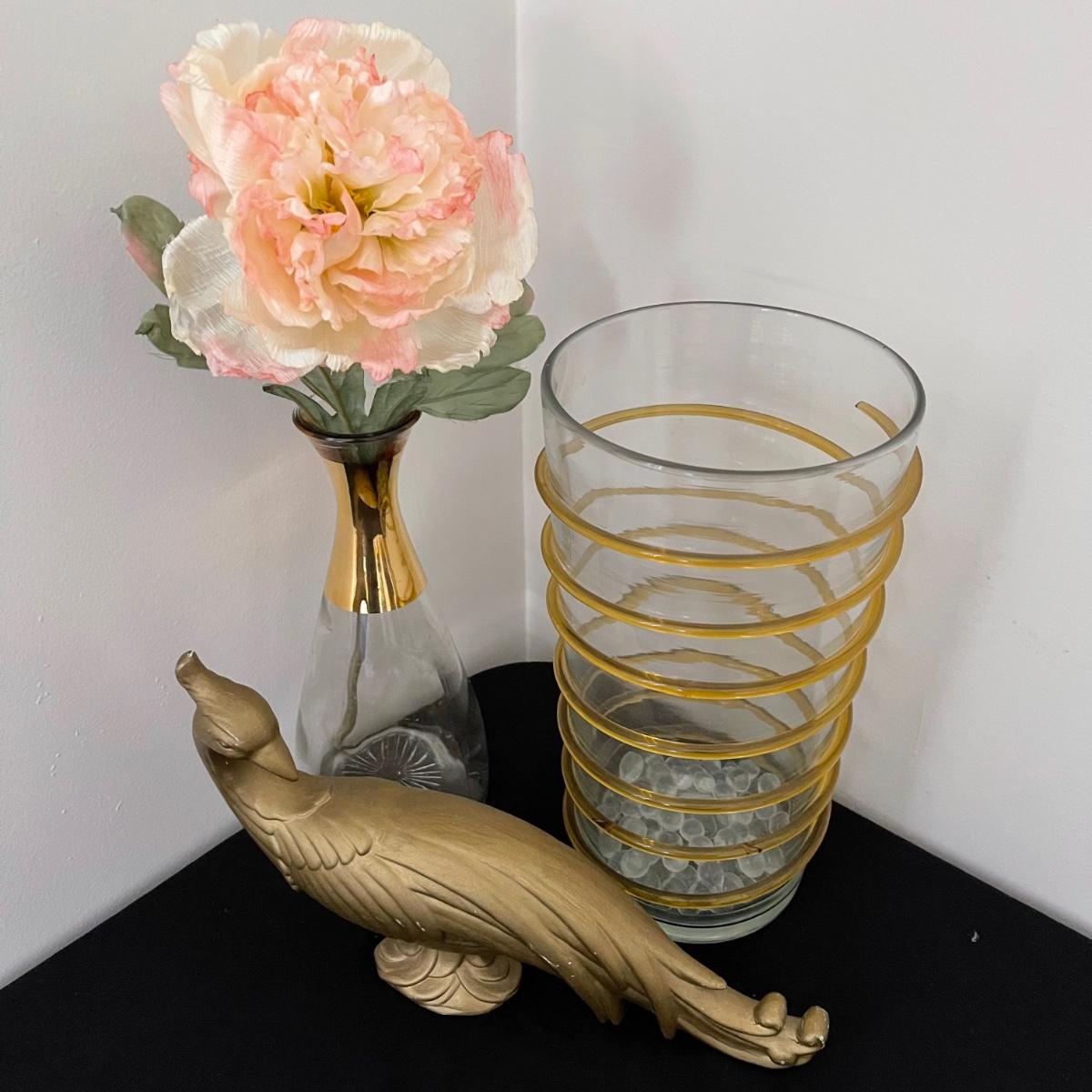 Three home decor items, a large glass vase with gold colored pulled glass swirled around it, a thin-necked vase with a gold colored section, and a matte gold-colored cast ceramic peacock. A plastic flower is included, as well as some clear glass orbs in the large vase. The large vase is 12” tall.
