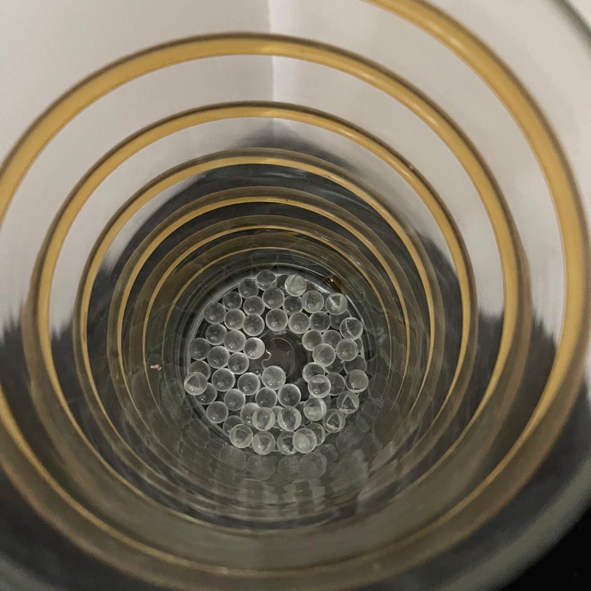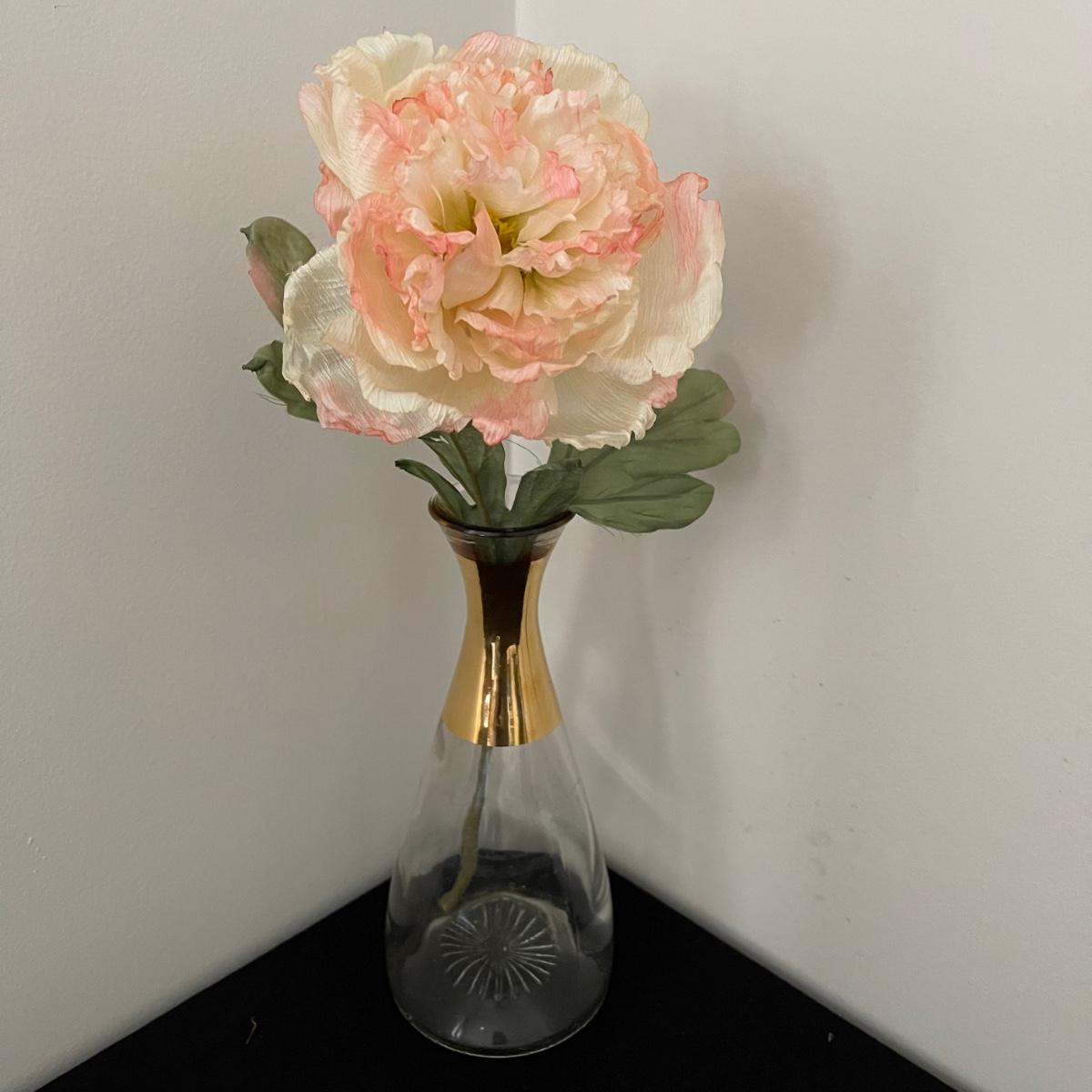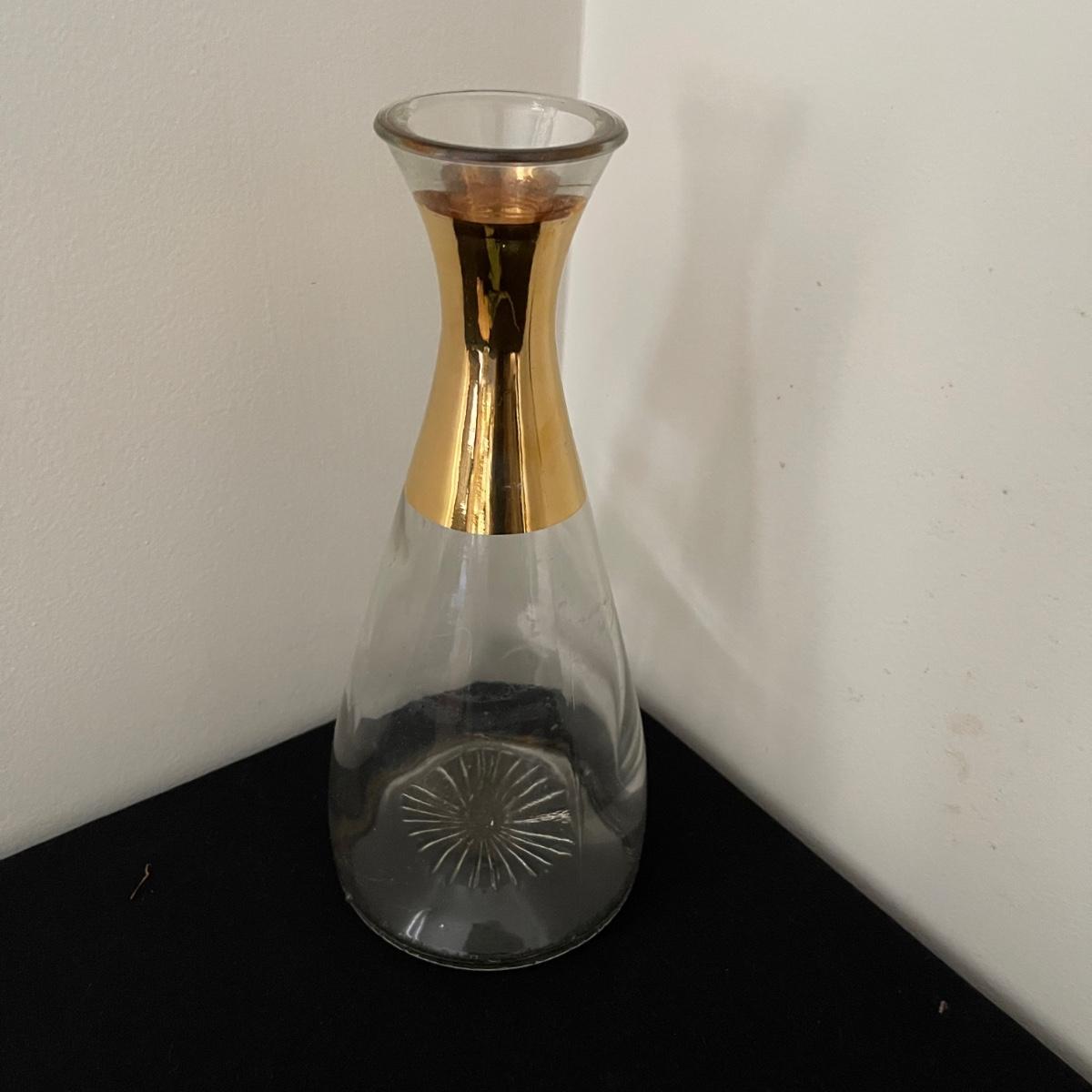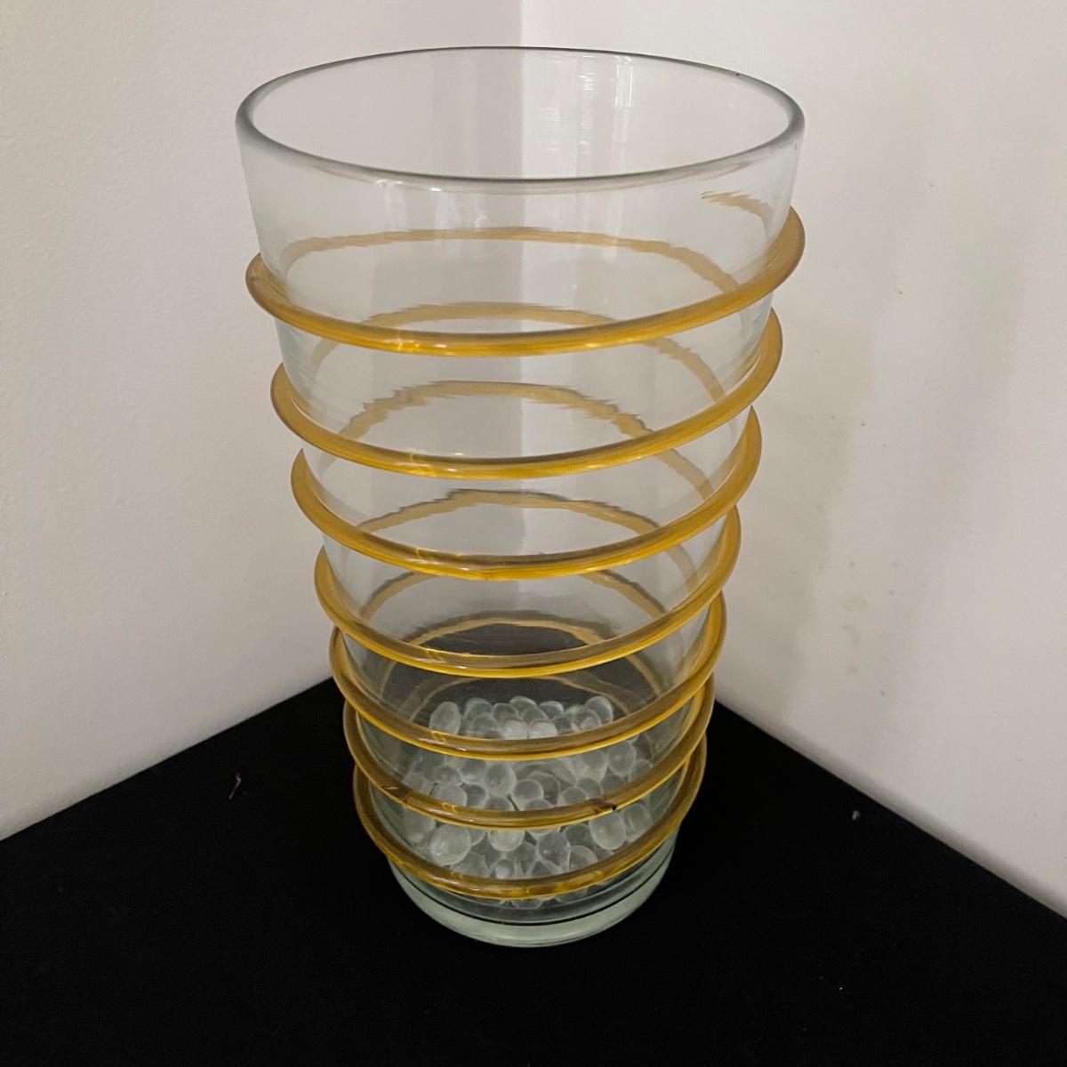 Three home decor items, a large glass vase with gold colored pulled glass swirled around it, a thin-necked vase with a gold colored section, and a matte gold-colored cast ceramic peacock. A plastic flower is included, as well as some clear glass orbs in the large vase. The large vase is 12” tall.