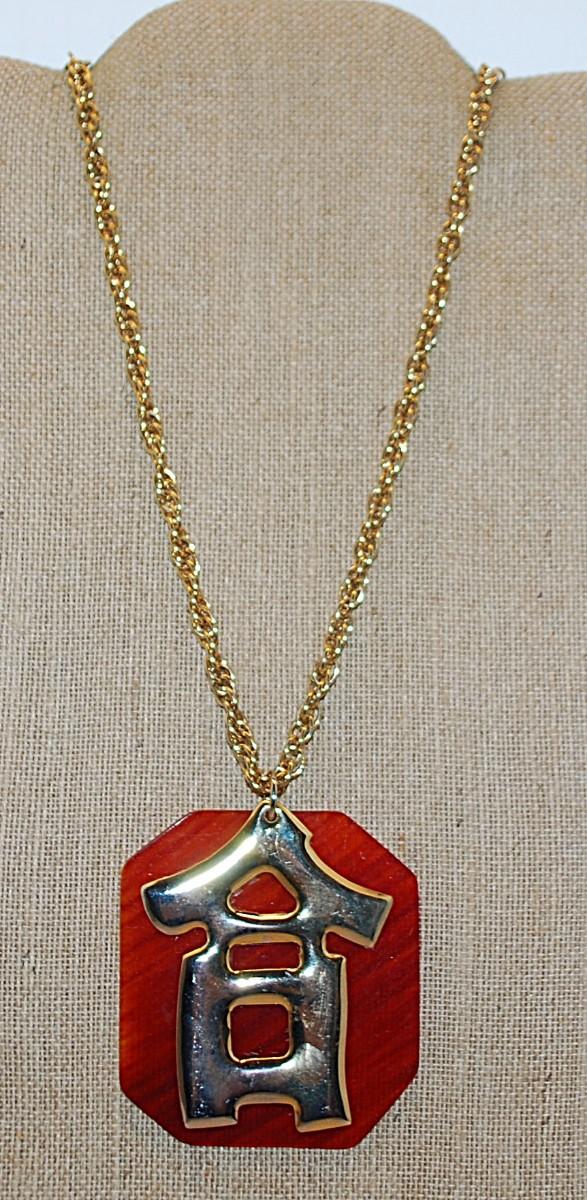 Gold Colored Extra Large CHINESE LETTER PENDANT NECKLACE (3" x 2¾") on Acrylic Base and WRAP-AROUND Gold Tone CHAIN 36" L