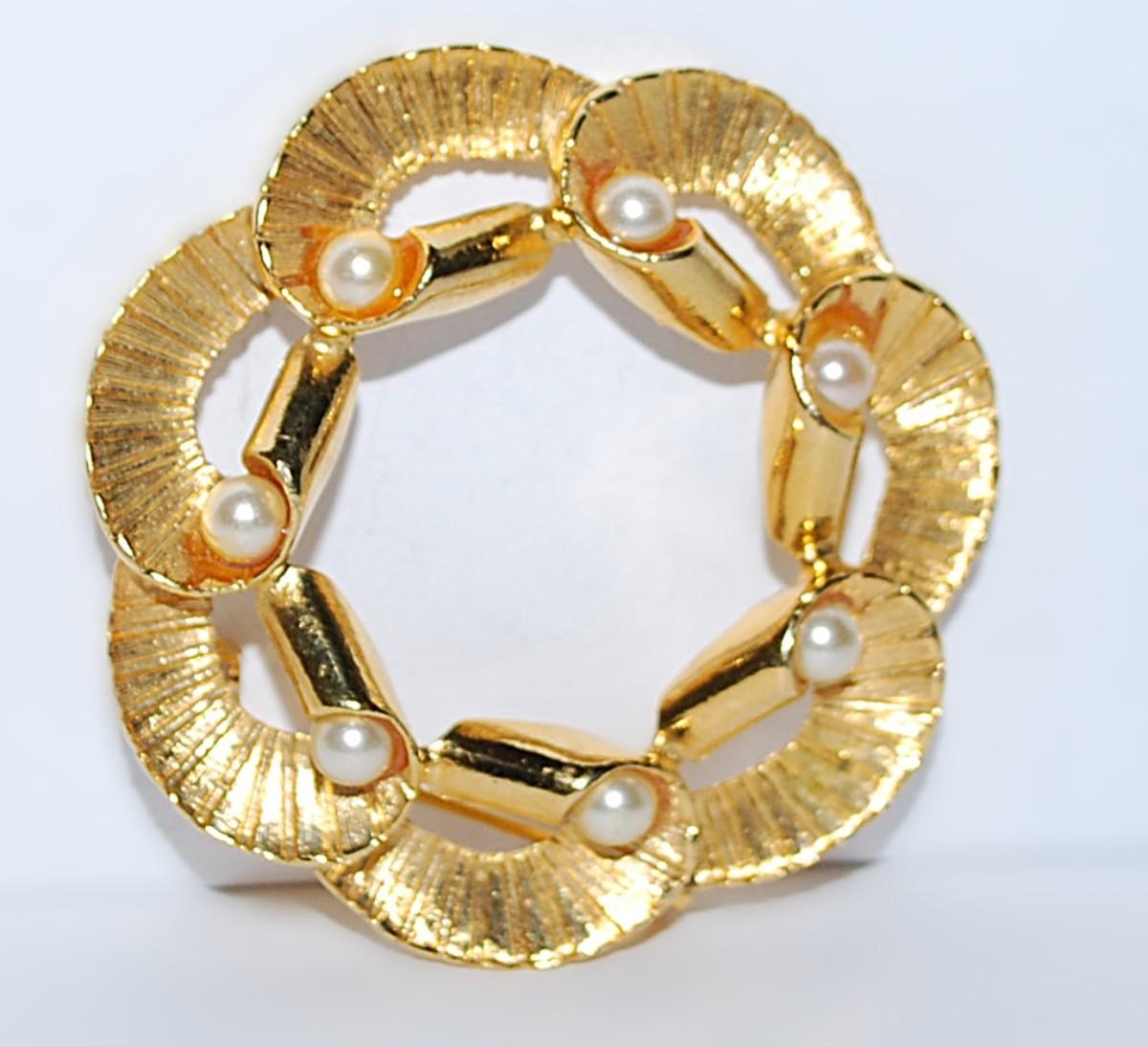 Gold Colored FAN LOOPS BROOCH (1¾" Diam.) with 7 Faux PEARLS on a Gold Tone Setting