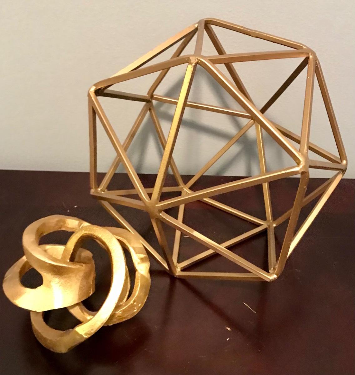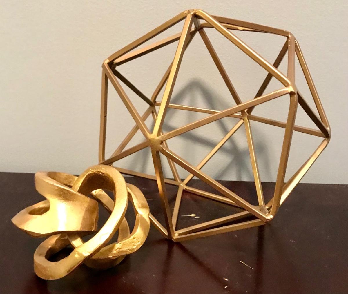2 Gold colored geometric sculptures