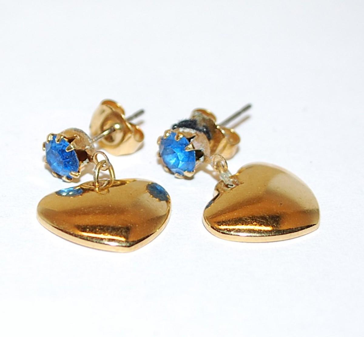 Gold Colored HEARTS EARRING Set with Single Blue Stone Accent and Stud Post Clasp
