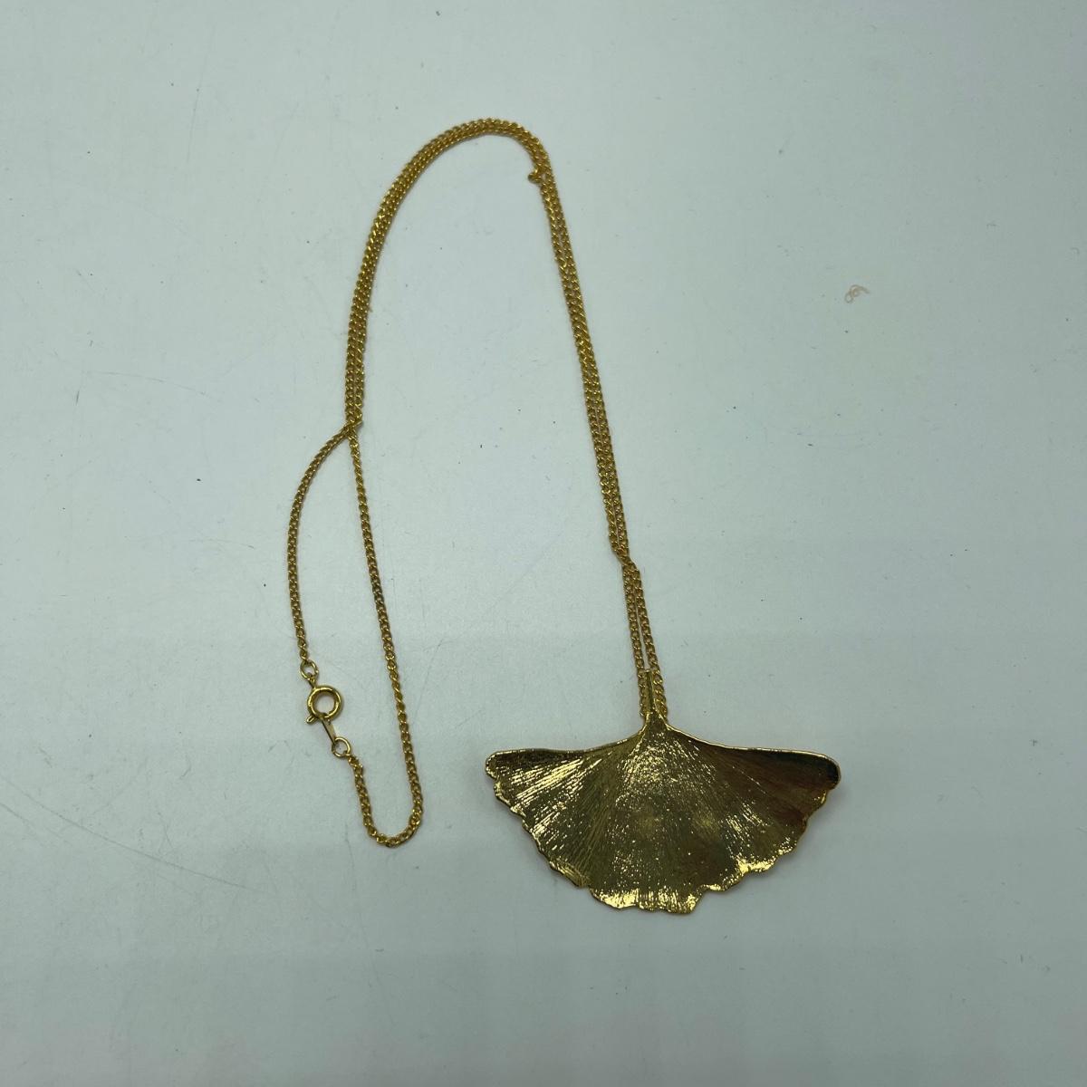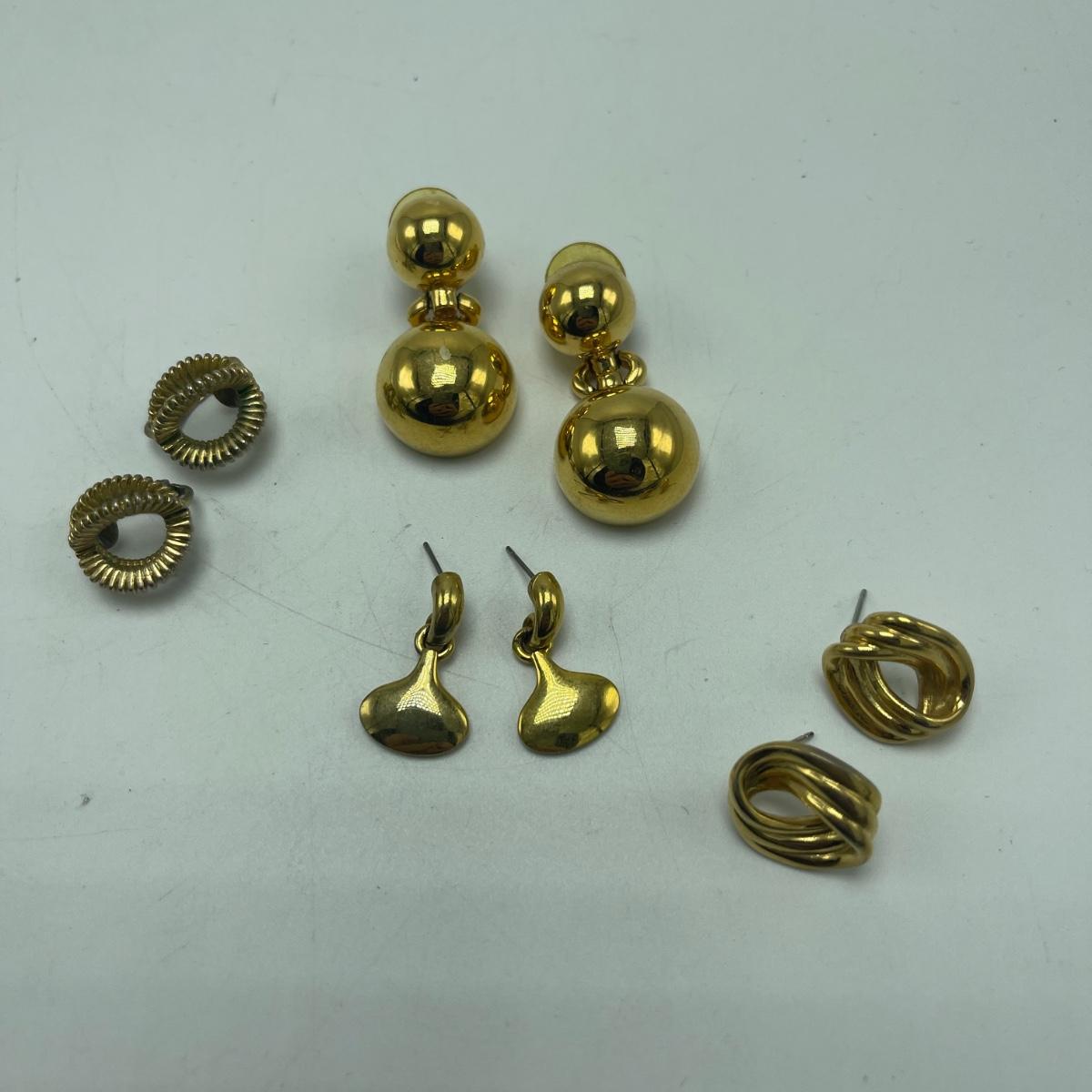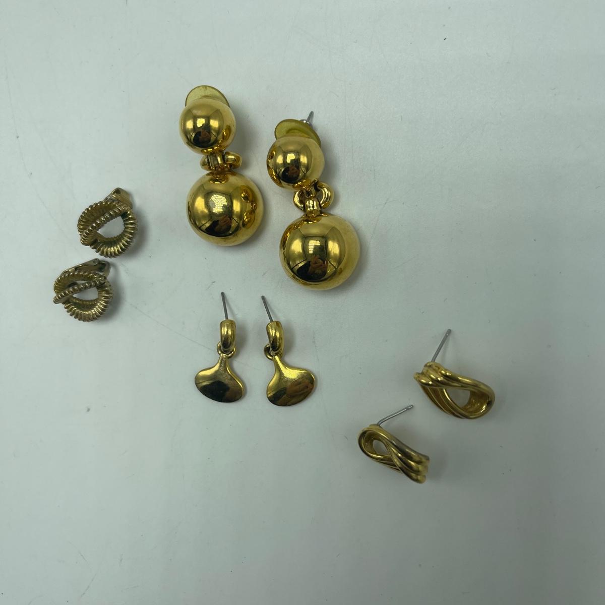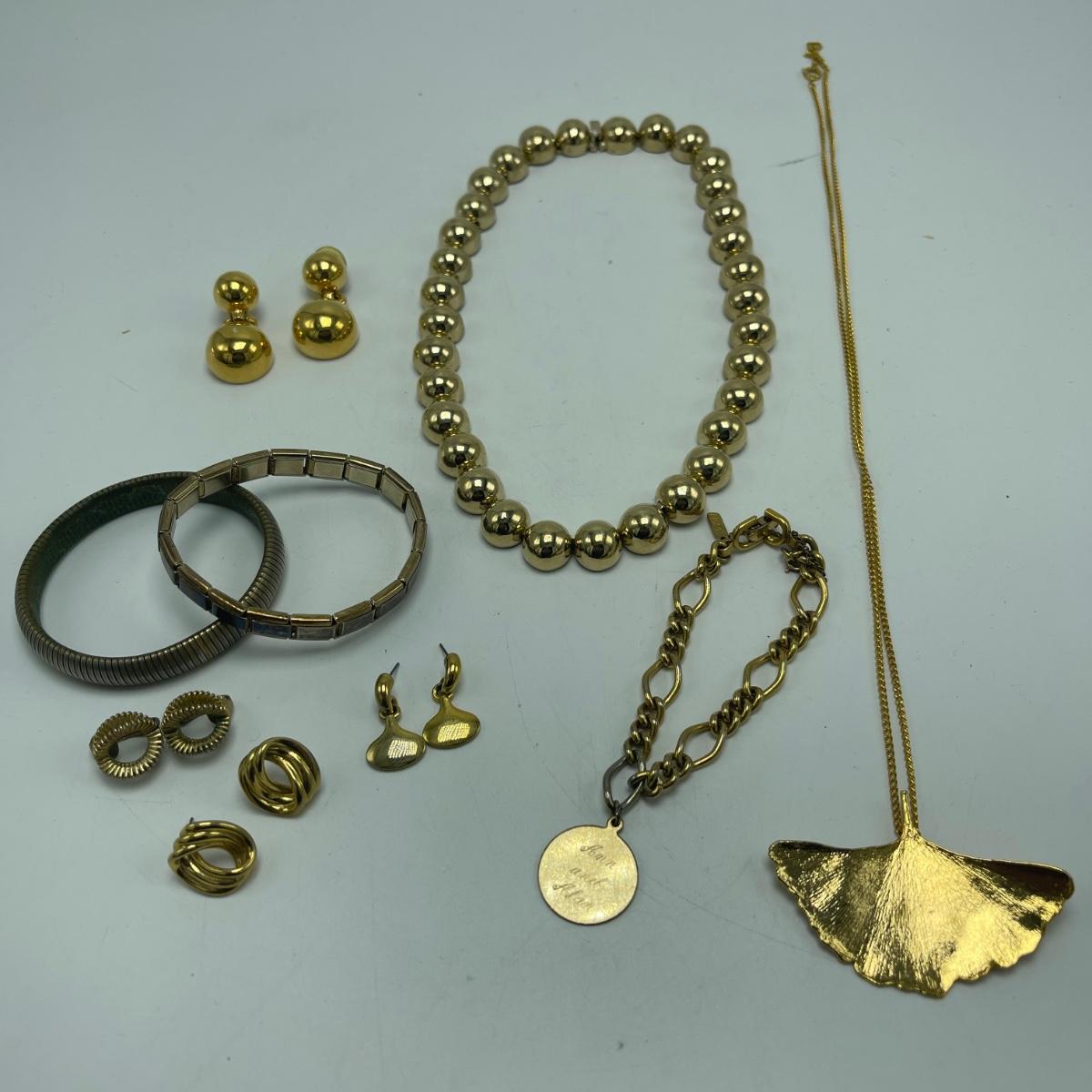Two necklaces, four pairs of earrings, and three bracelet make up this gold colored jewelry lot. One of the pairs of earrings are clip-ons. One of the bracelets is a custom Monet bracelet with a charm that has names and a date; it can be removed from the chain. The ginkgo leaf necklace has a simple thin gold chain.