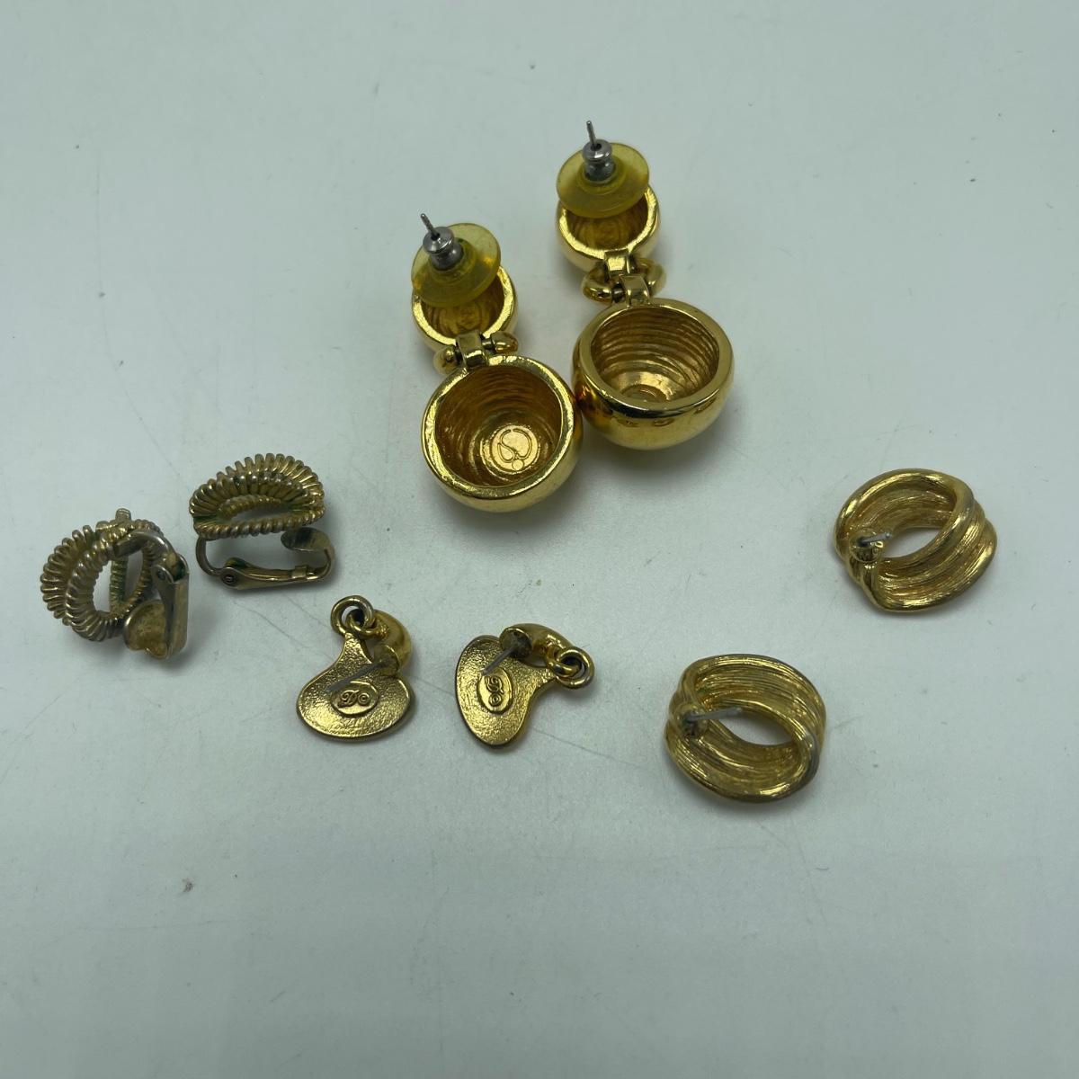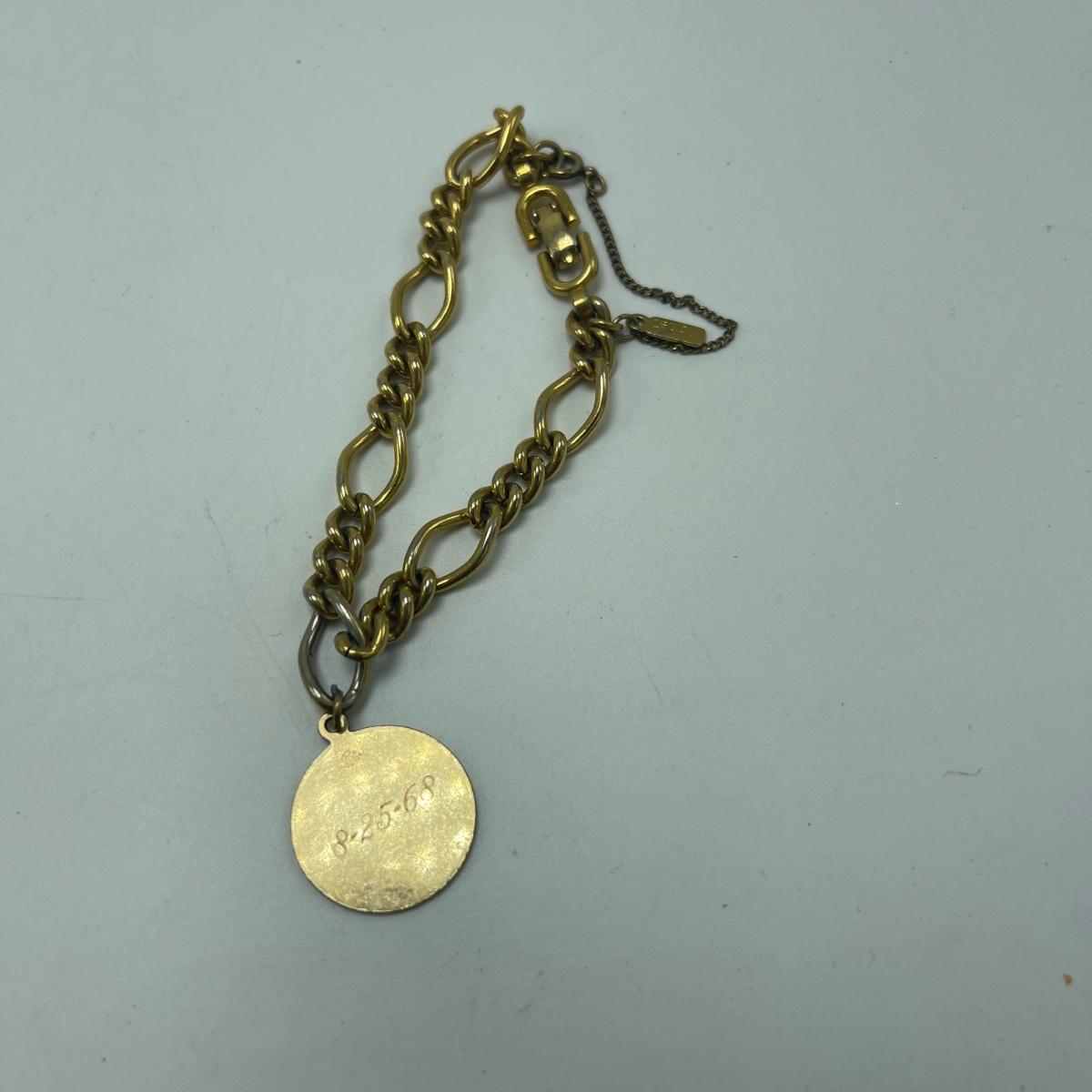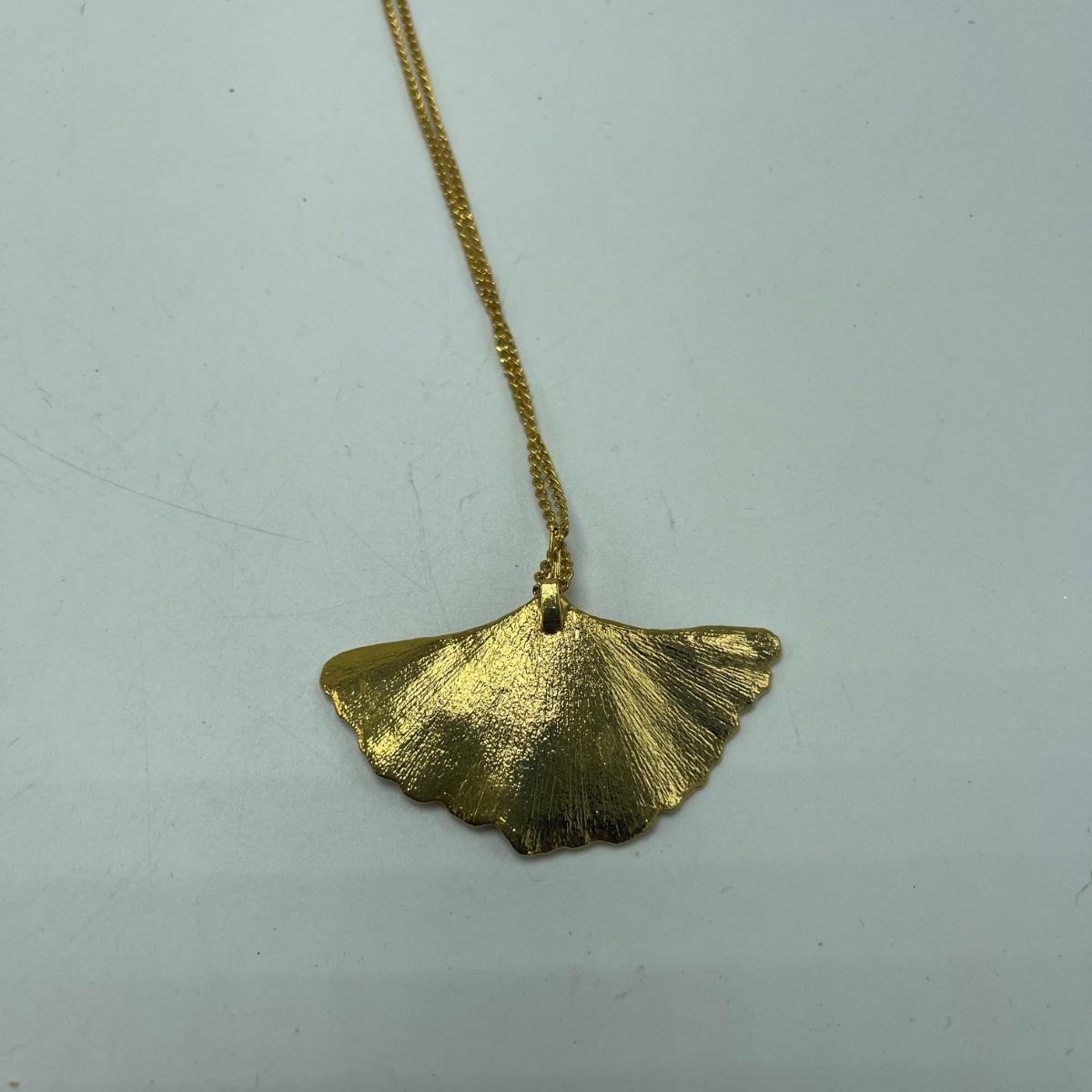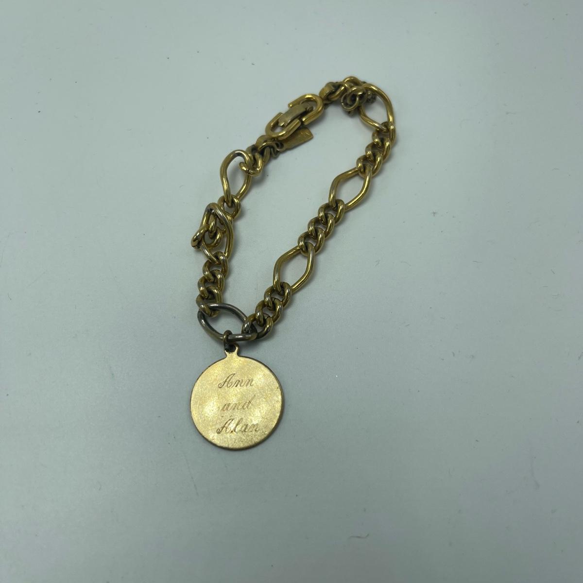 Two necklaces, four pairs of earrings, and three bracelet make up this gold colored jewelry lot. One of the pairs of earrings are clip-ons. One of the bracelets is a custom Monet bracelet with a charm that has names and a date; it can be removed from the chain. The ginkgo leaf necklace has a simple thin gold chain.