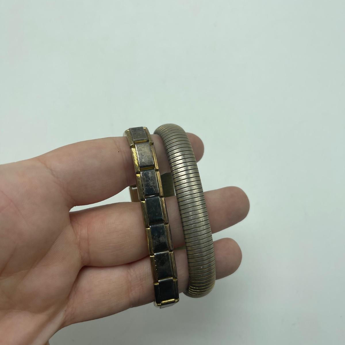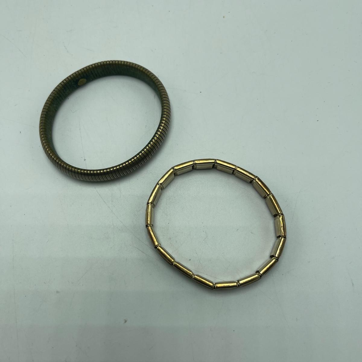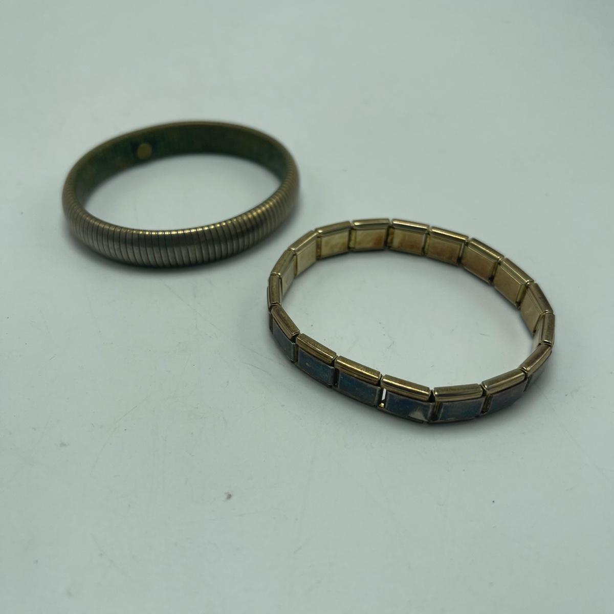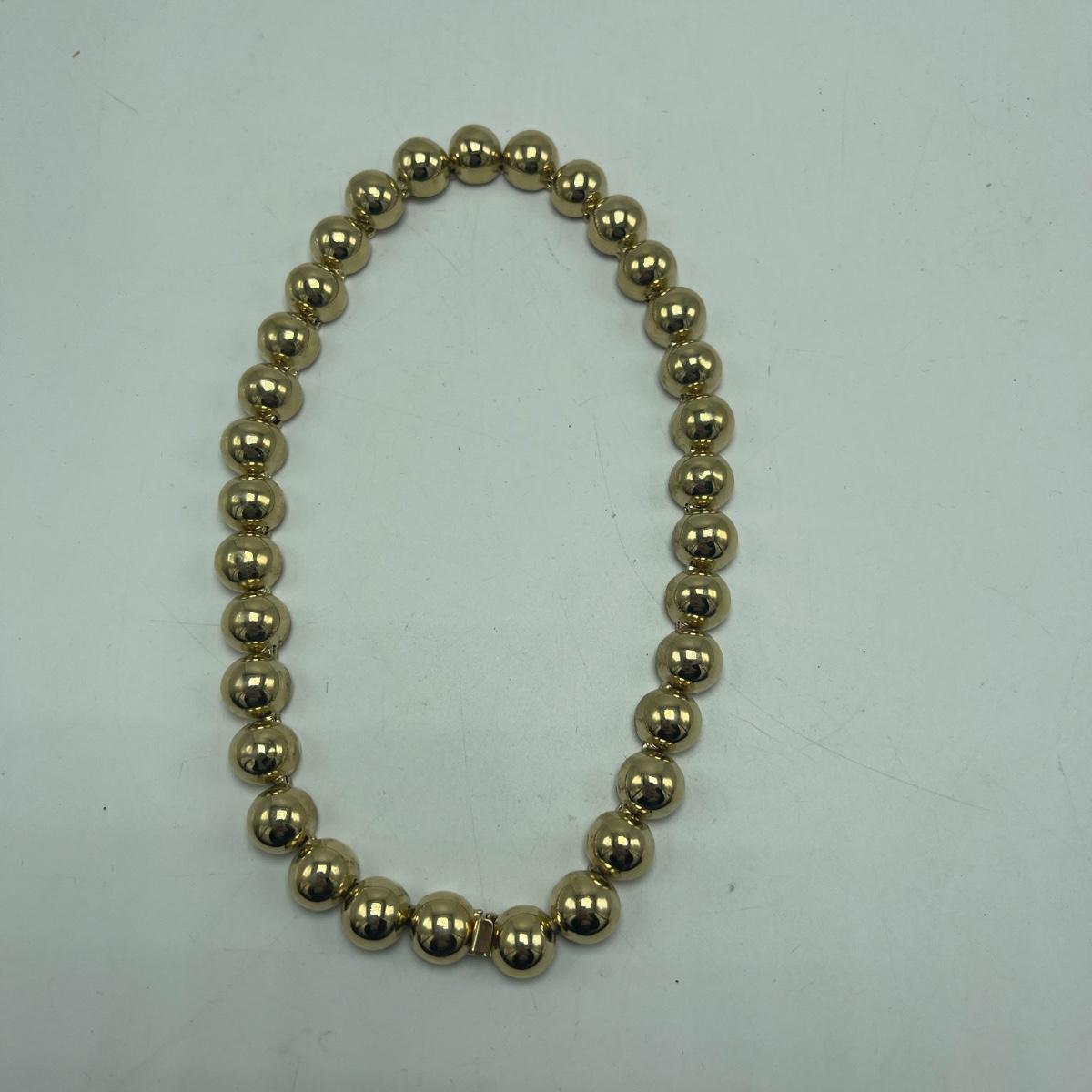 Two necklaces, four pairs of earrings, and three bracelet make up this gold colored jewelry lot. One of the pairs of earrings are clip-ons. One of the bracelets is a custom Monet bracelet with a charm that has names and a date; it can be removed from the chain. The ginkgo leaf necklace has a simple thin gold chain.