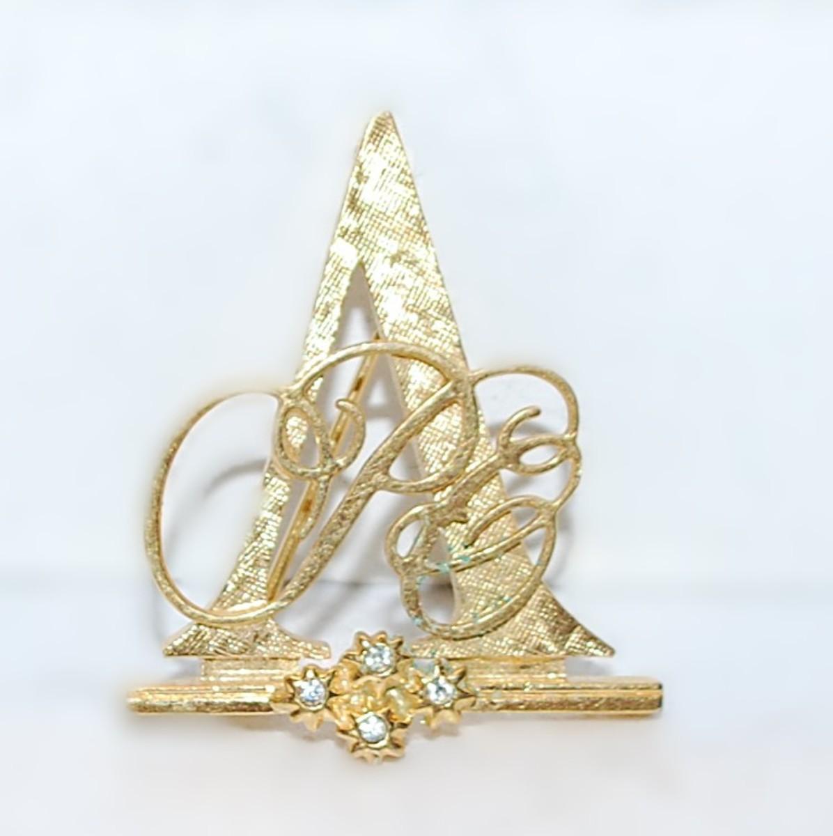 Gold Colored TRIANGLE BROOCH (1¼" x 1¼") with a Script Design and 4 Accent Stones on a Gold Tone Setting