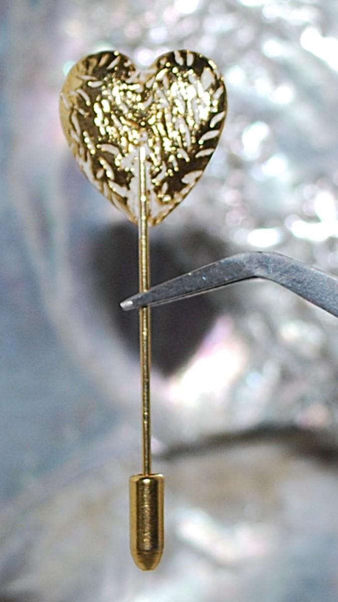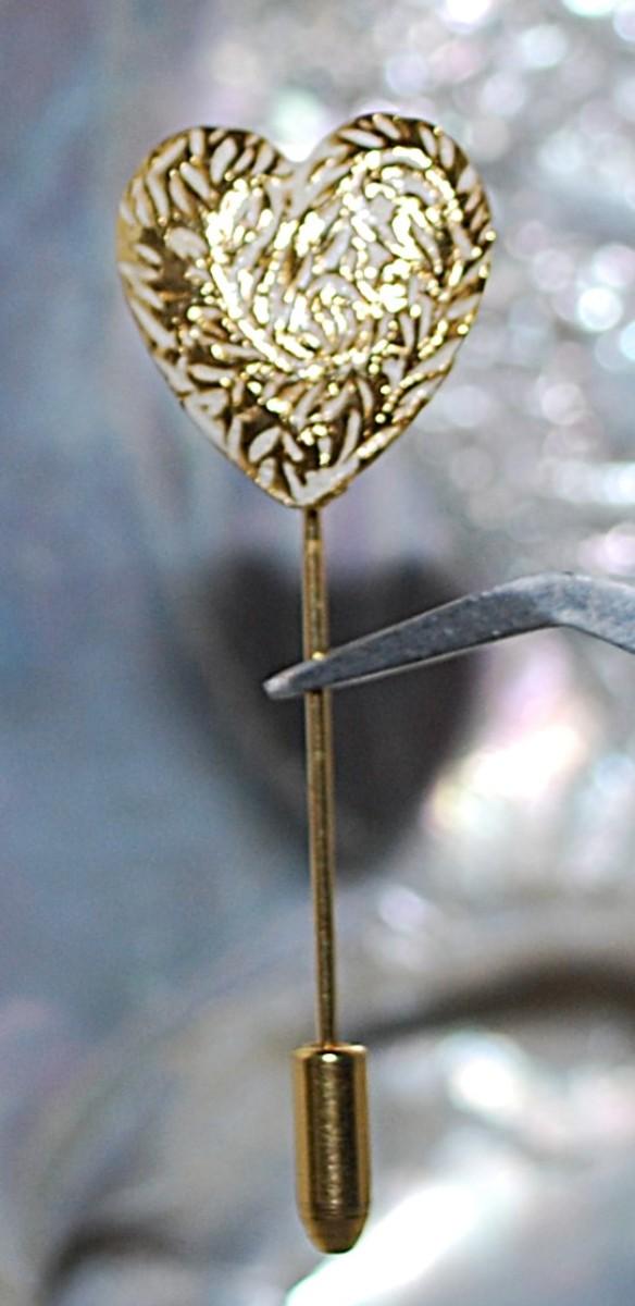 Gold Colored & WHITE HEART PIN (2¼" L) with Pin Guard on a Gold Tone Setting