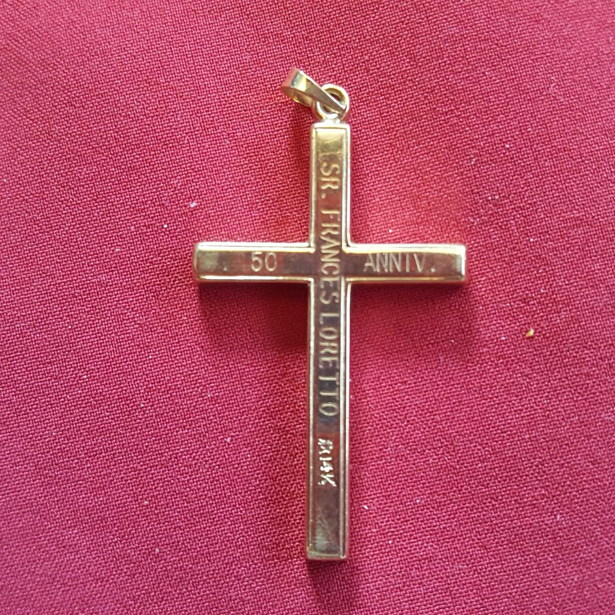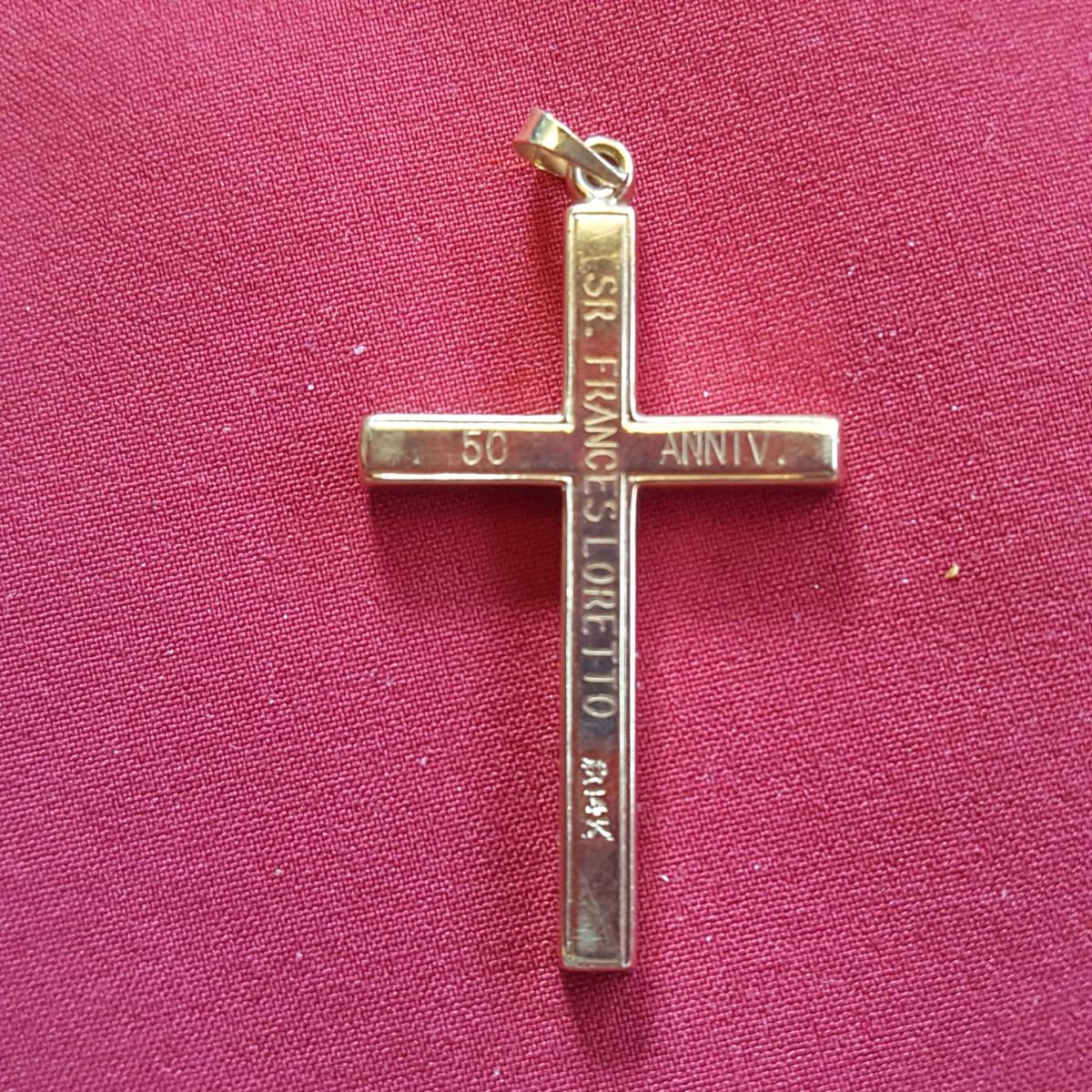 This auction lot is for a Gold Cross Pendant. The cross is personally engraved to mark the 5oth anniversary of a nun's profession of vows. The cross is marked 14K. See photos for sizing. The cross weighs about .048toz.