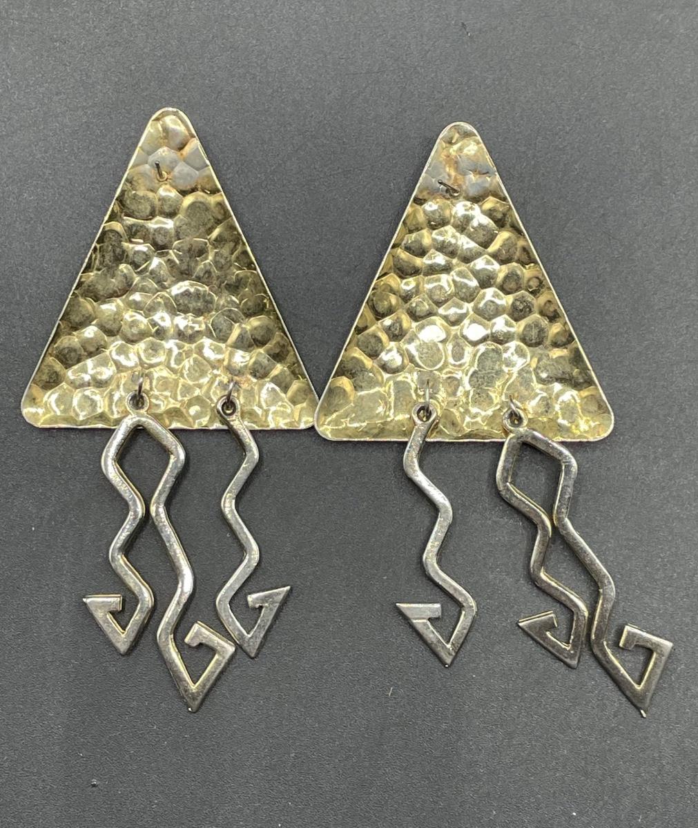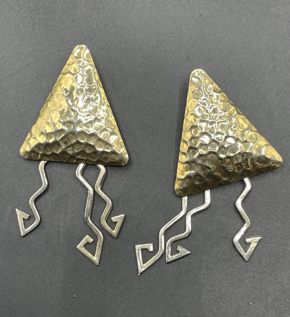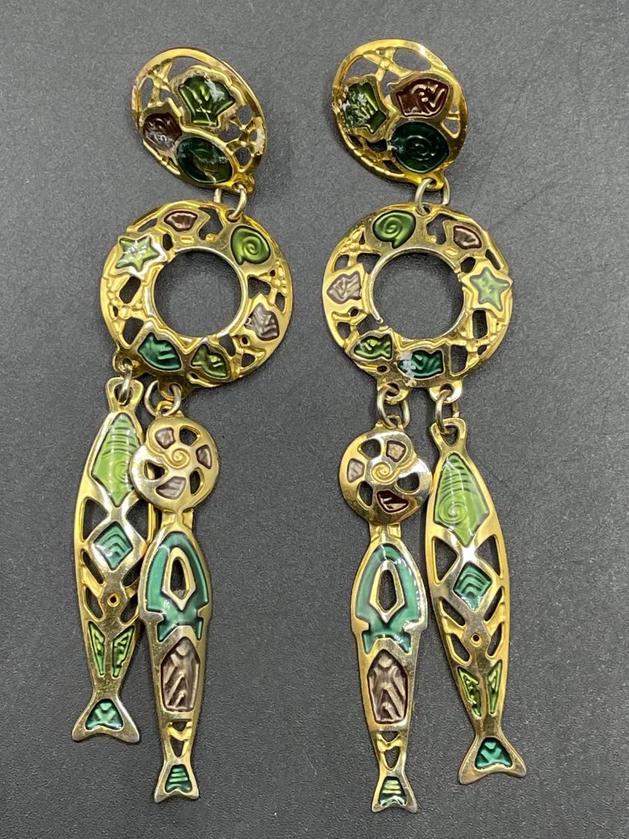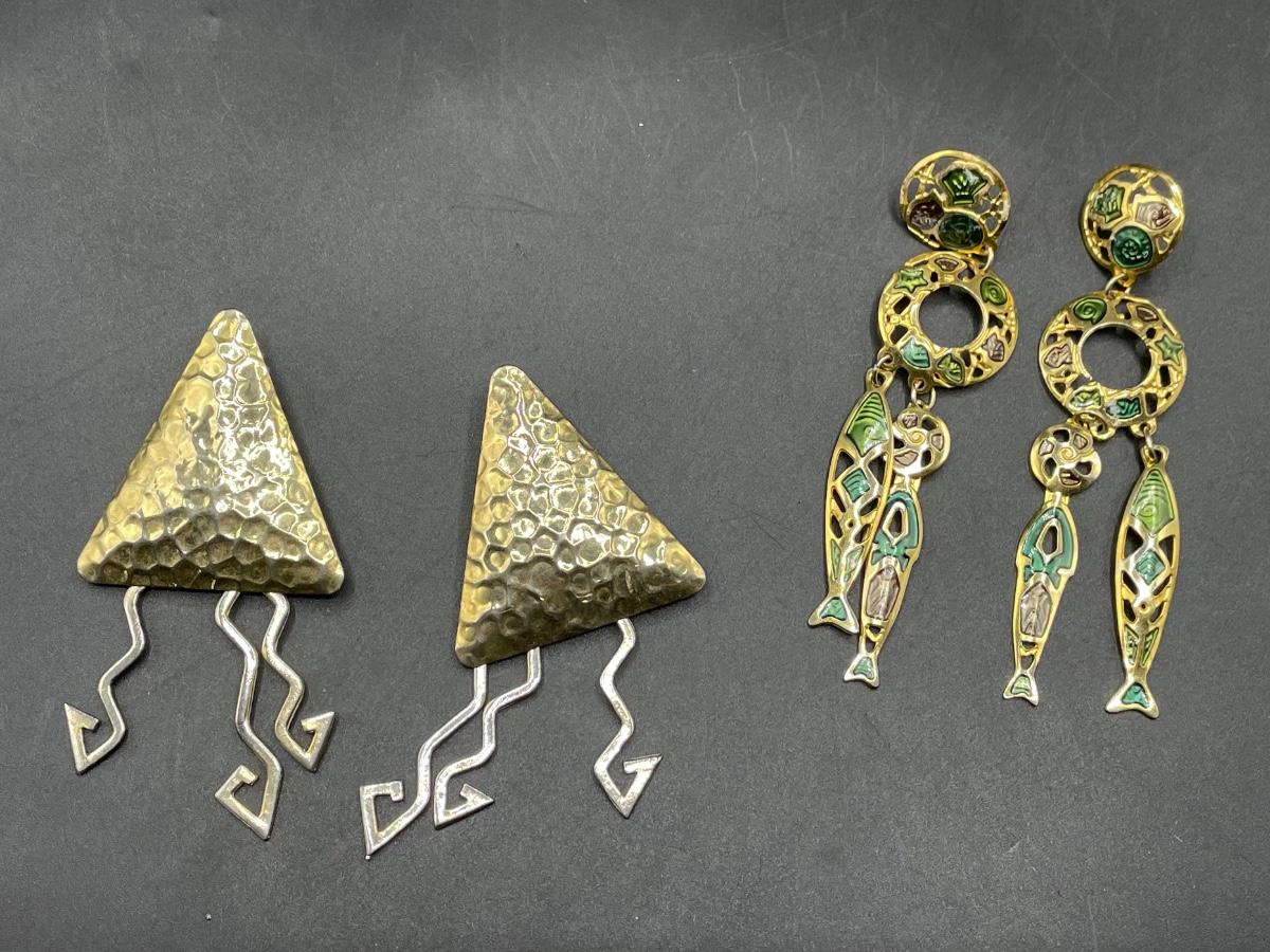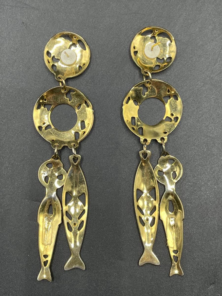 Both earrings are in great condition but neither one have backings on them. The first earring pictured has lightning bolts dangling from it and they are silver. The second pair of earrings are ocean themed and have two fish hanging from them.