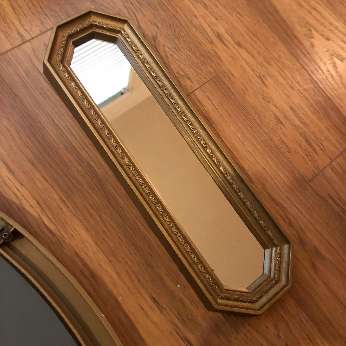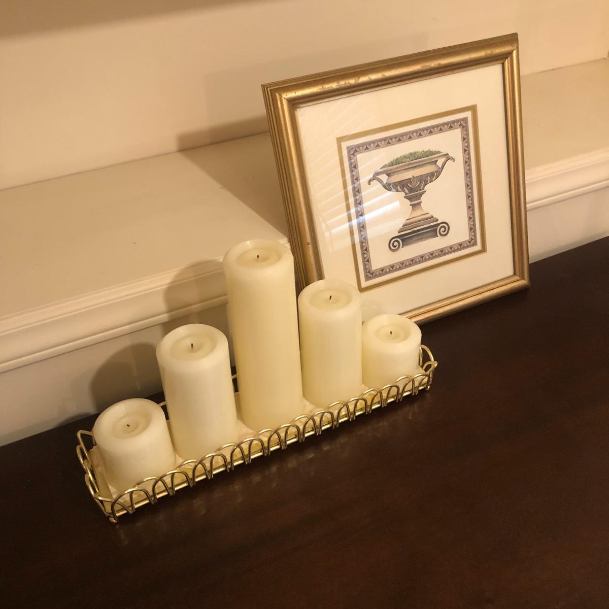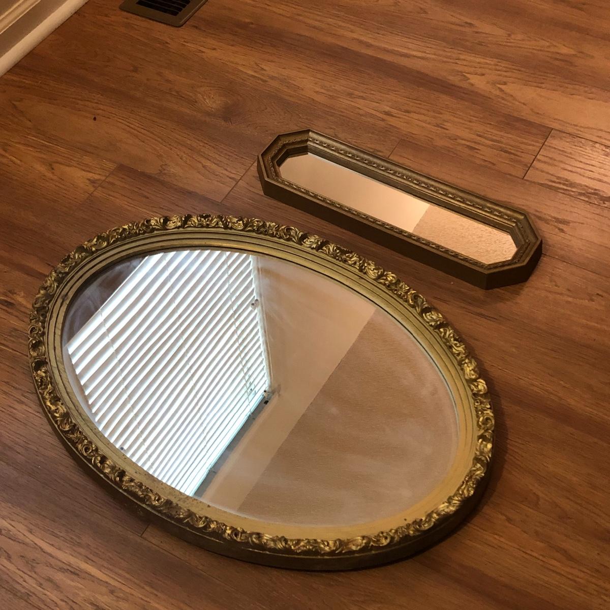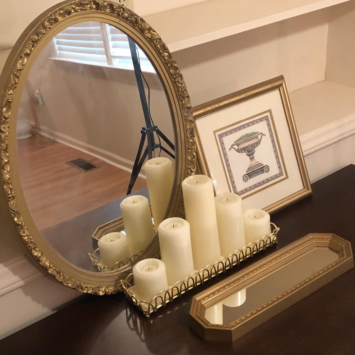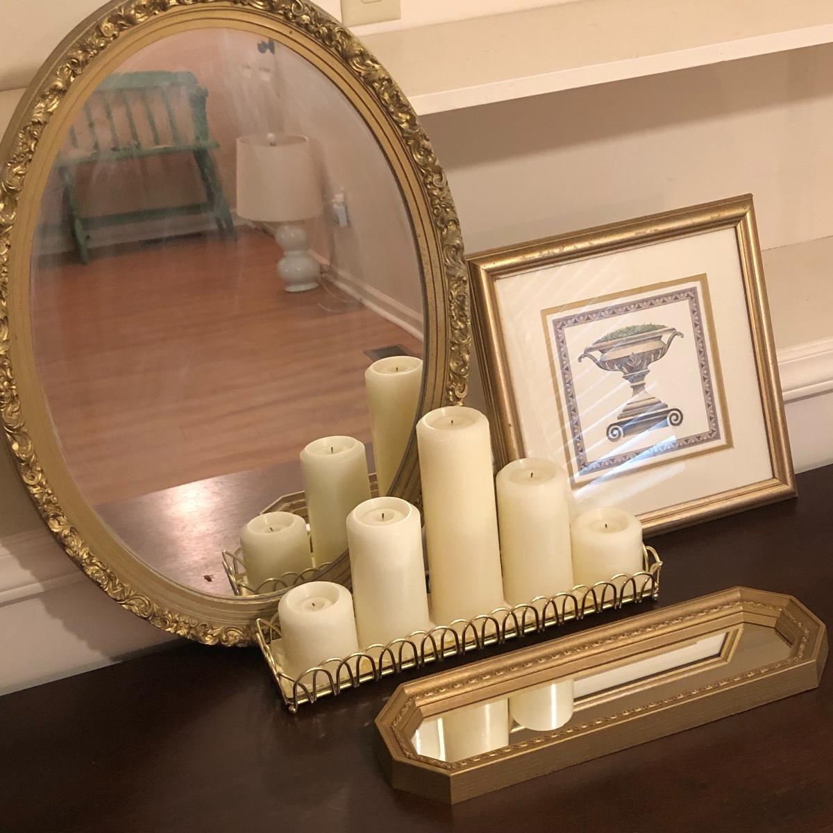 Both mirror frames are plastic; the oval mirror measures 18.5” x 26”. The oval mirror has some faint scratches on the mirror itself. The long mirror is about 5” x 17.5”. The picture frame measures 14” x 14”. The gold tray holding the candles measures 16.5” x 4” and is mirrored. The tallest candle is 9” tall with the shortest one 3”. Local pick up only.