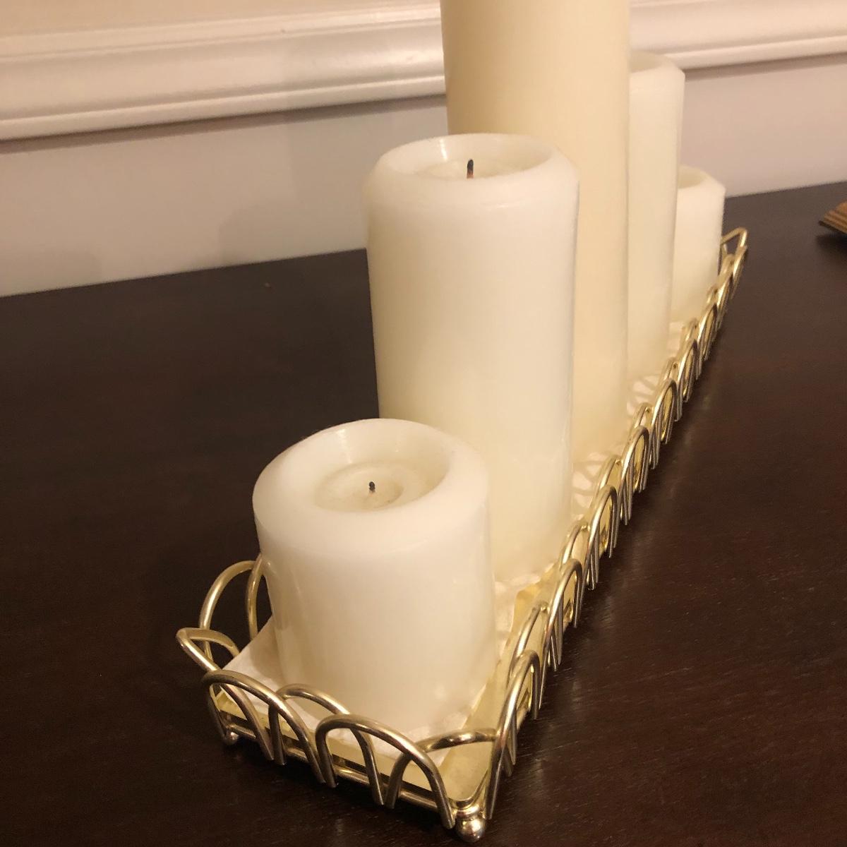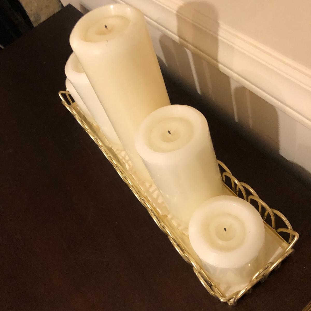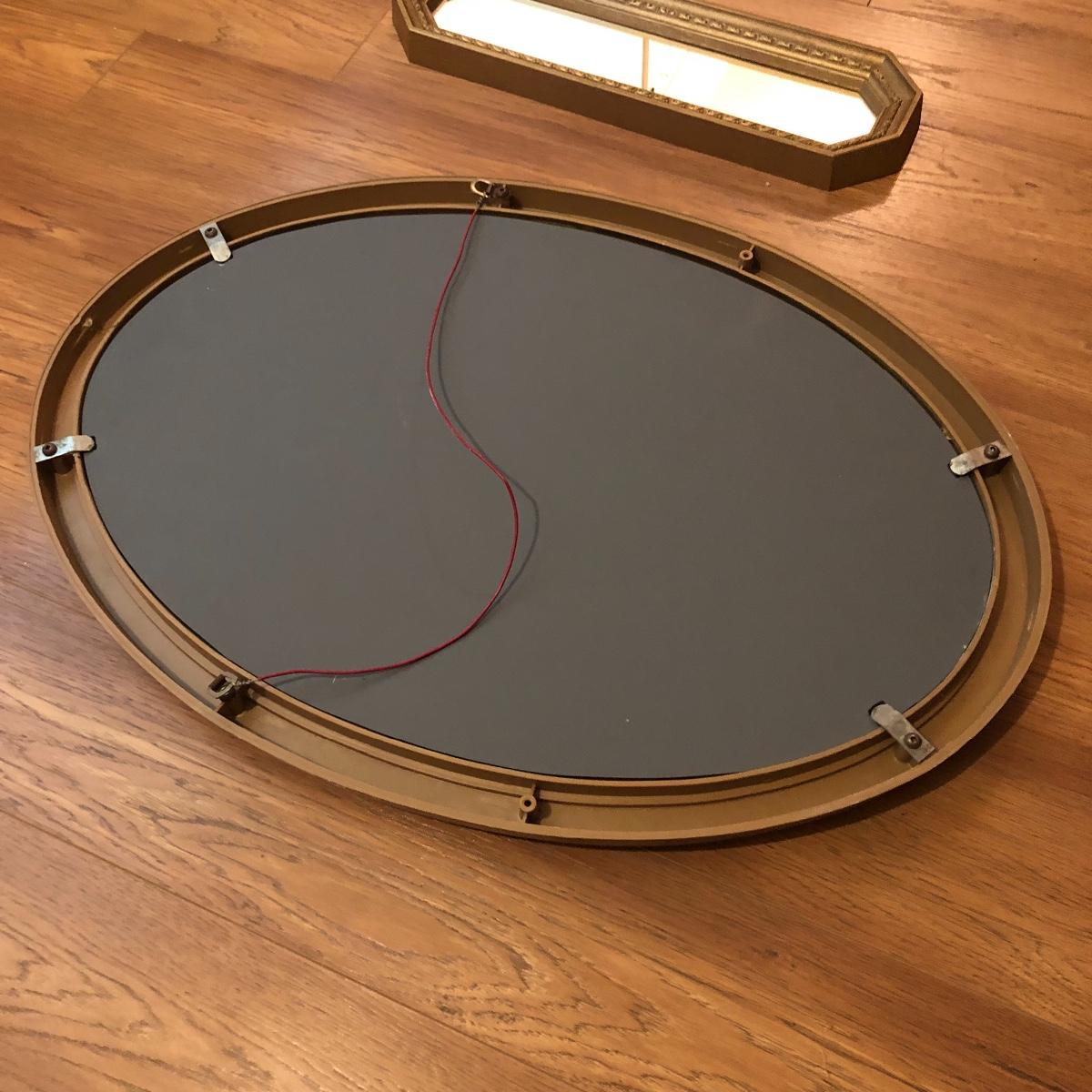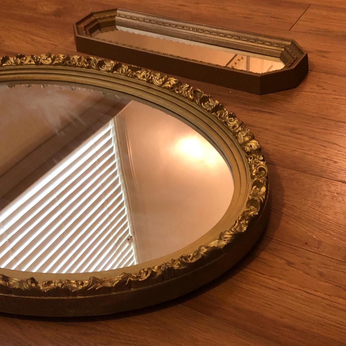 Both mirror frames are plastic; the oval mirror measures 18.5” x 26”. The oval mirror has some faint scratches on the mirror itself. The long mirror is about 5” x 17.5”. The picture frame measures 14” x 14”. The gold tray holding the candles measures 16.5” x 4” and is mirrored. The tallest candle is 9” tall with the shortest one 3”. Local pick up only.