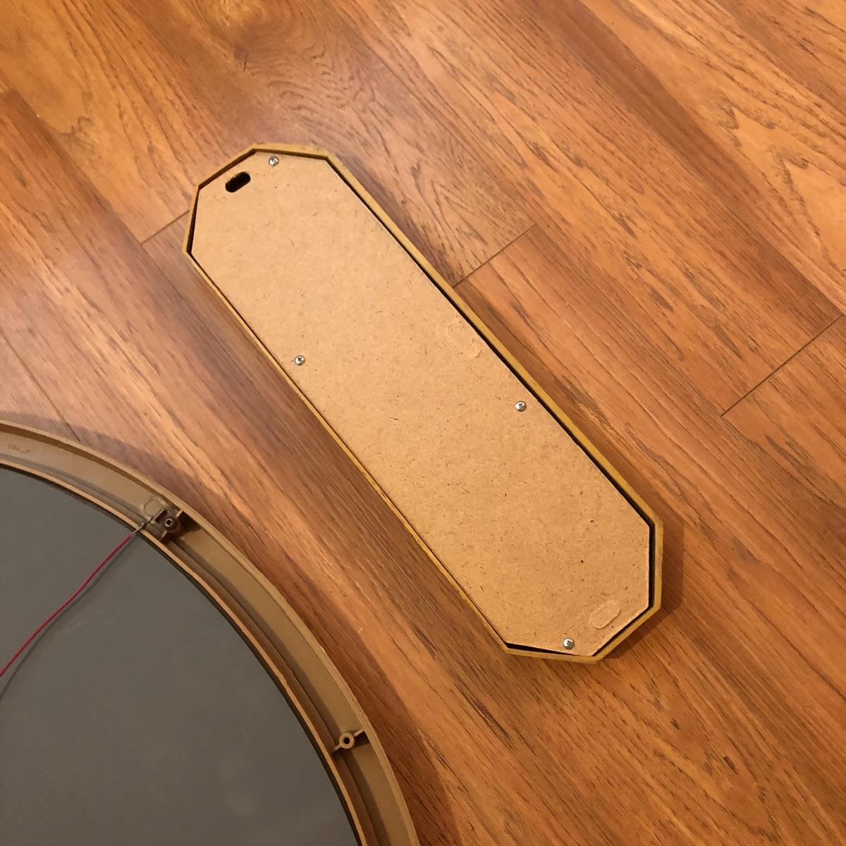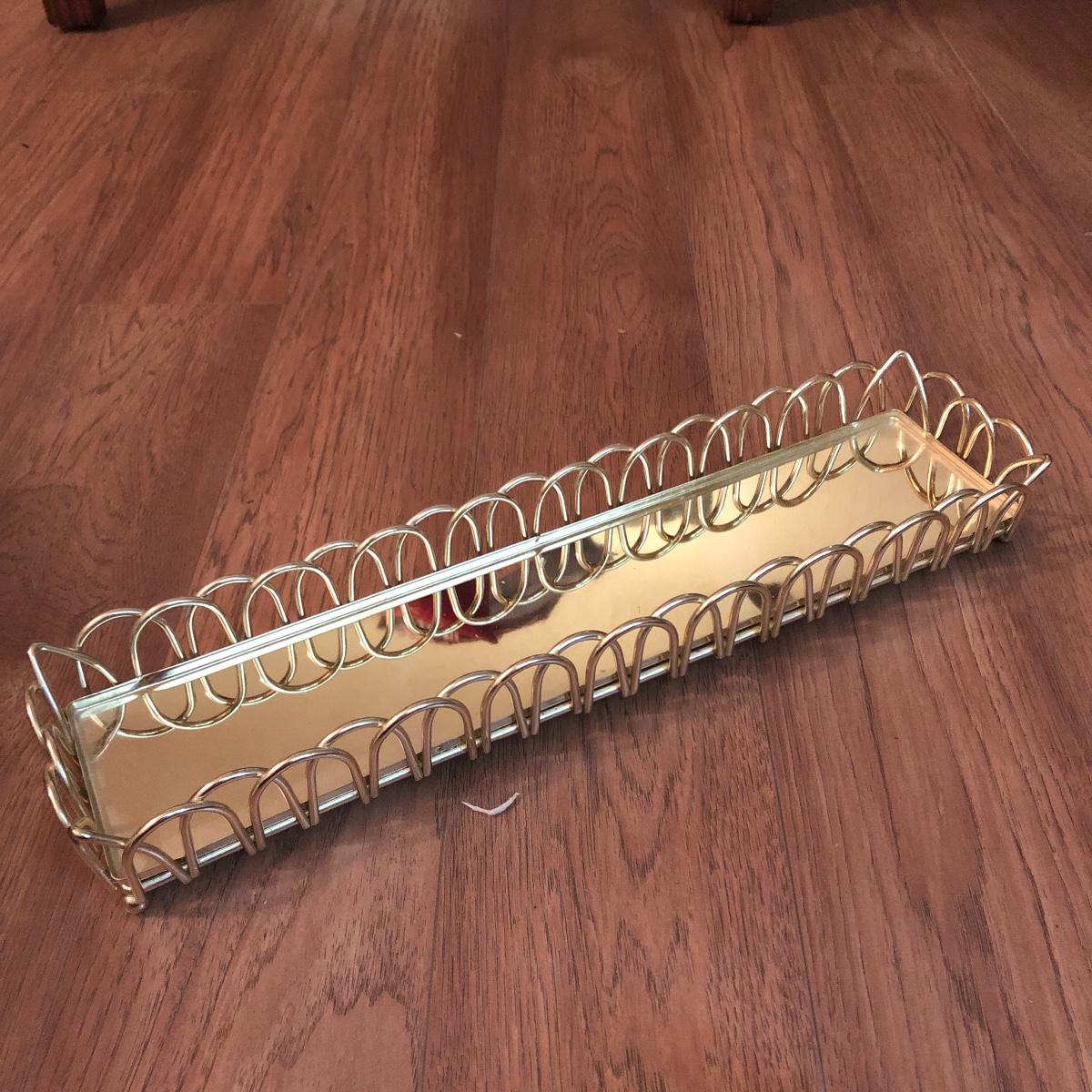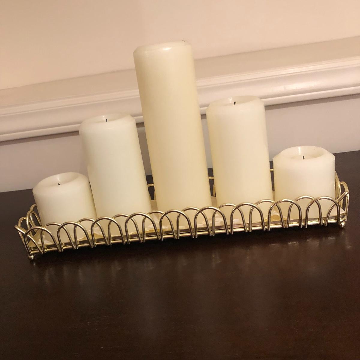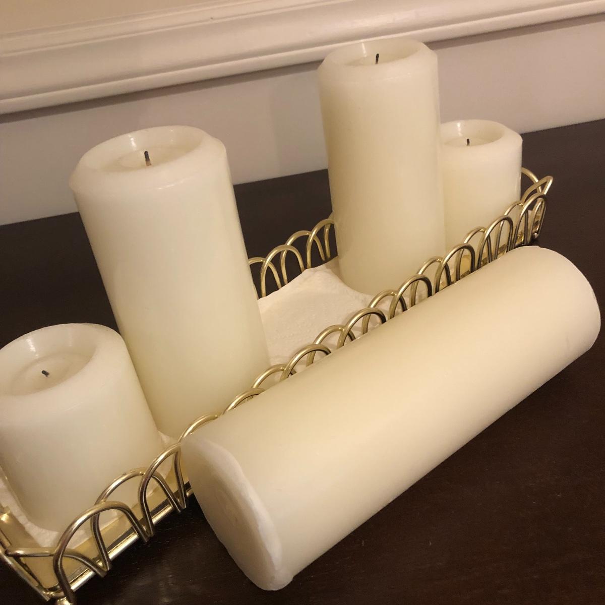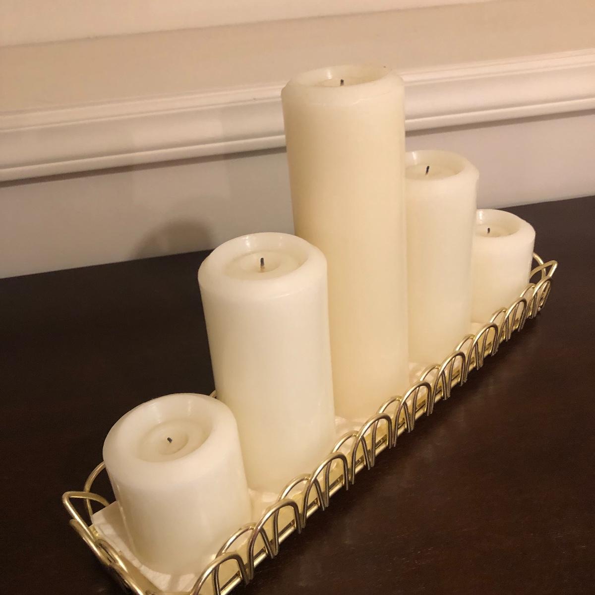 Both mirror frames are plastic; the oval mirror measures 18.5” x 26”. The oval mirror has some faint scratches on the mirror itself. The long mirror is about 5” x 17.5”. The picture frame measures 14” x 14”. The gold tray holding the candles measures 16.5” x 4” and is mirrored. The tallest candle is 9” tall with the shortest one 3”. Local pick up only.