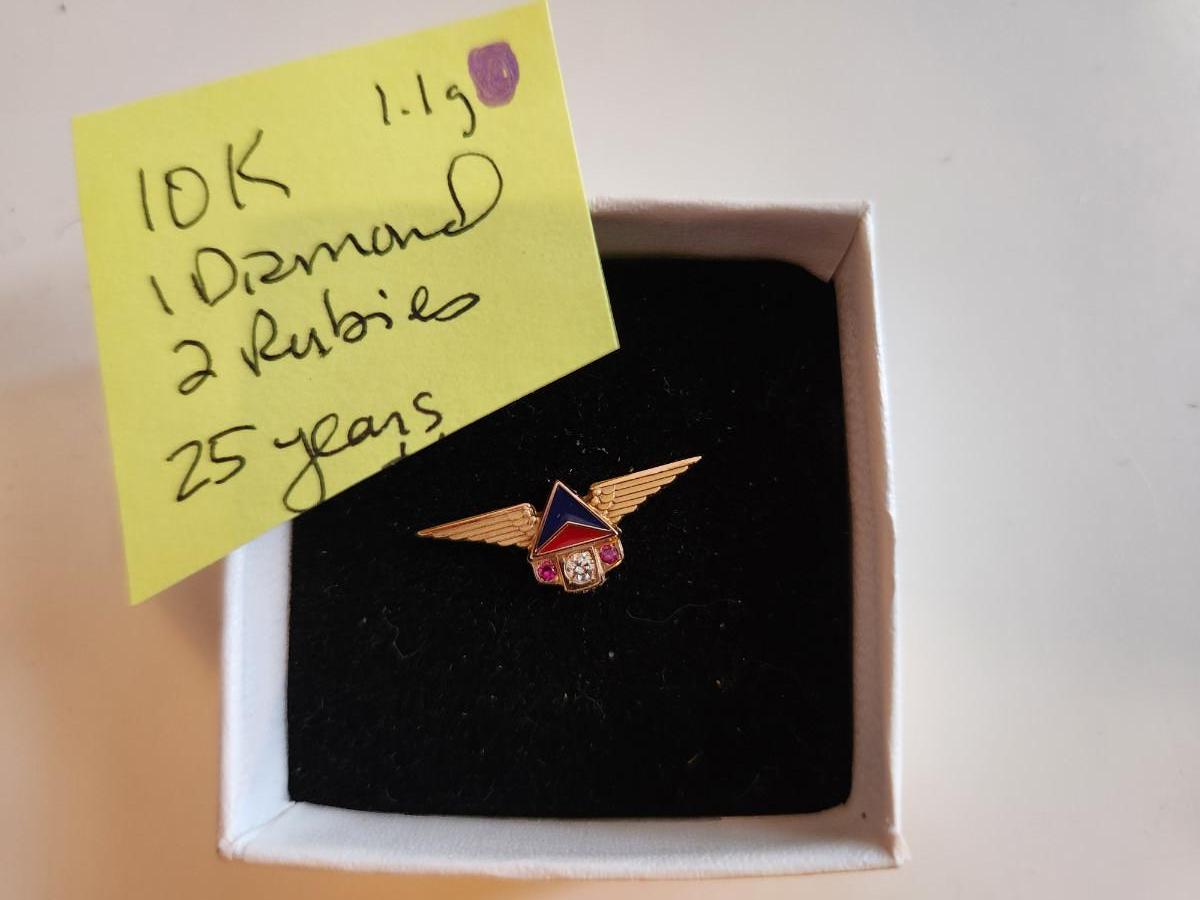 This auction lot is for a Gold Delta Airlines 25 Year Service Pin. This pin is marked 10K and contains a small diamond and 2 rubies. Comes with original box.