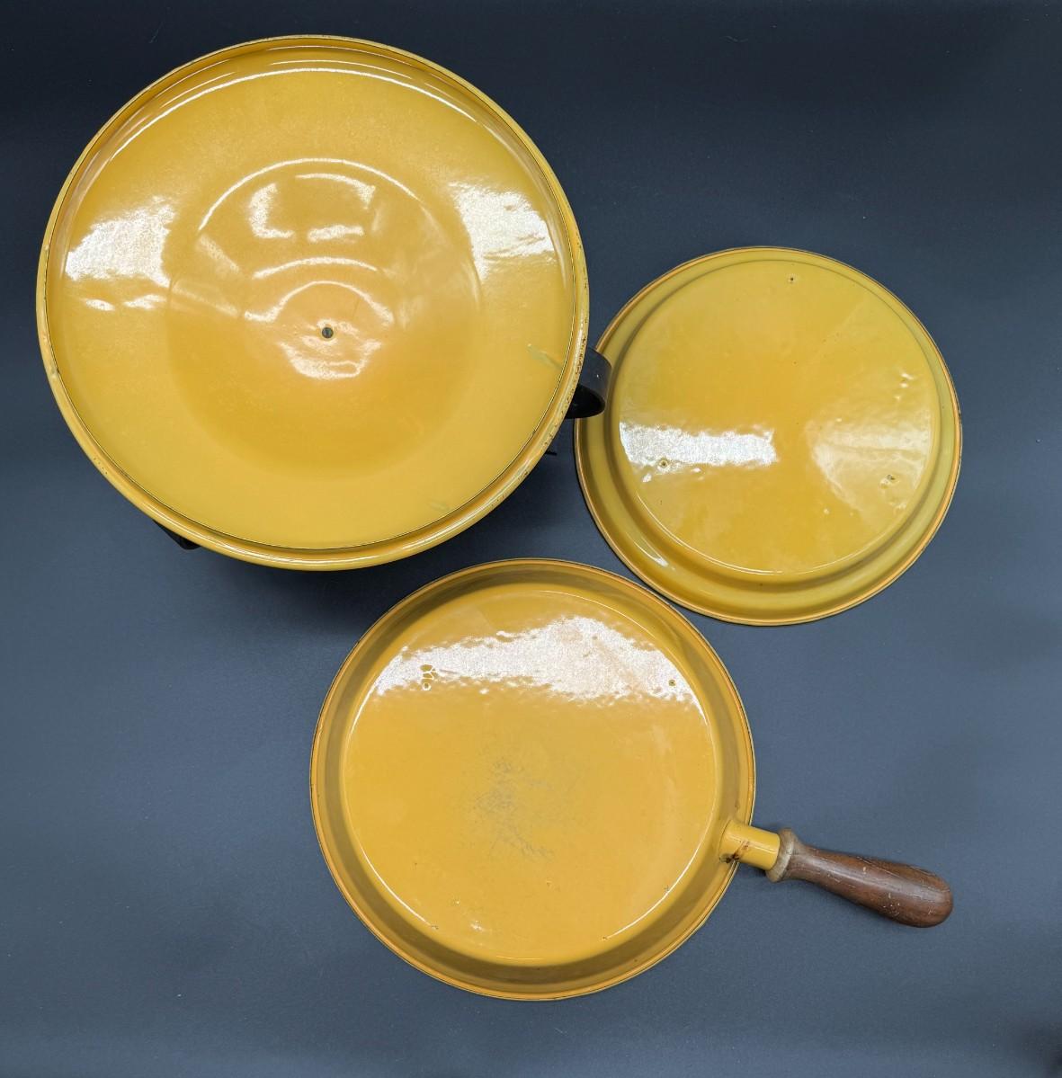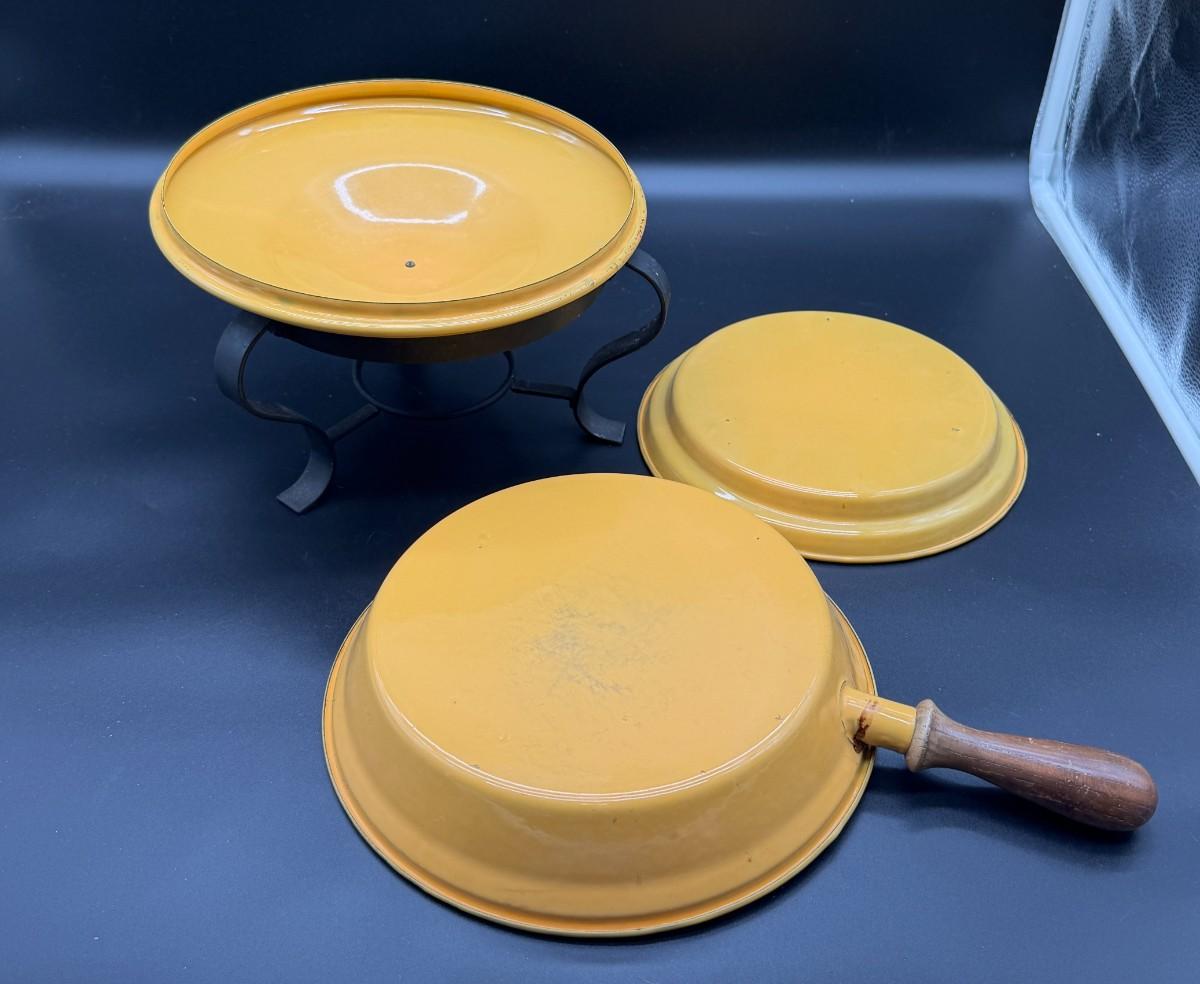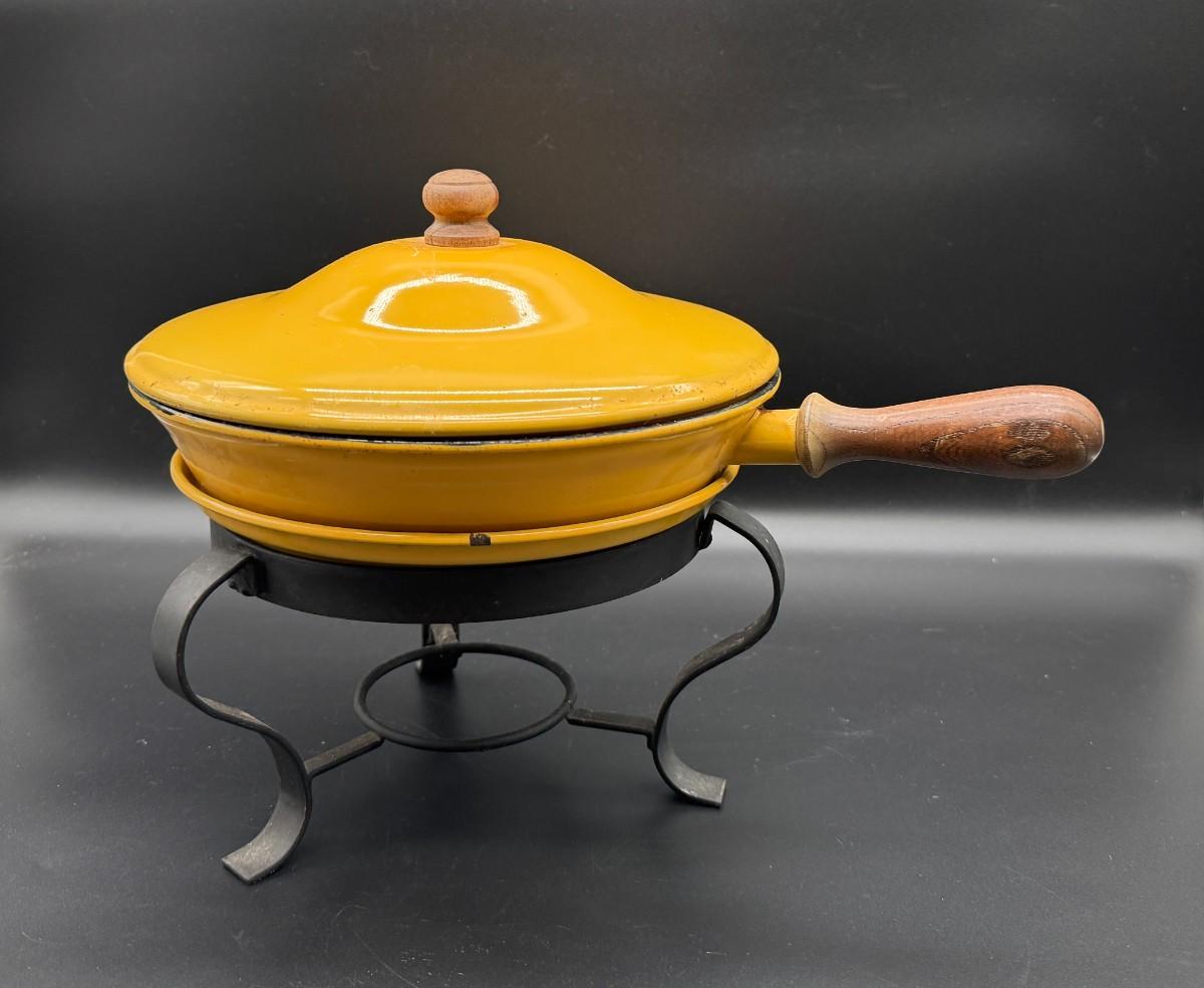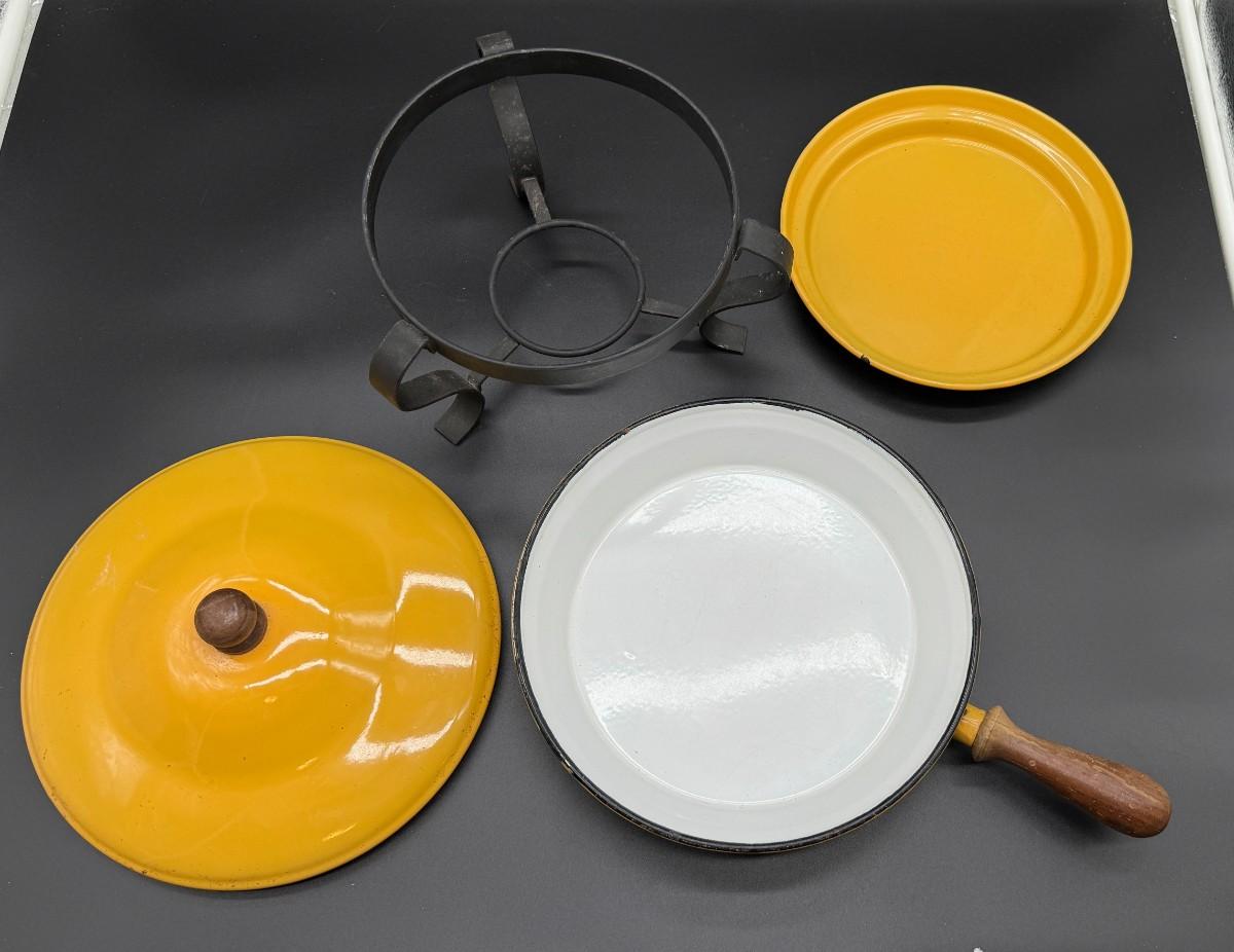 Iron Base, Wooden Handle and Knob, Porcelain Enamelware Underplate, Pot and Lid