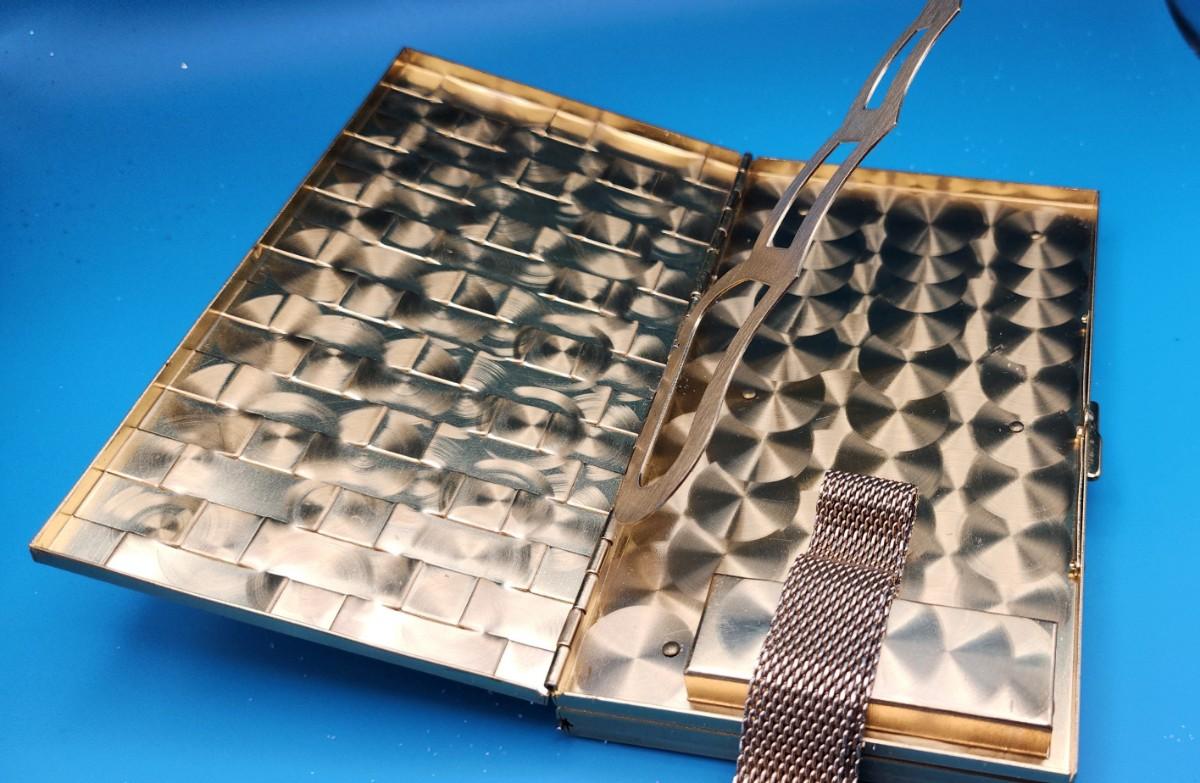 From the 1940s, this is a statement piece. 2 compartments hold a mirror, a comb, powder and puff compartment (unused), lipstick wand ( empty). THe second compartment is for cards and or cash. 5.5 inches by 3.5 inches by 3/4 inches wide. Retails between $300 and $575. Very nice condition.