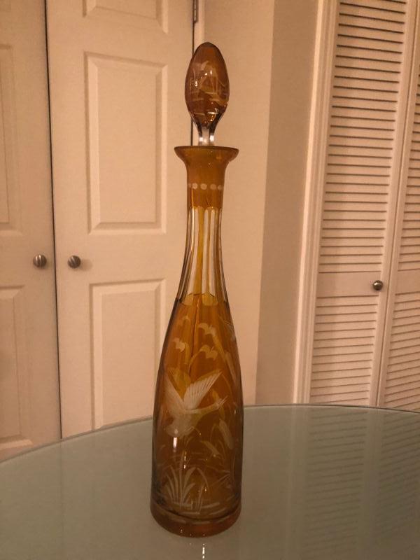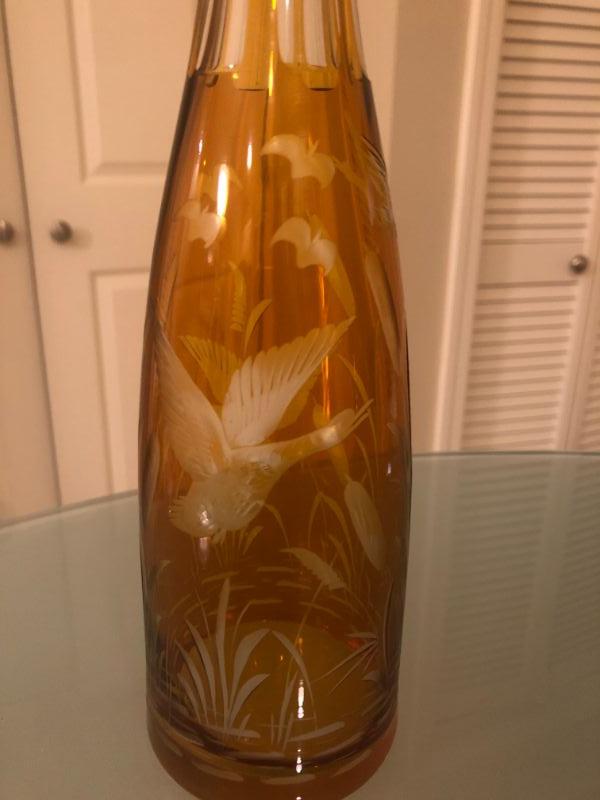 Amazing Etched Gold Etched Glass Decanter With Ducks and Cattails.
