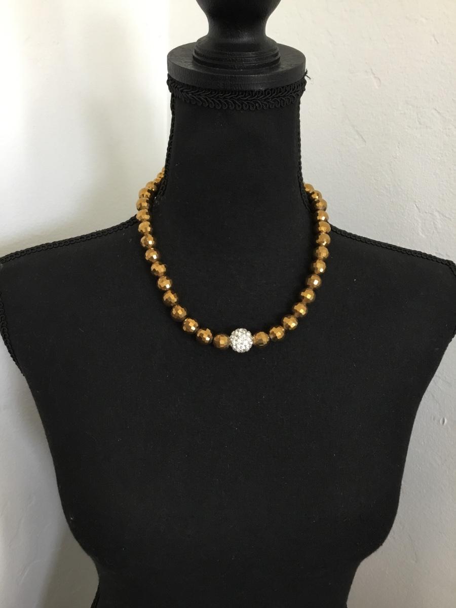 Gold faceted, glass bead, crystal rhinestone, bead statement, necklace