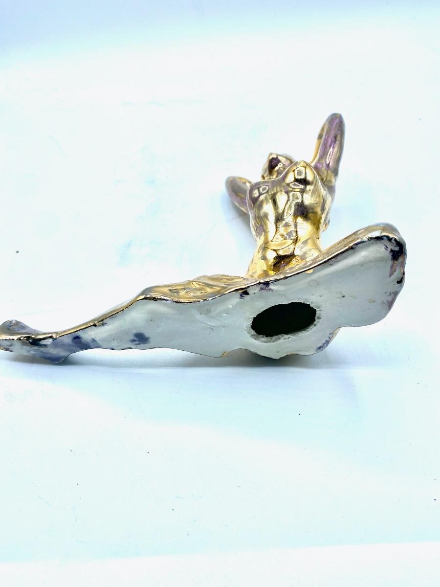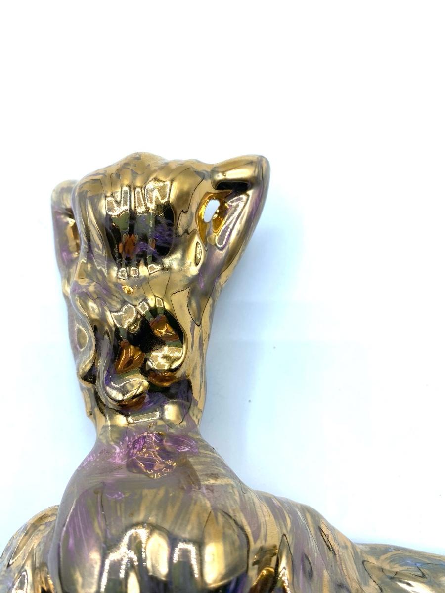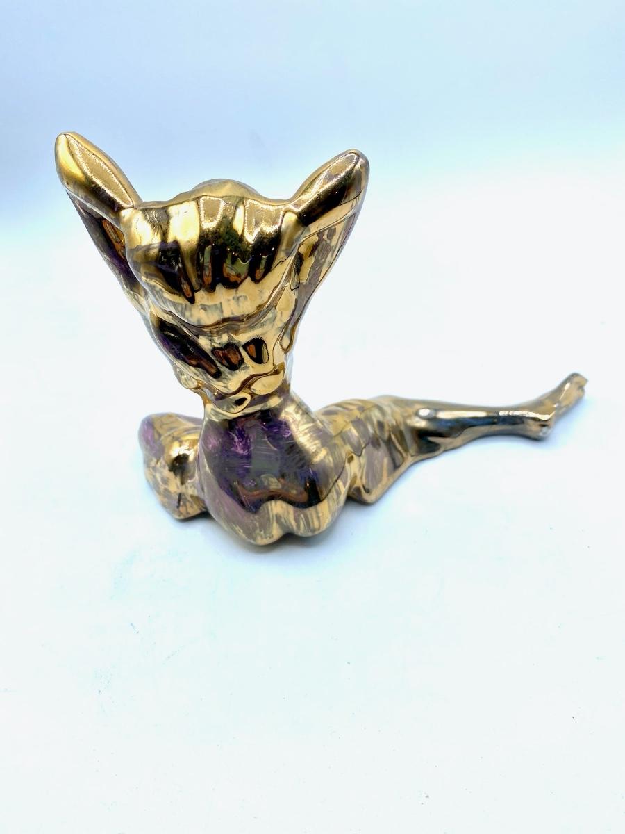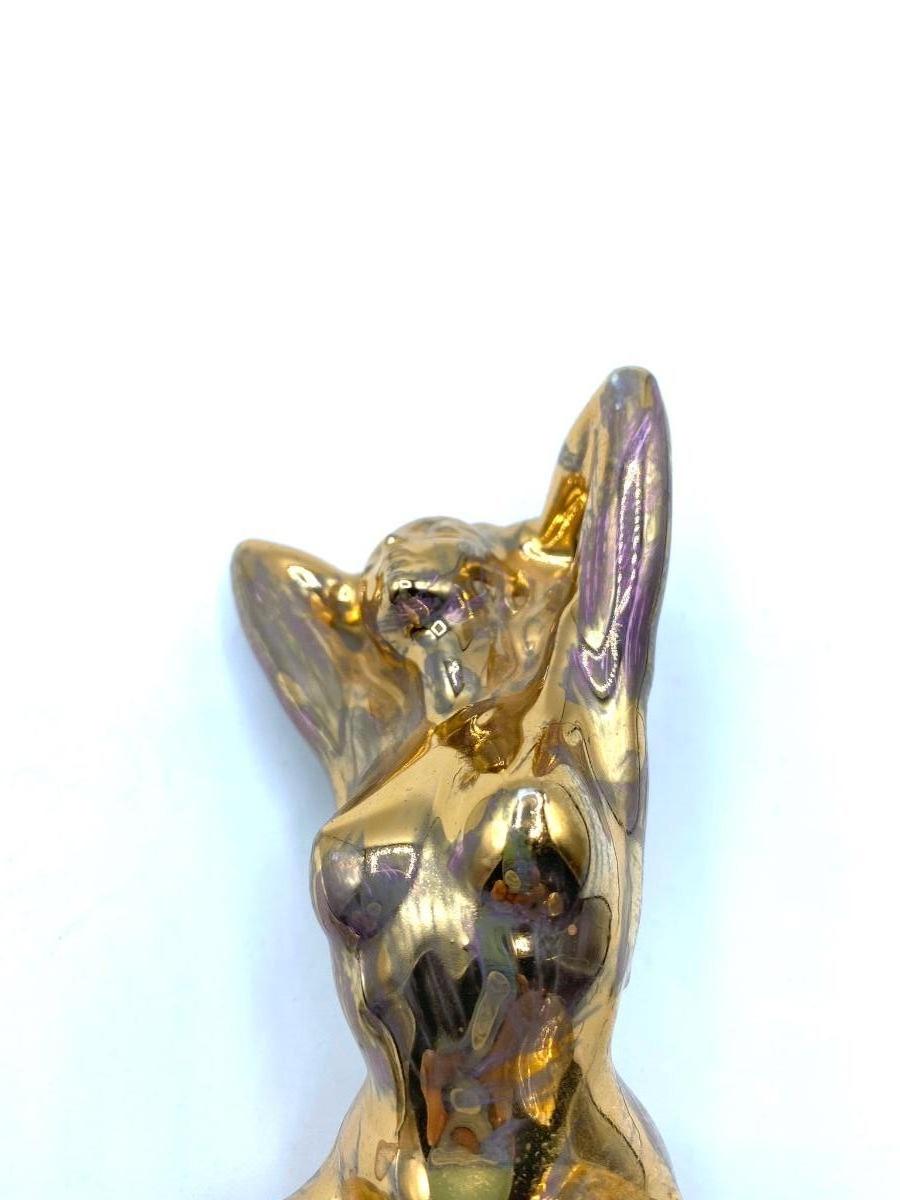 Rare figural sculpture of woman with gold finish, adds both glam and modernity of any grouping of figures. Has iridescent sheen with purple hues in light. The over all impression is very good, no scratches or chips, looks new, 7" X 5"