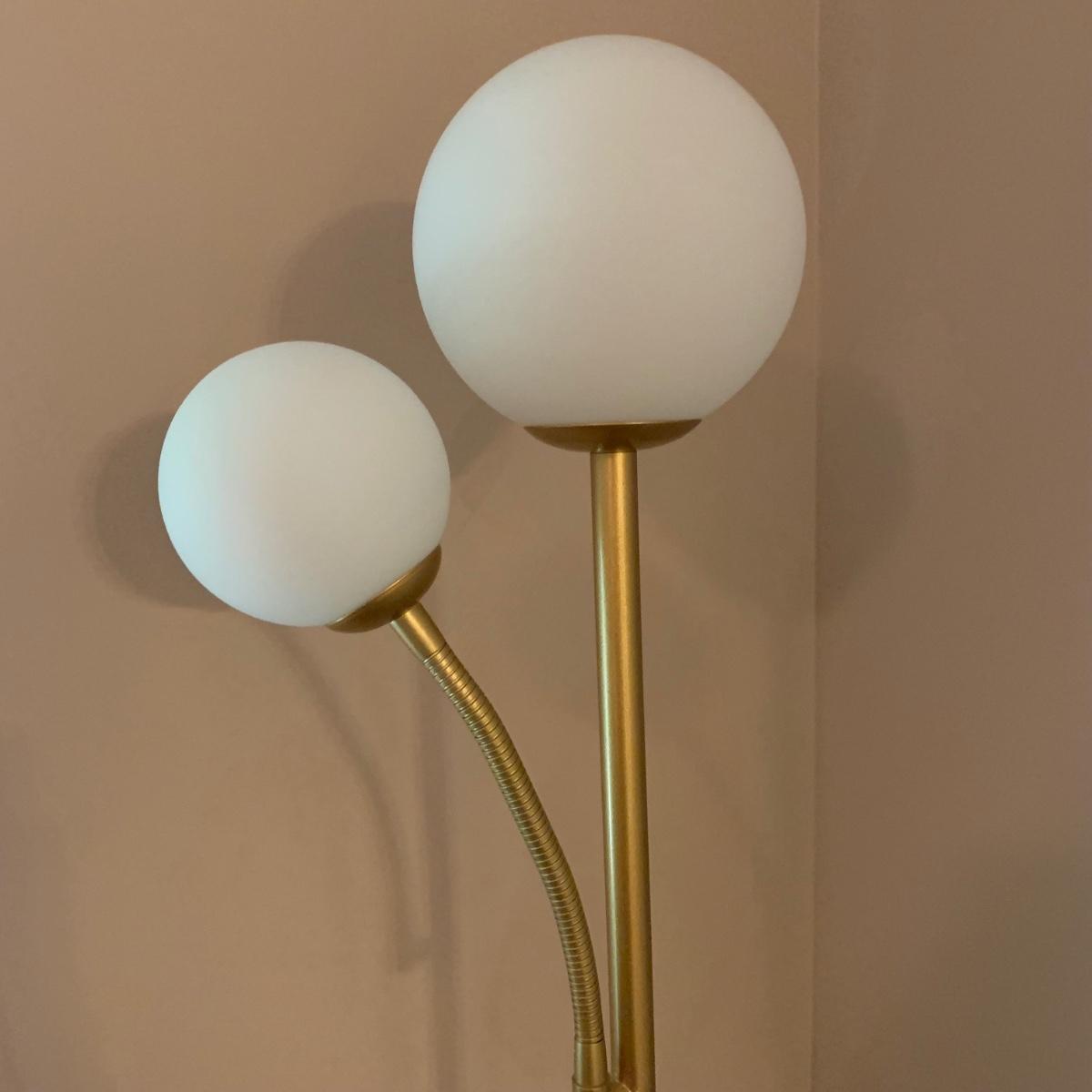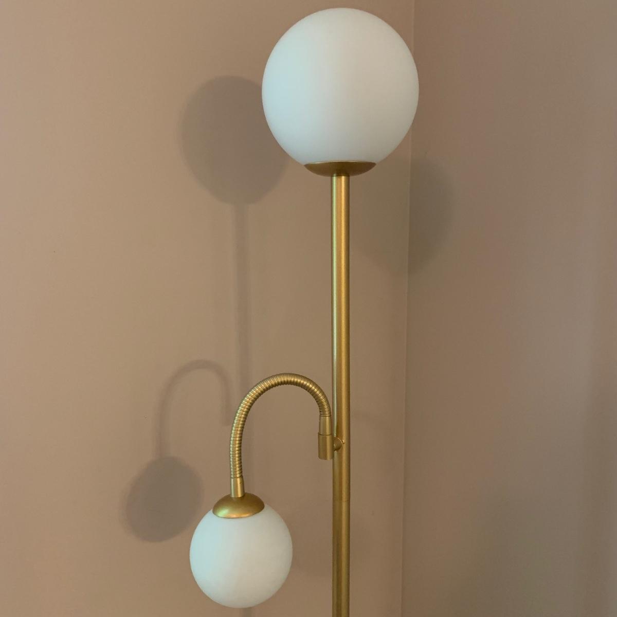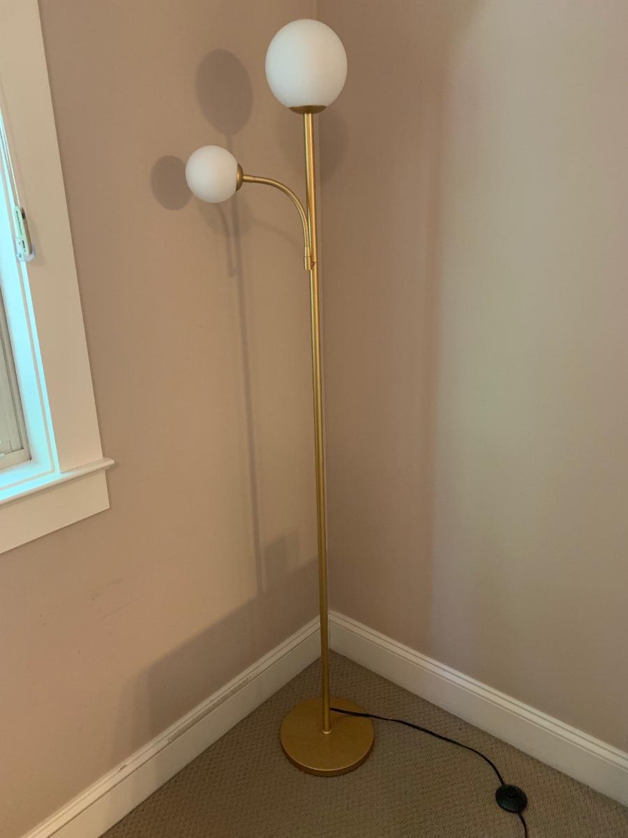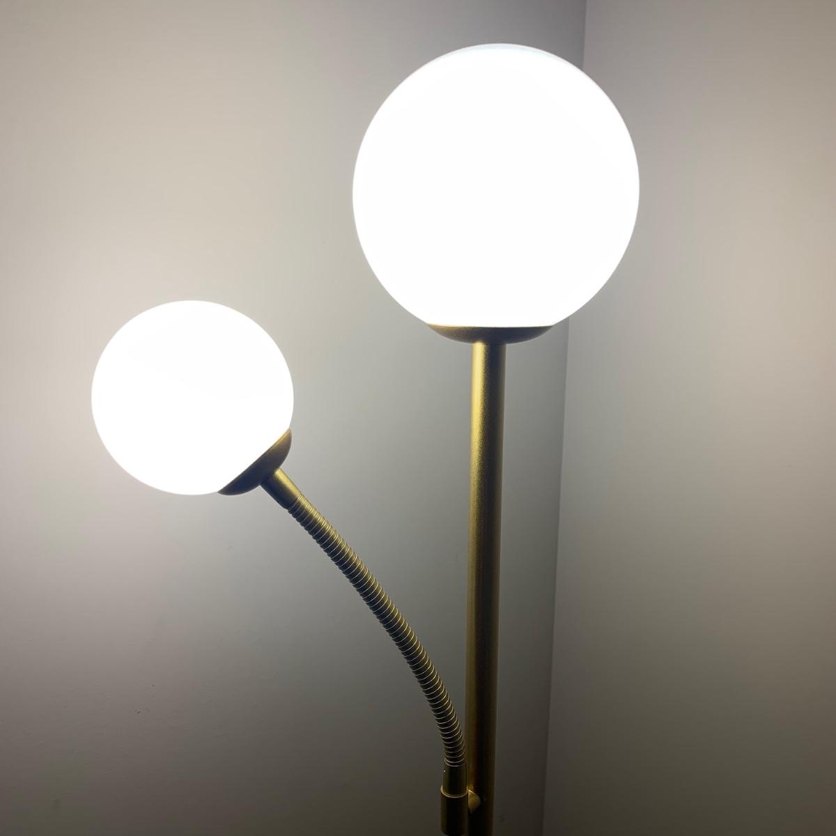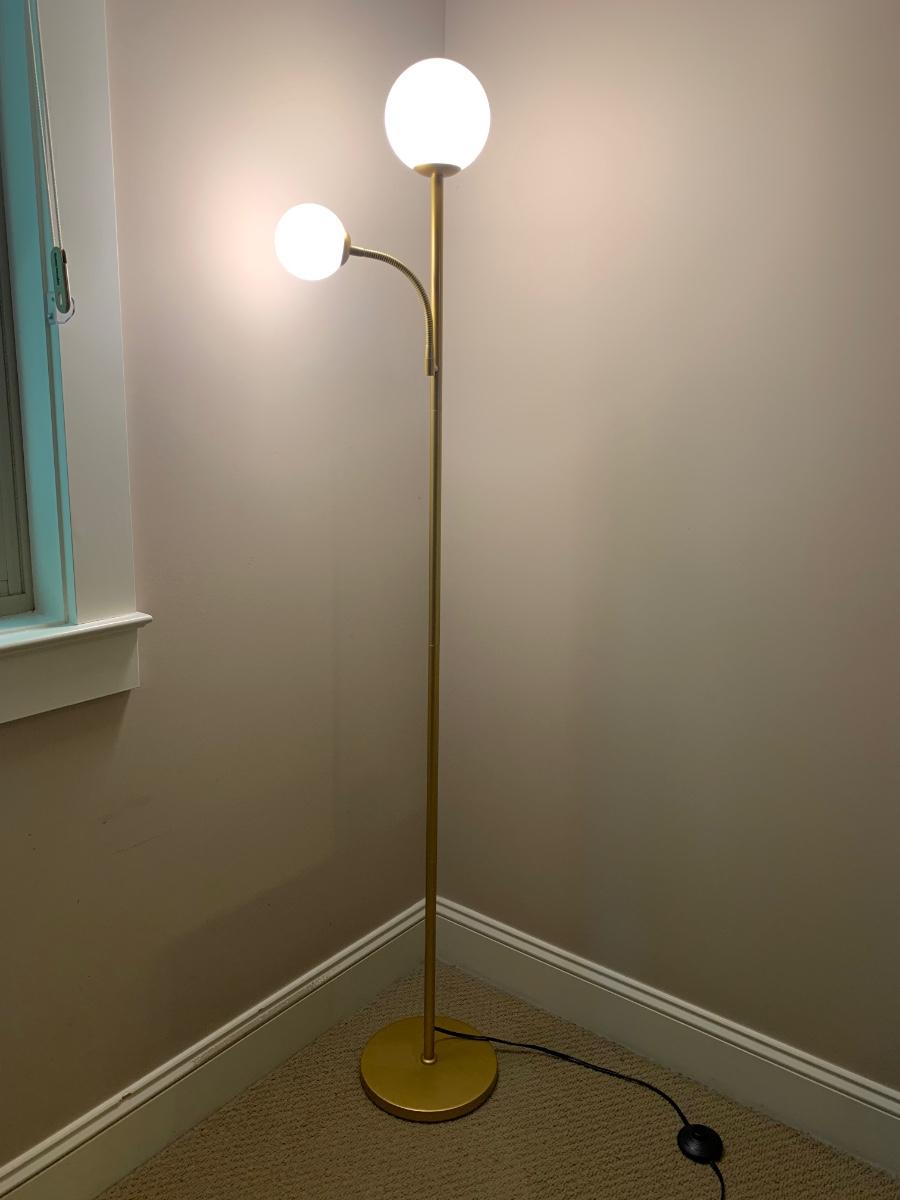 Floor lamp has a gold colored metal base and body. It holds two orb-shaped shades, one of which is on a bendable arm. Lamp has a foot/floor on/off switch and powered on when plugged in. Base is 9.5”D and lamp is 64”H.