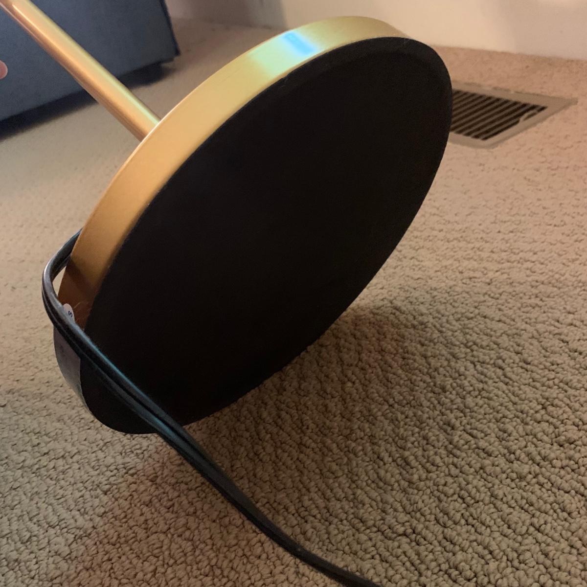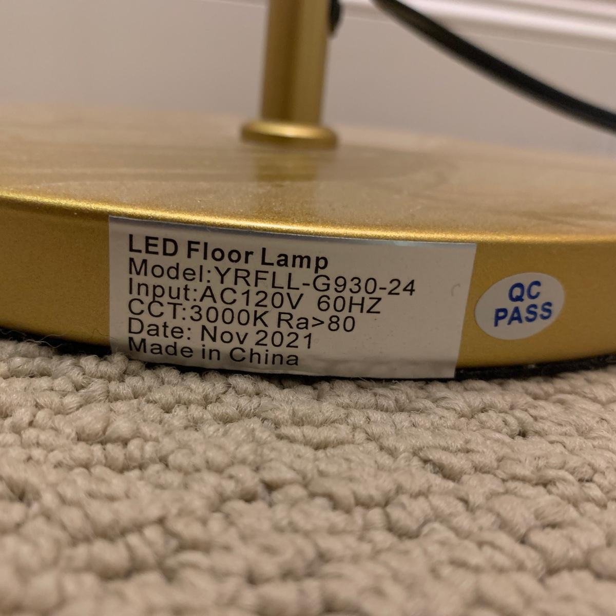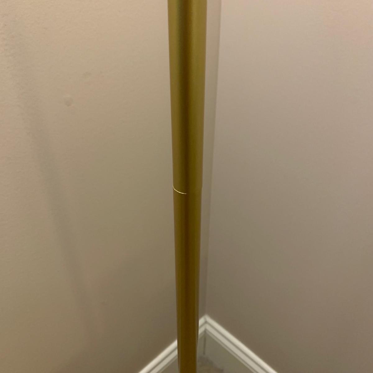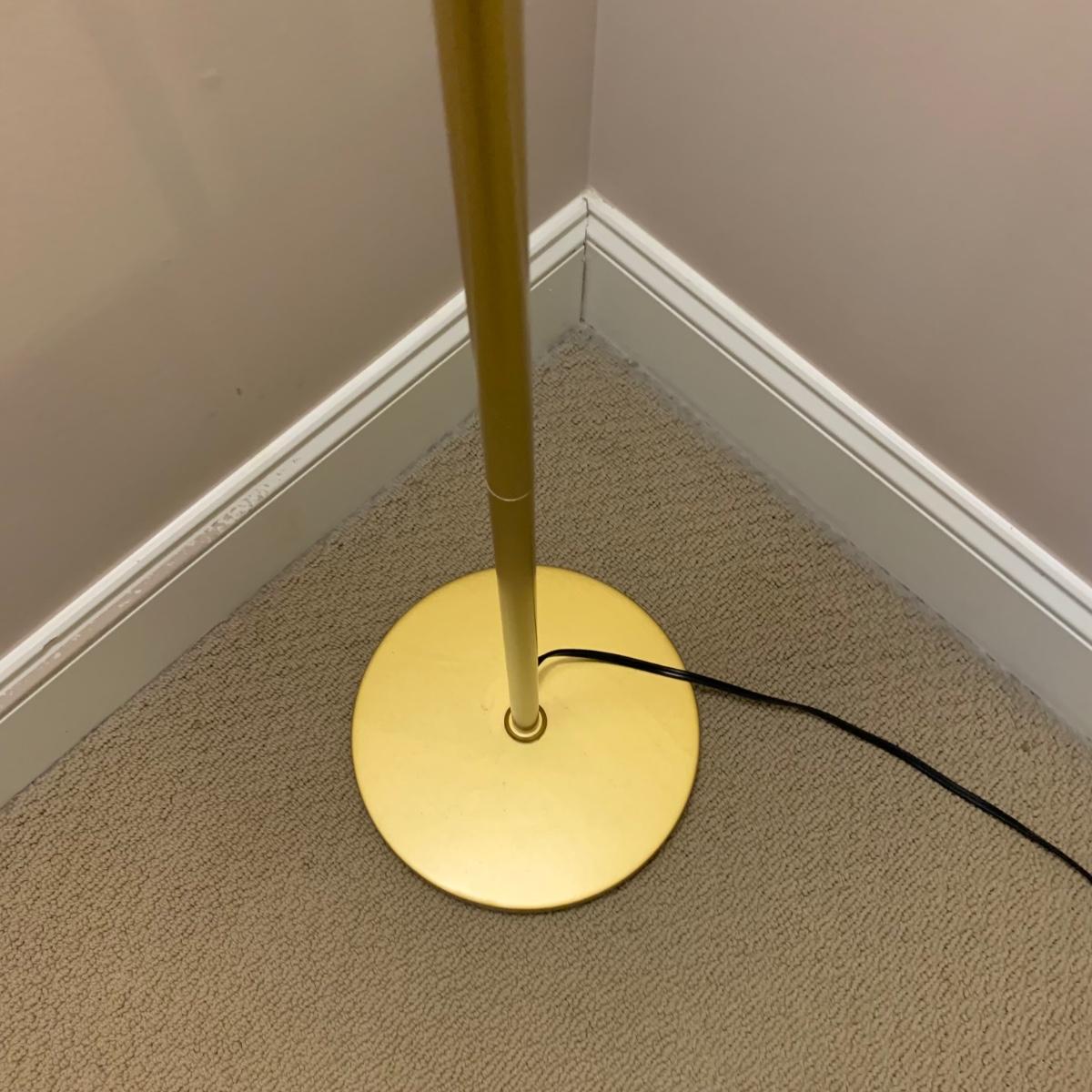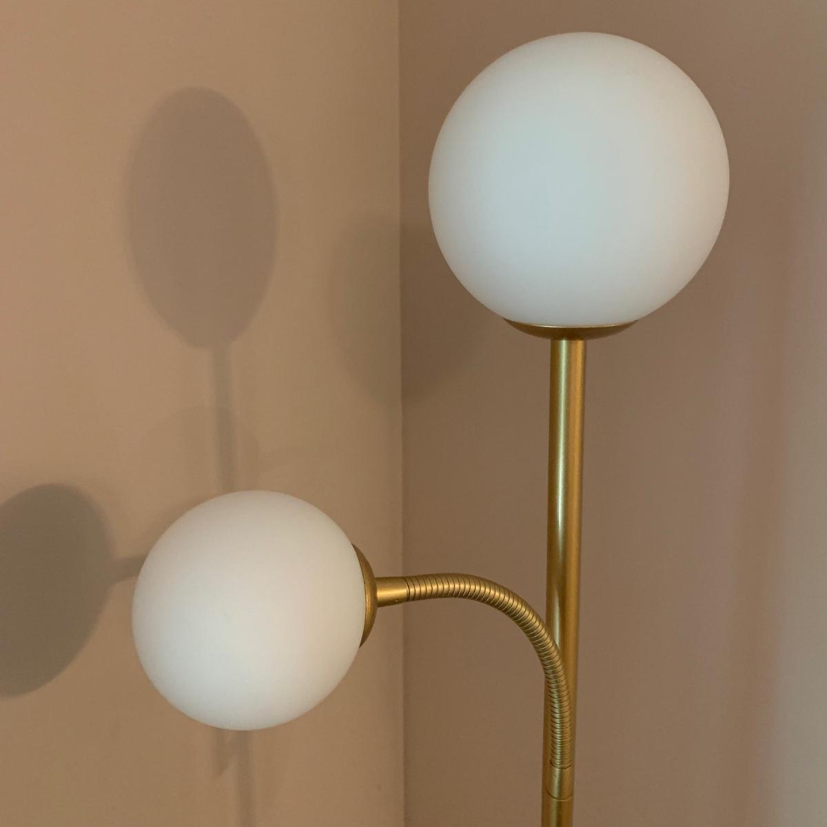 Floor lamp has a gold colored metal base and body. It holds two orb-shaped shades, one of which is on a bendable arm. Lamp has a foot/floor on/off switch and powered on when plugged in. Base is 9.5”D and lamp is 64”H.