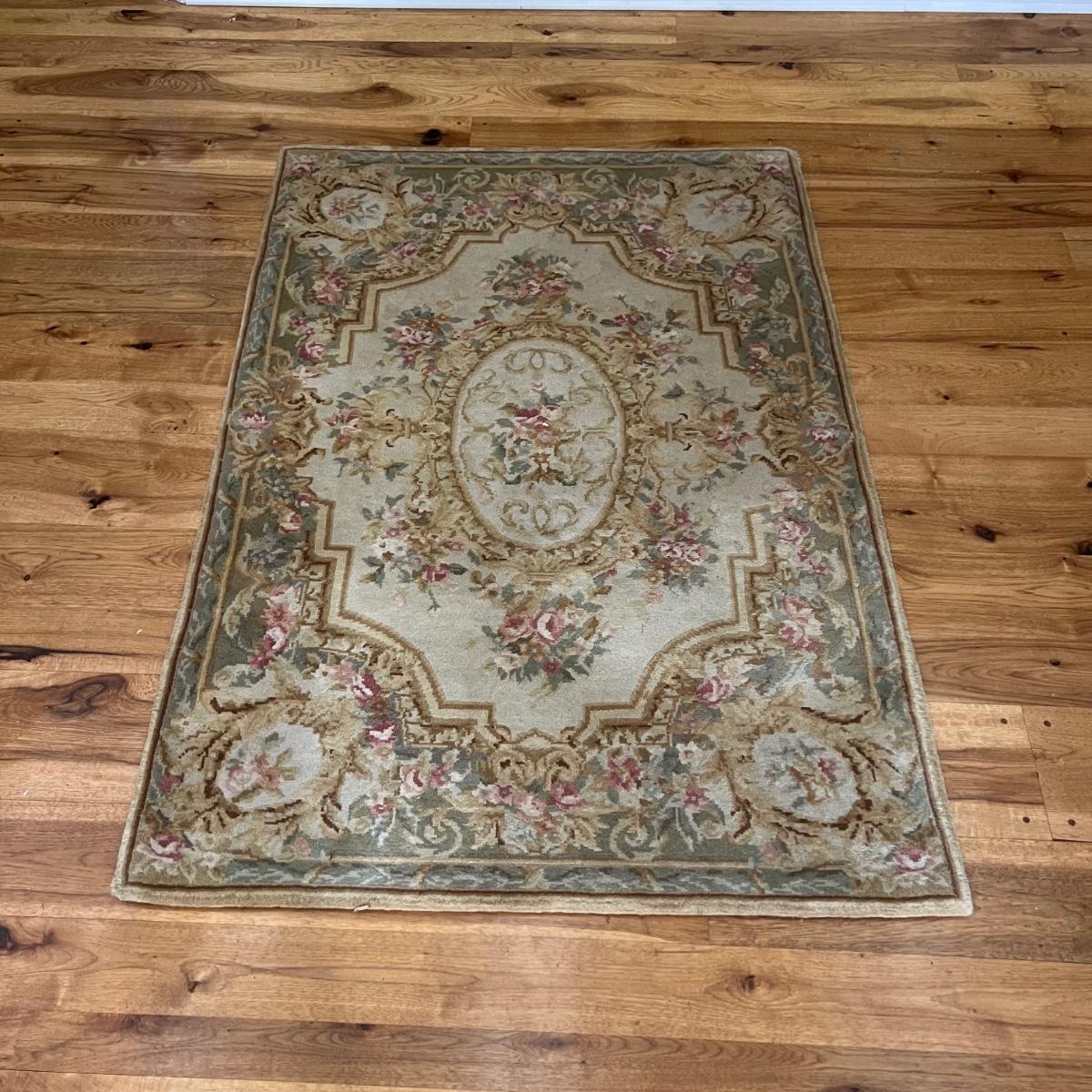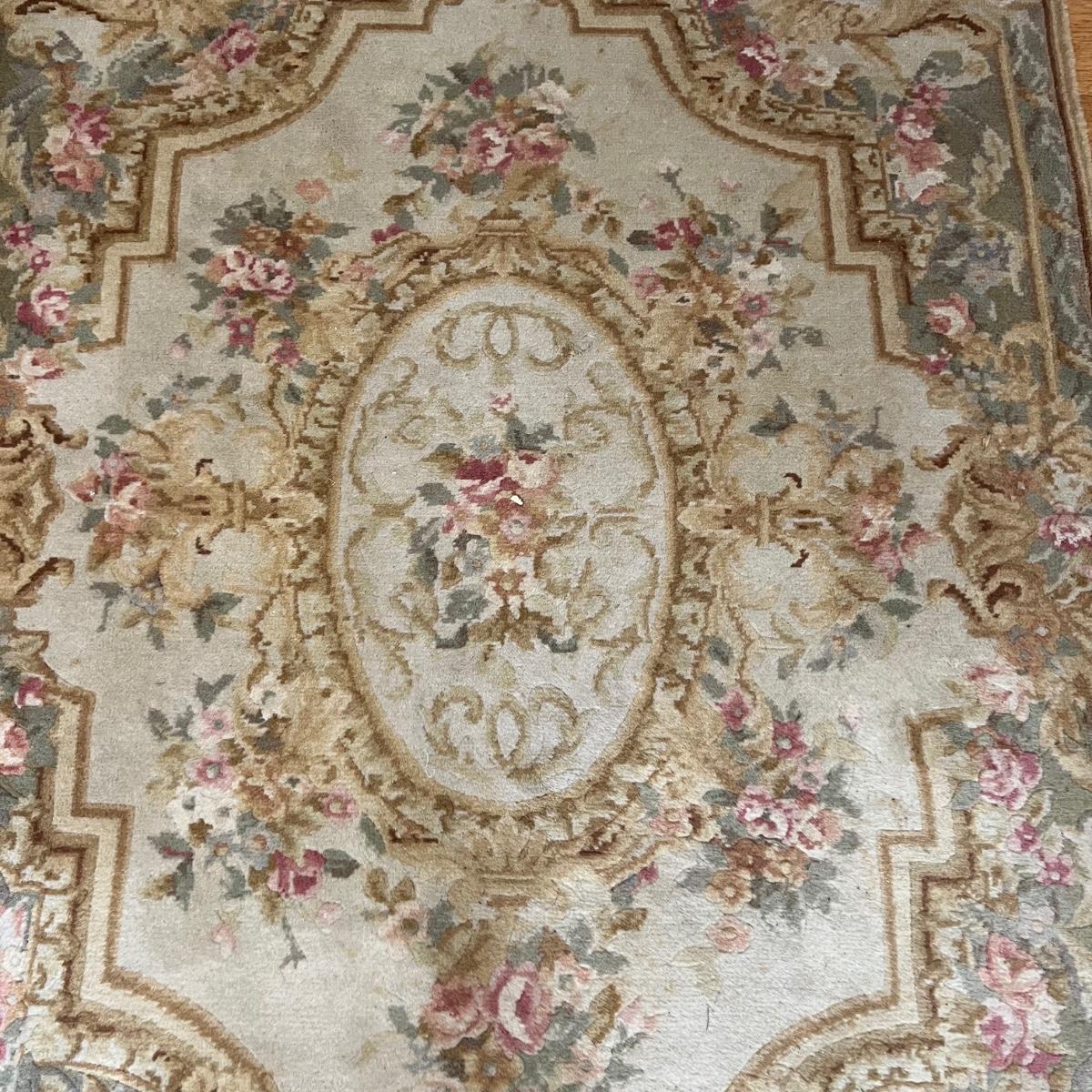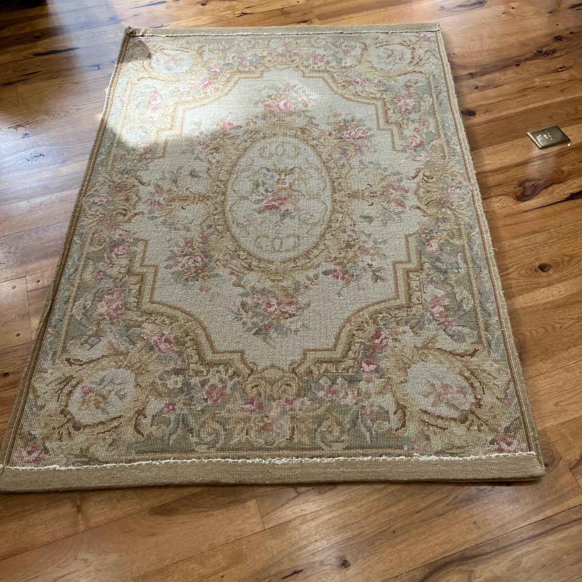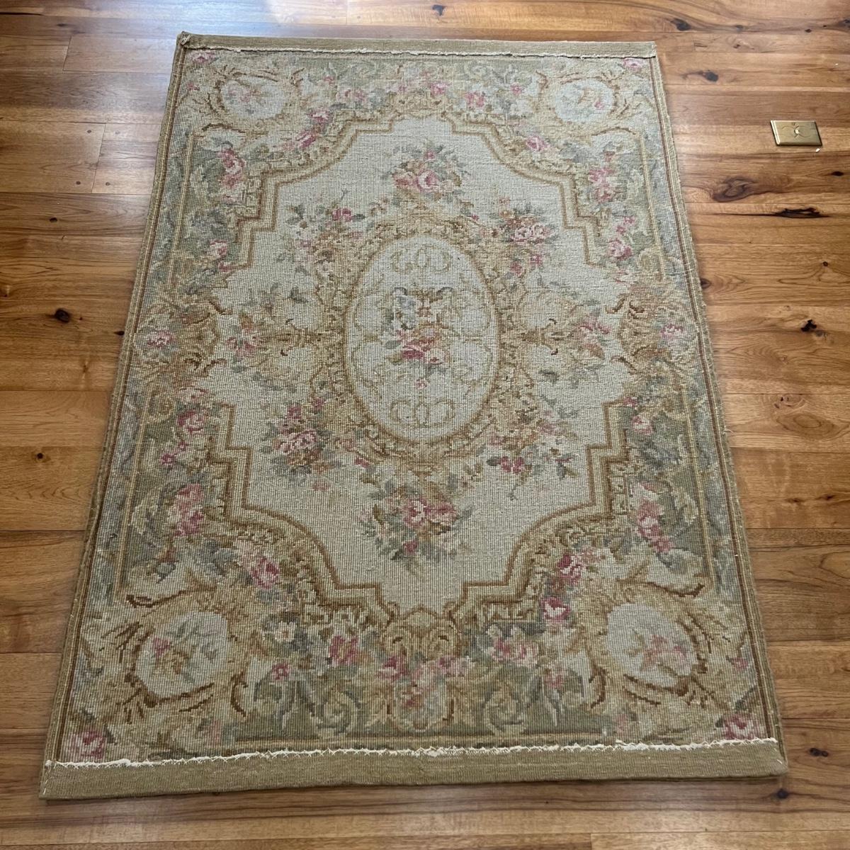 This rug appears to be woven wool and has a center medallion like a pattern. it measures 6’ 1” x 4’ 1”. The colors are very soft pastel.