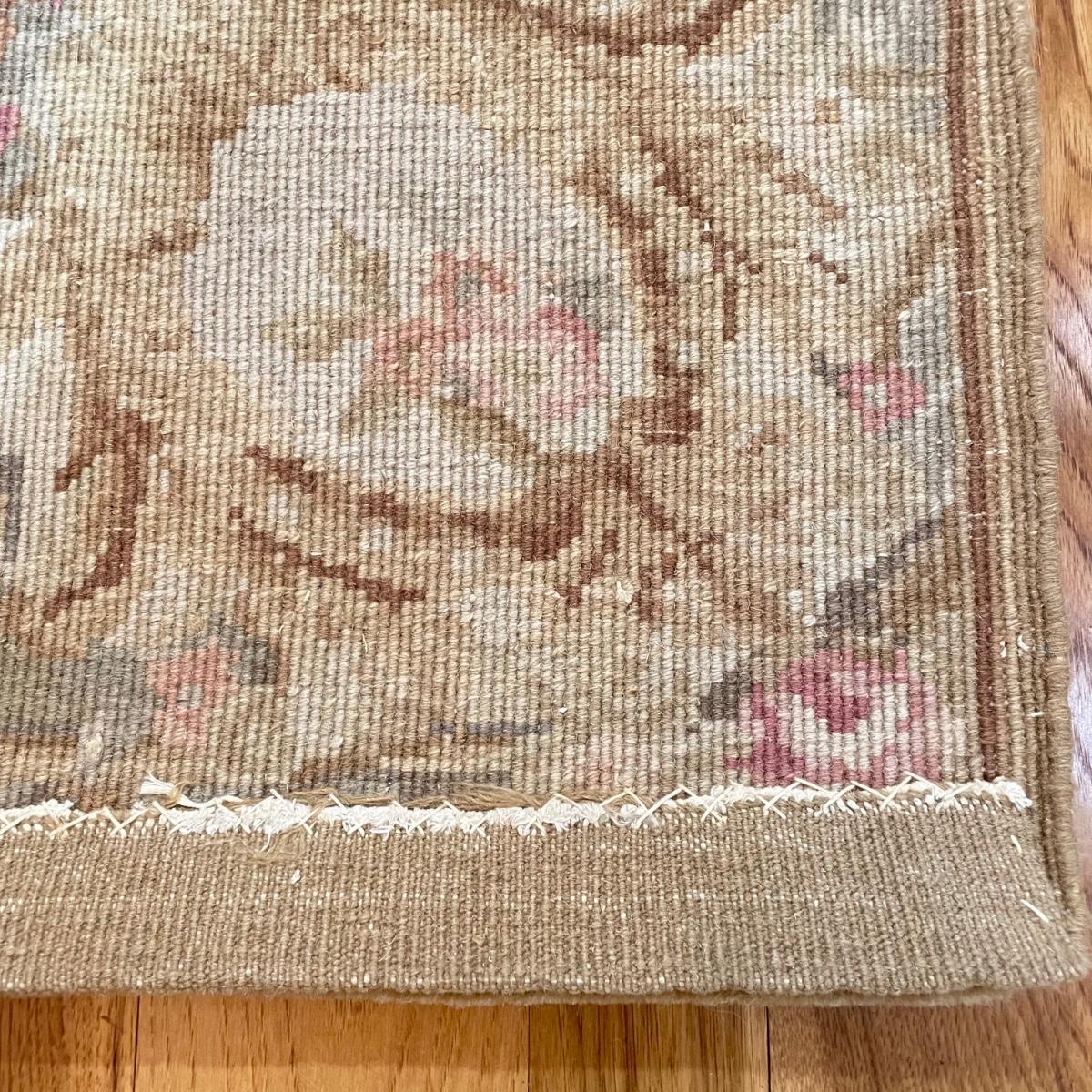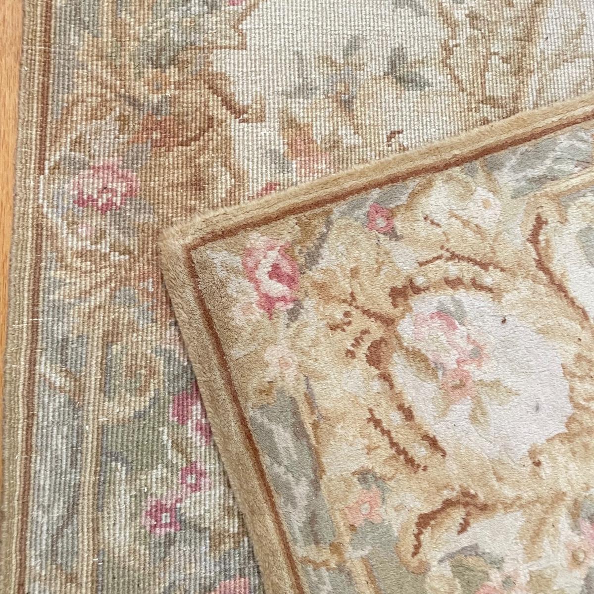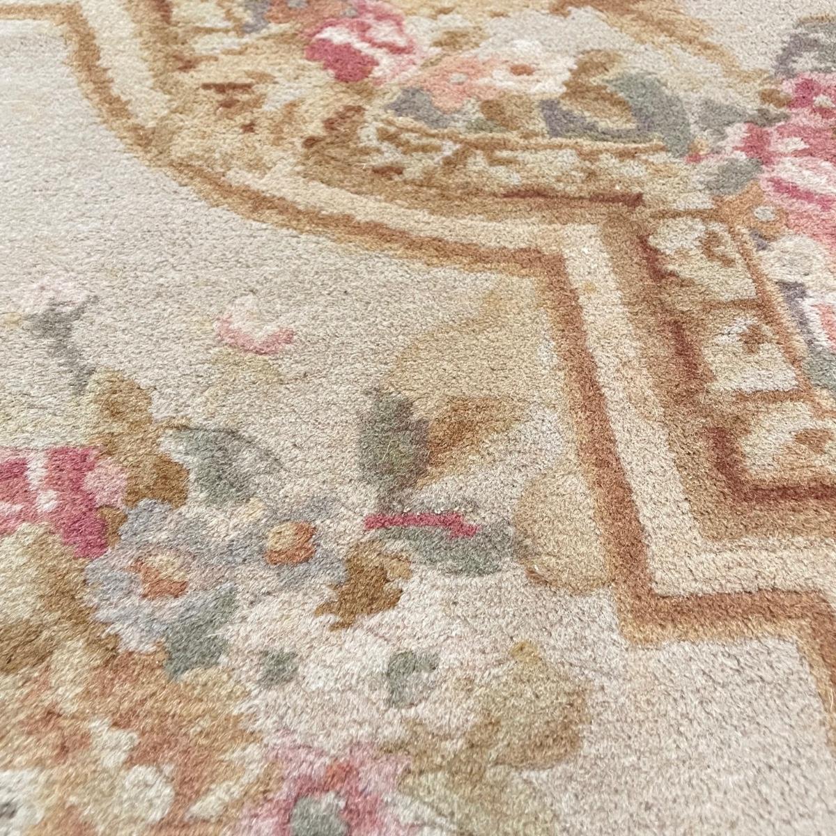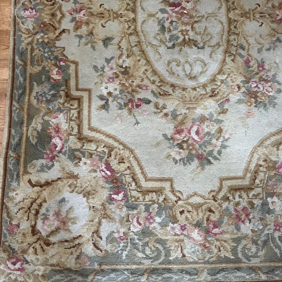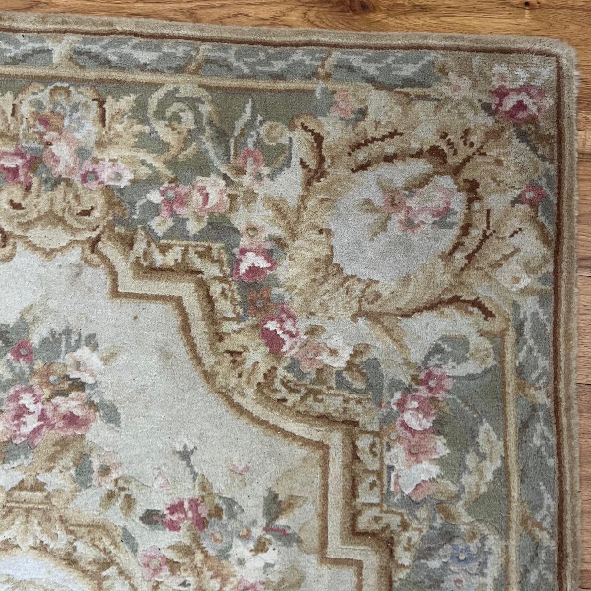 This rug appears to be woven wool and has a center medallion like a pattern. it measures 6’ 1” x 4’ 1”. The colors are very soft pastel.