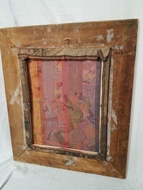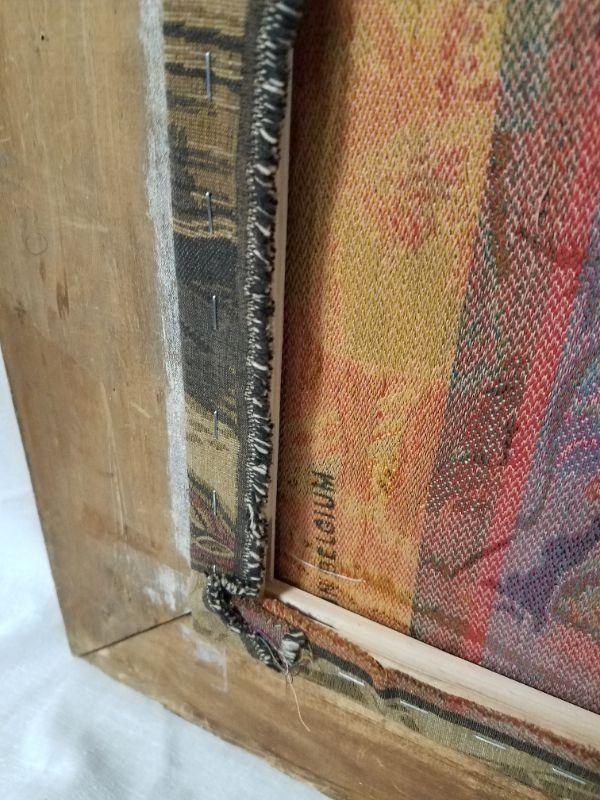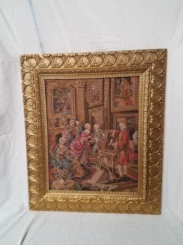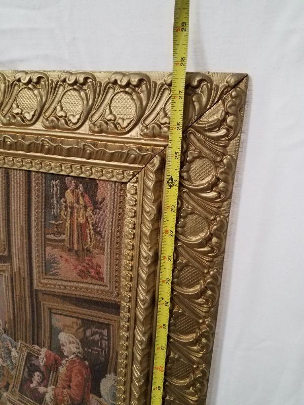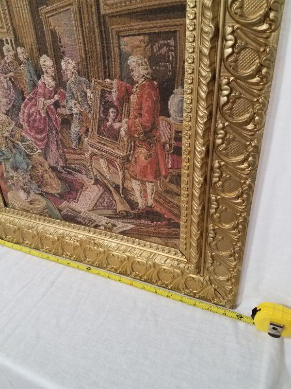 Beautiful vintage wood and gesso gold frame holding a vintage Belgium tapestry. Please email us for shipping quote.