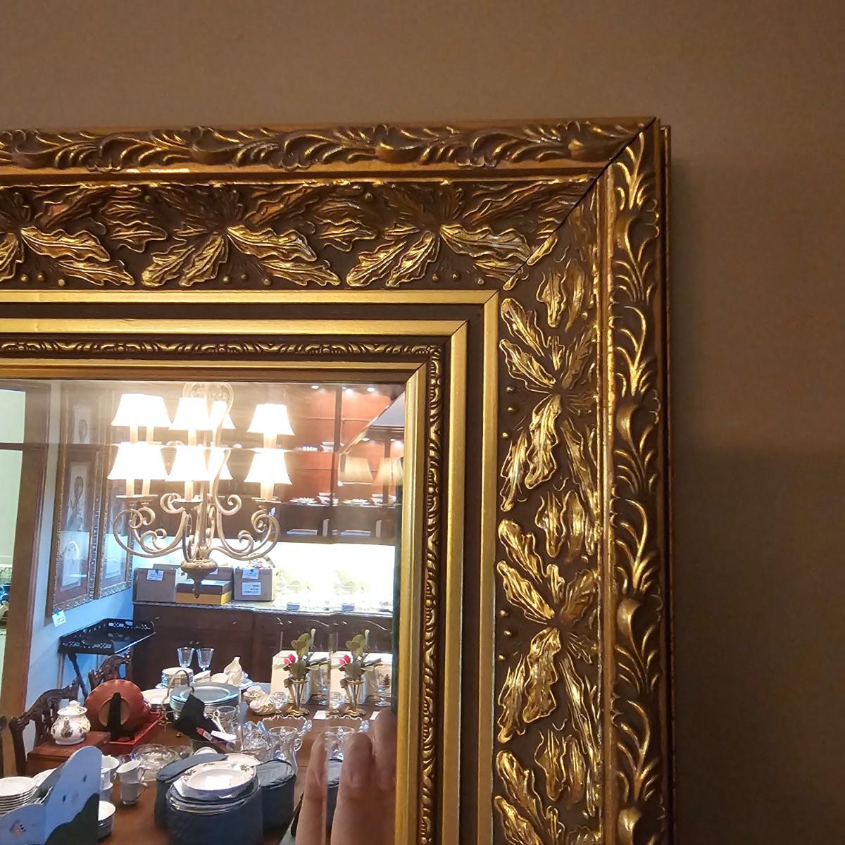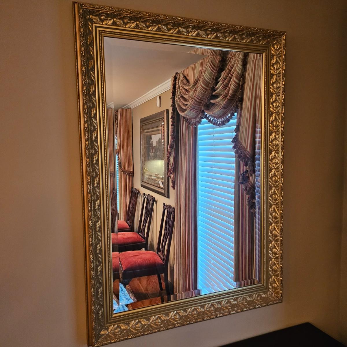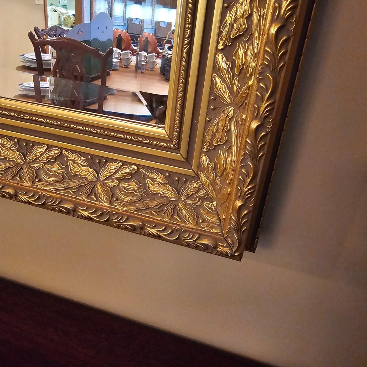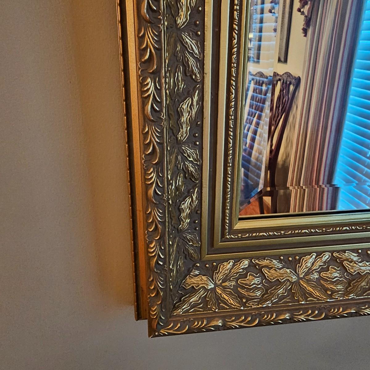 Highly decorated frame with beveled glass mirror. Sculptured leaves and swirls on this piece, mirror can be hung either direction. Measures 30" x 2" x 41"H. See photos for details. Local pickup only.