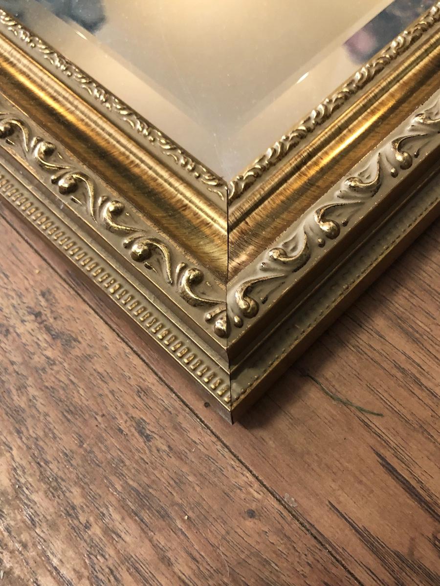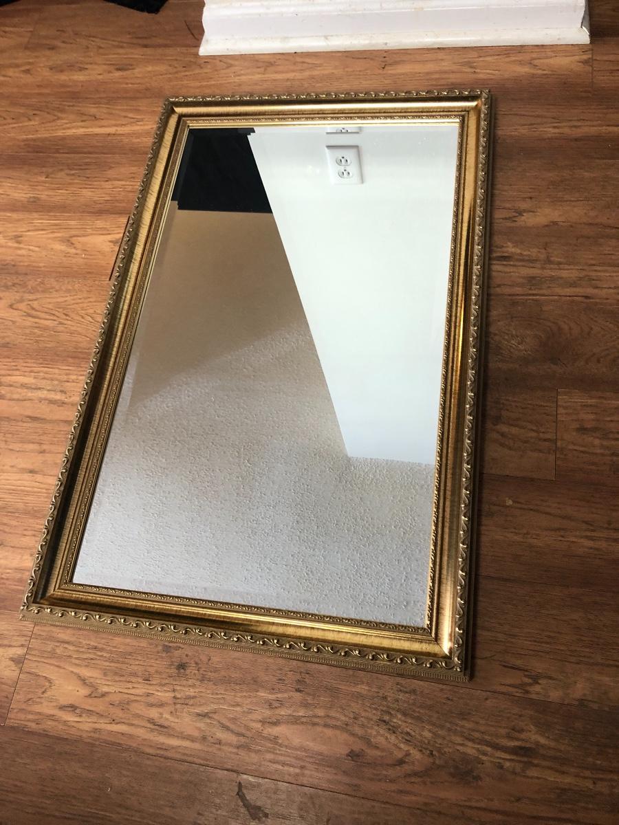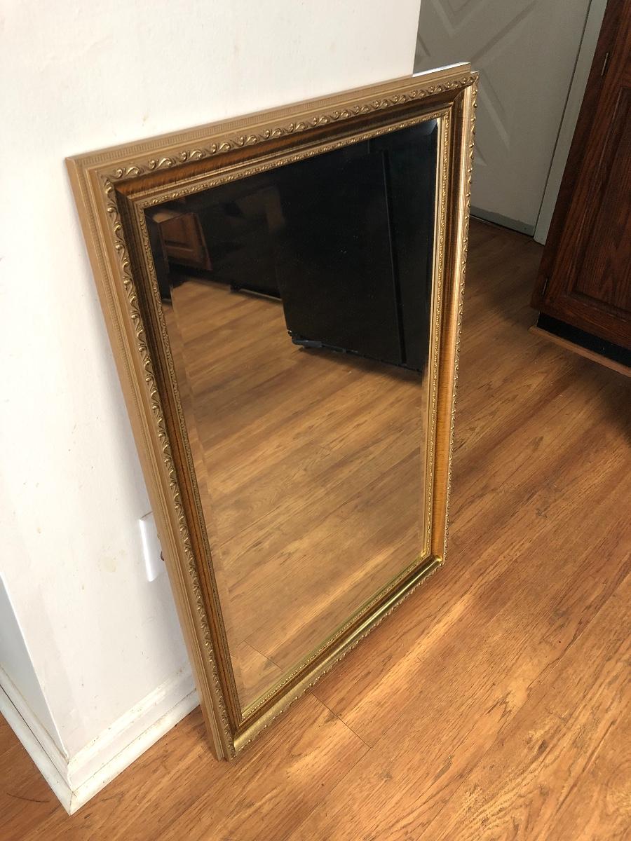 Dimensions are 21.5” x 33.5”; mirror has beveled edge. Note ornate frame. Local pick up only.