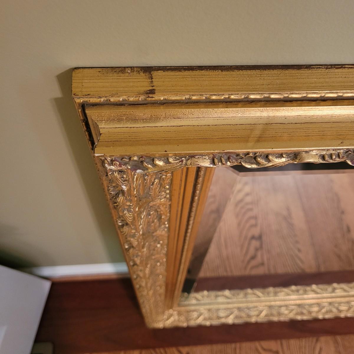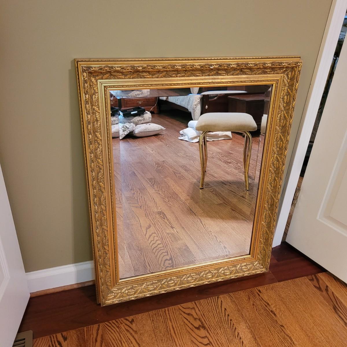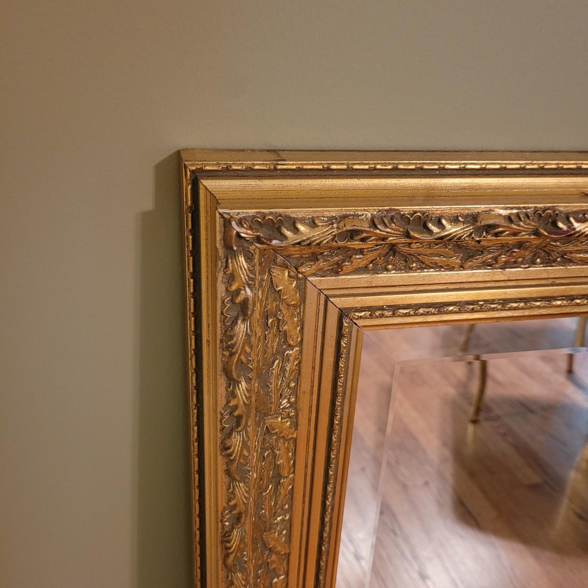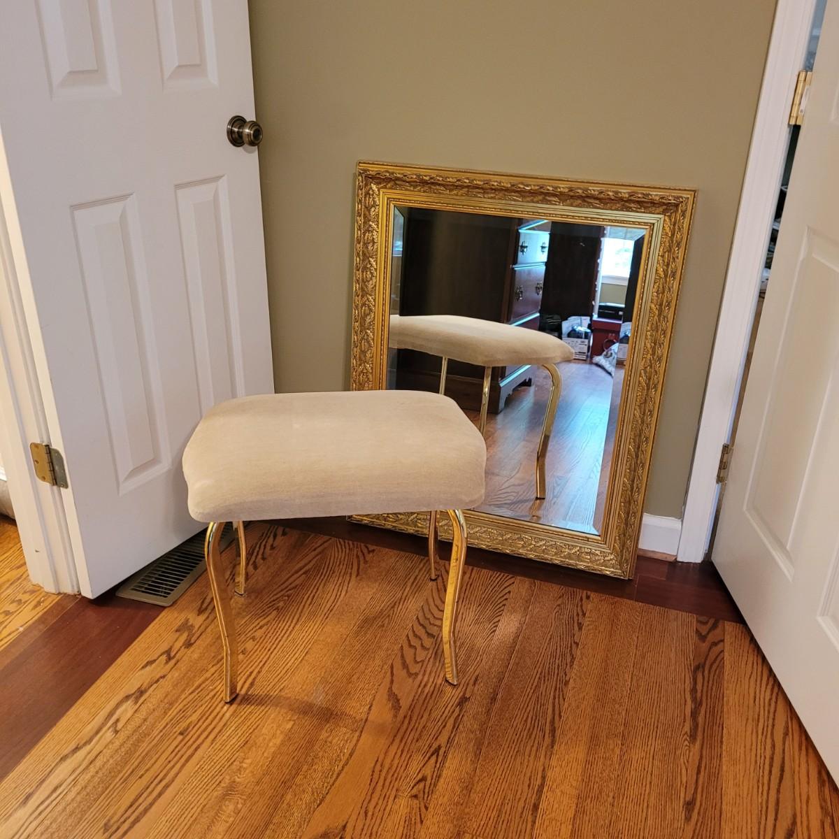 Ornate gold framed beveled mirror by the Bombay Company and velvet topped stool with gold legs. Legs have scratches and spots (see photos). Mirror measures approximately 28.5" x 35", stool 22" x 16" x 18"H. Local pickup only.