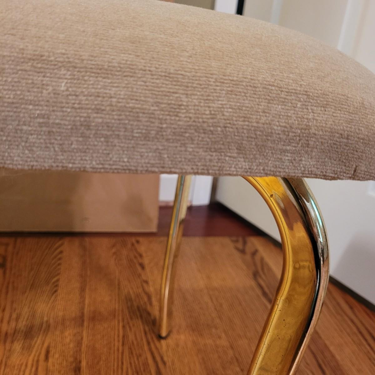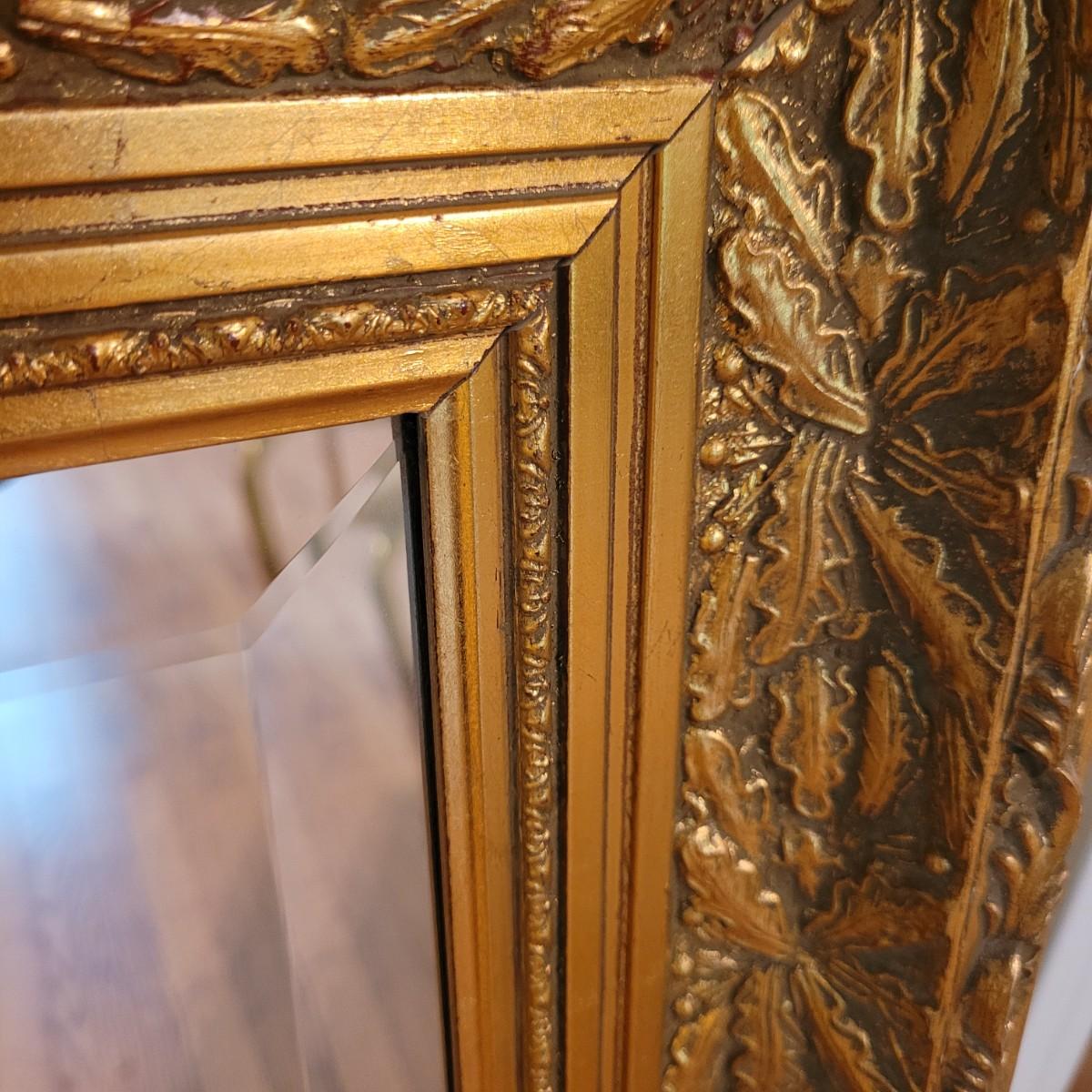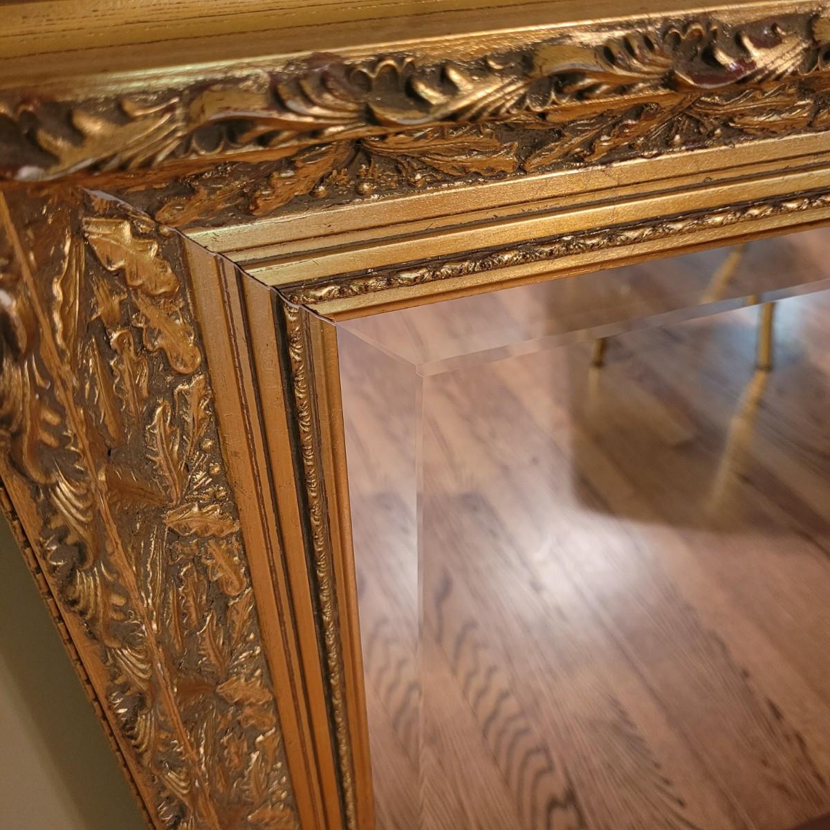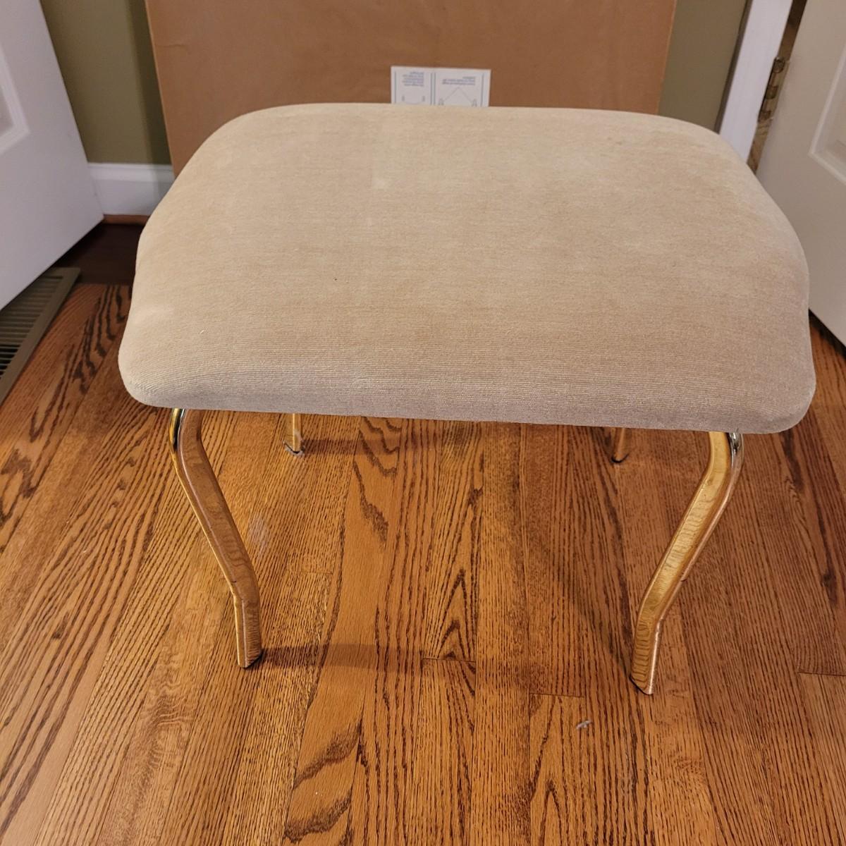 Ornate gold framed beveled mirror by the Bombay Company and velvet topped stool with gold legs. Legs have scratches and spots (see photos). Mirror measures approximately 28.5" x 35", stool 22" x 16" x 18"H. Local pickup only.