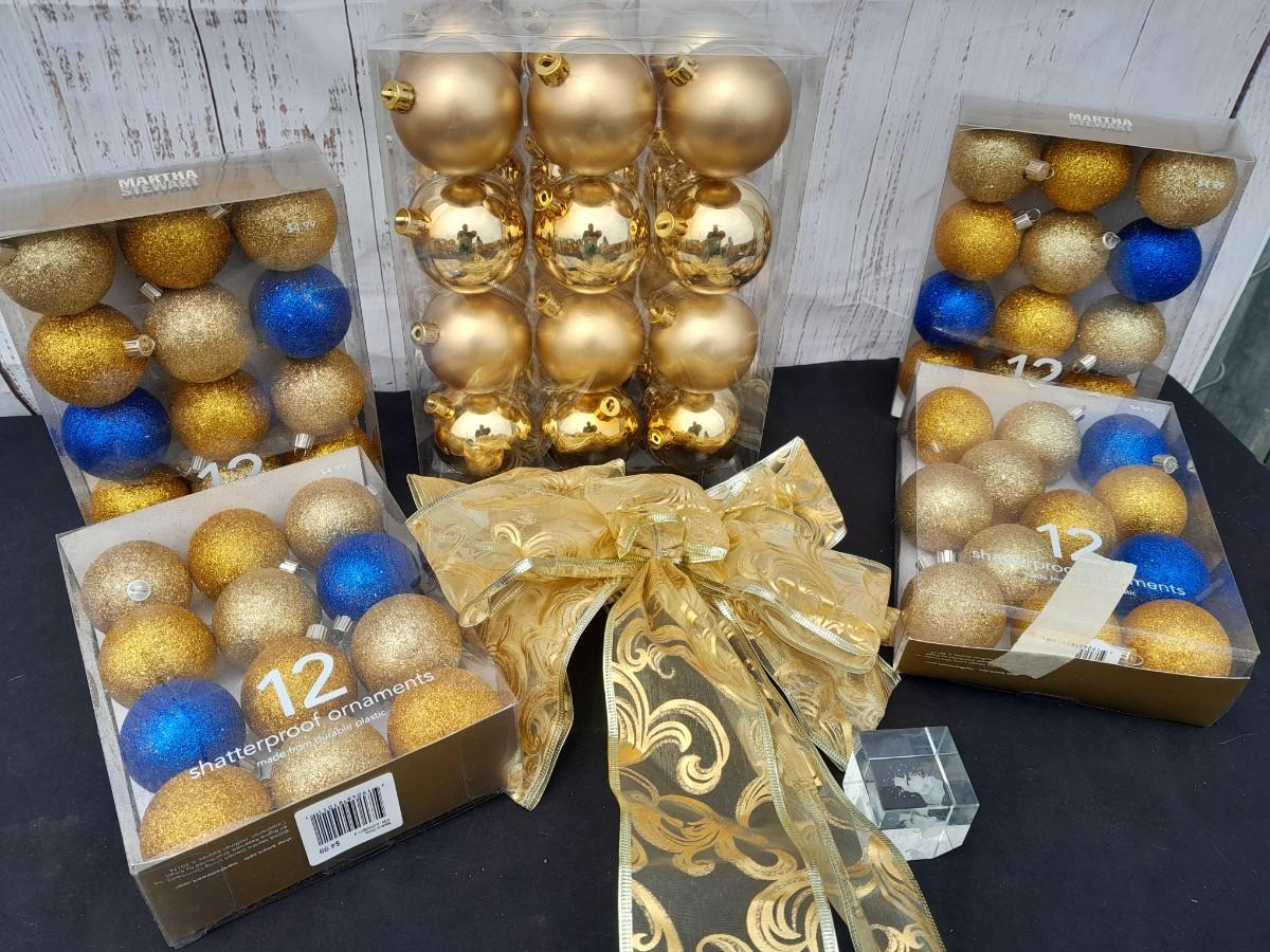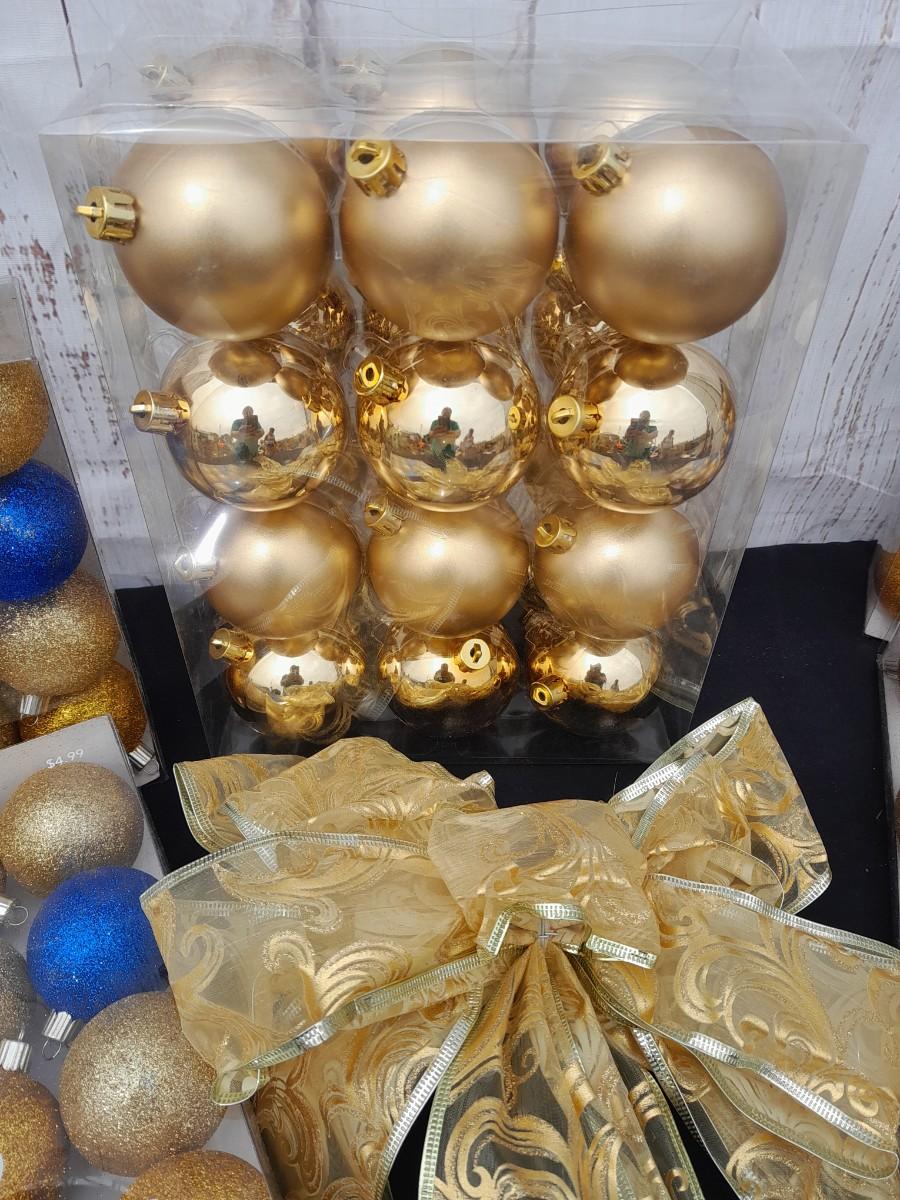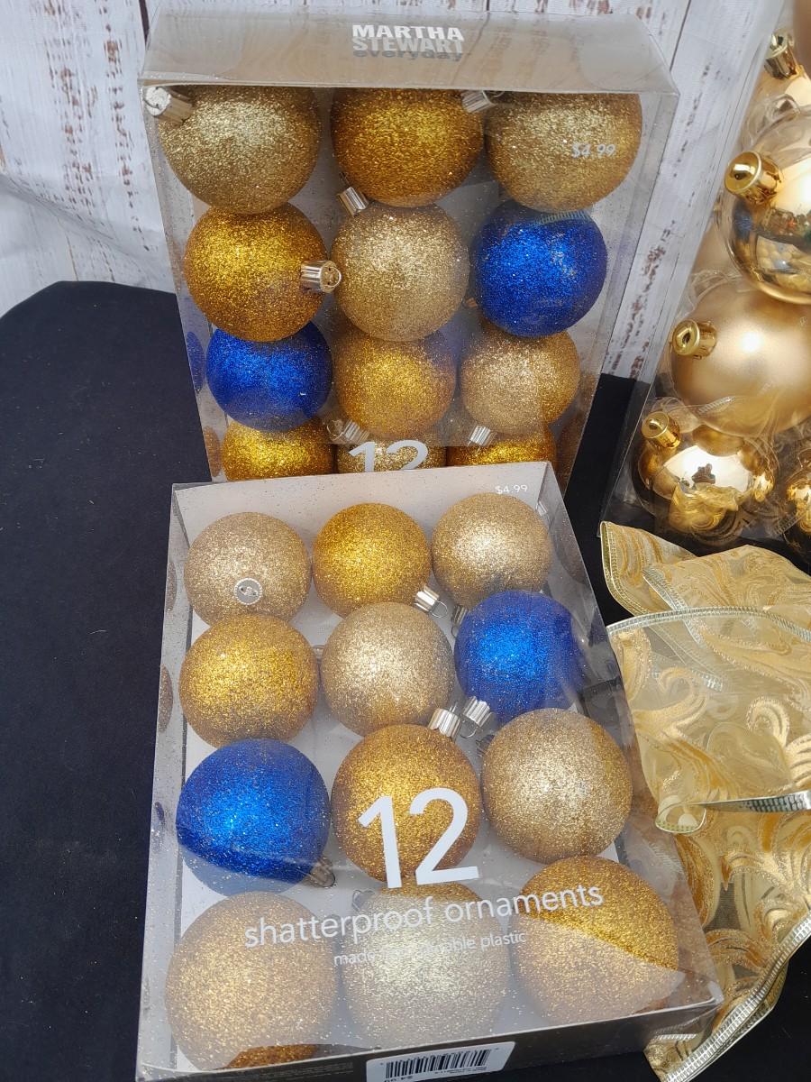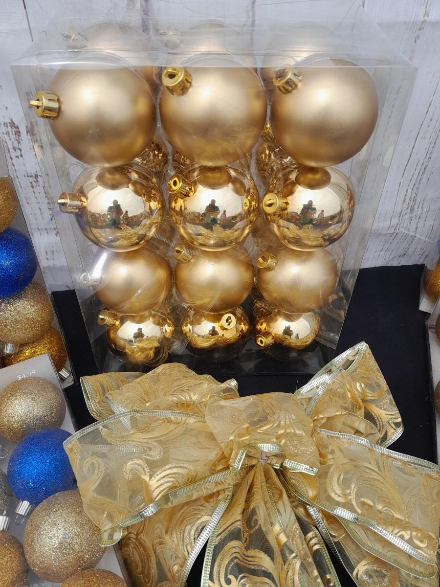 Gold glass Christmas ornaments with blue & gold glitter ornaments and a nice big bow