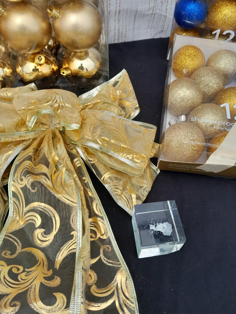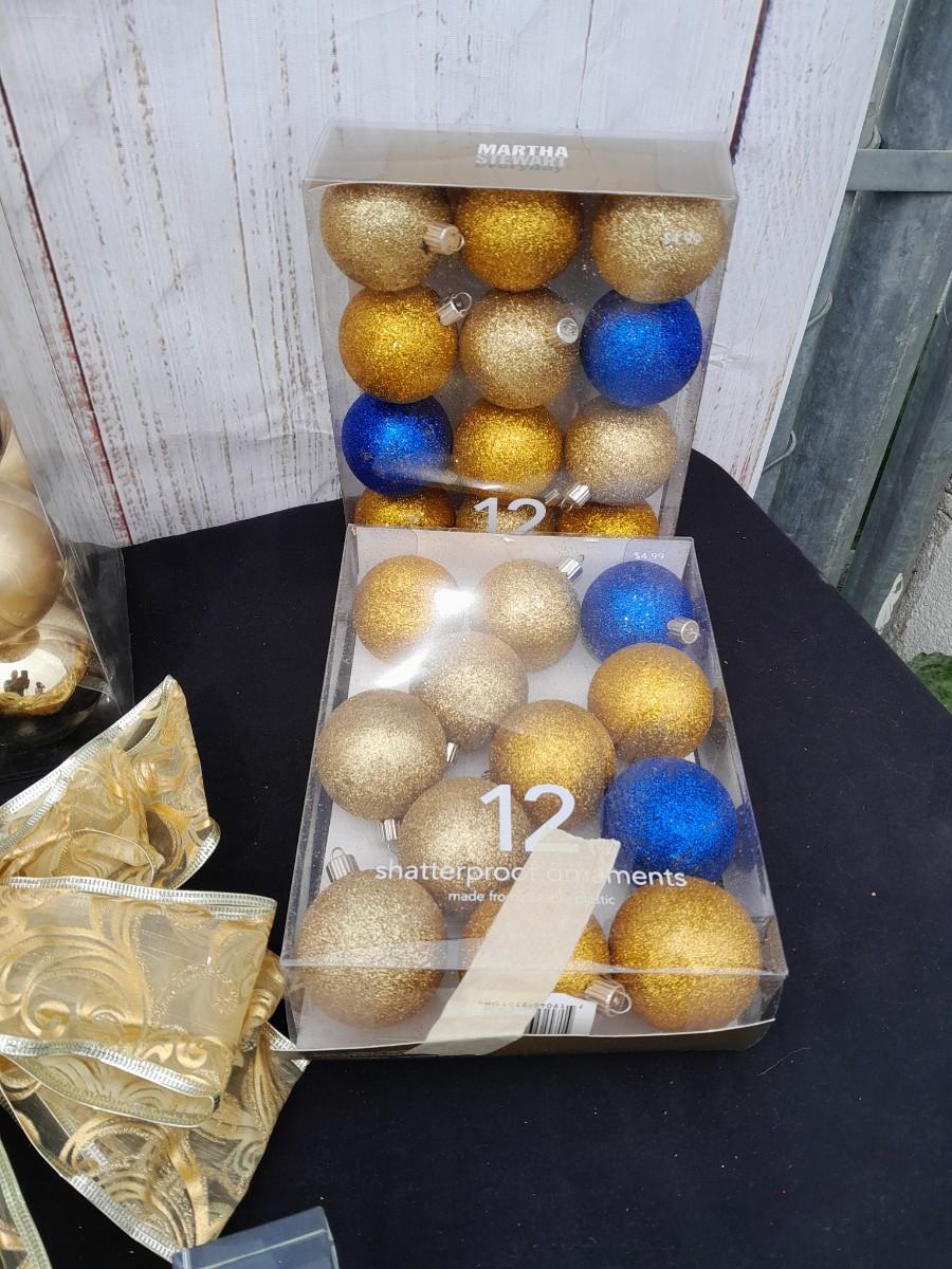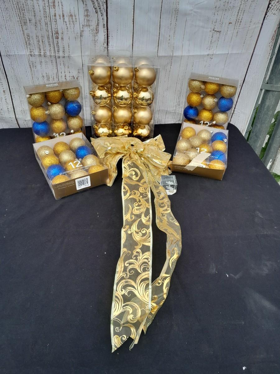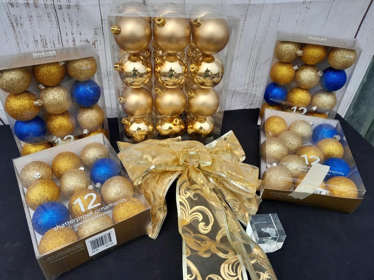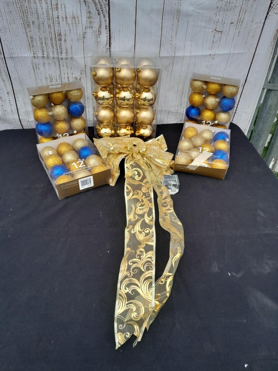 Gold glass Christmas ornaments with blue & gold glitter ornaments and a nice big bow