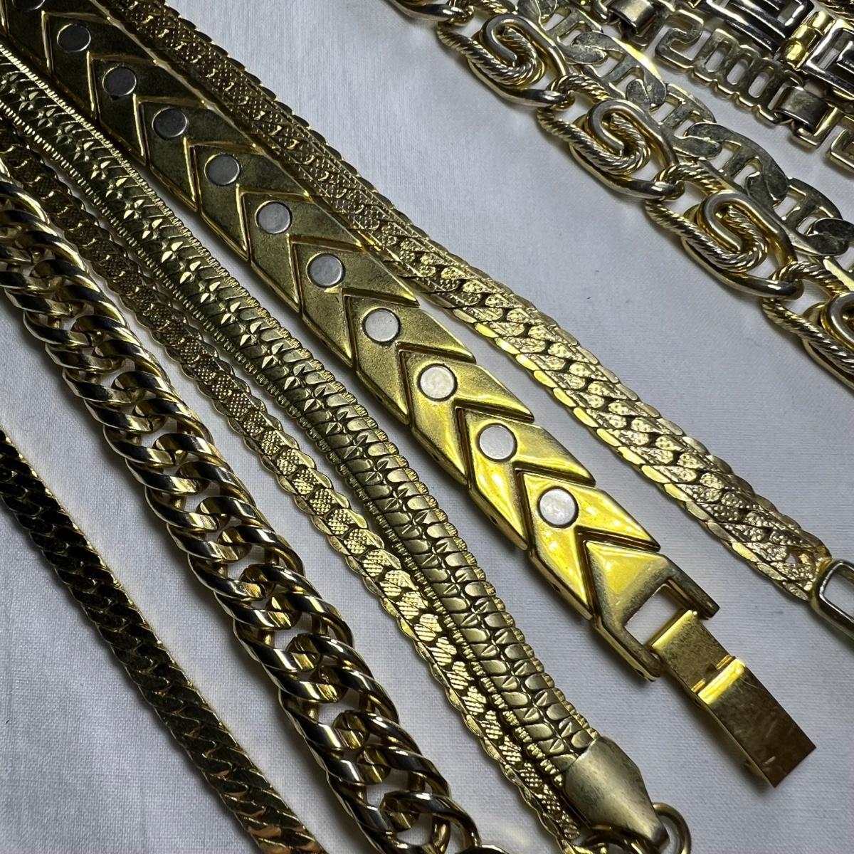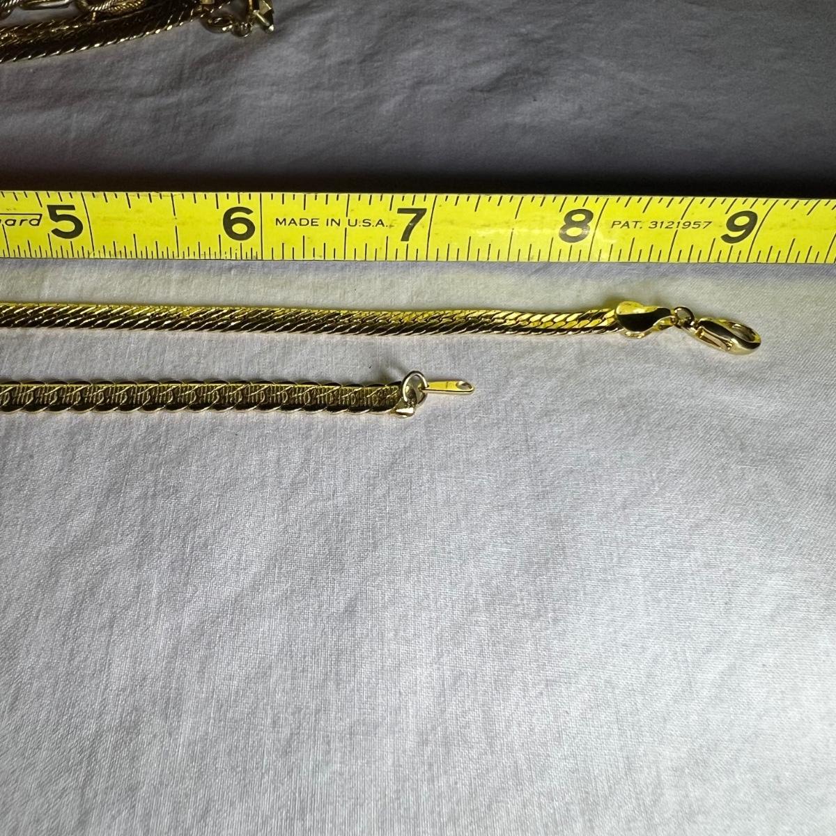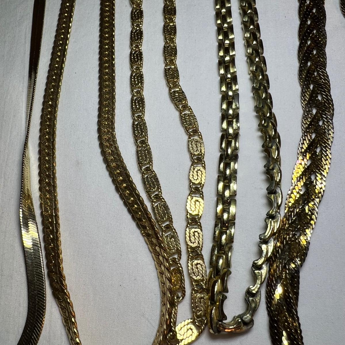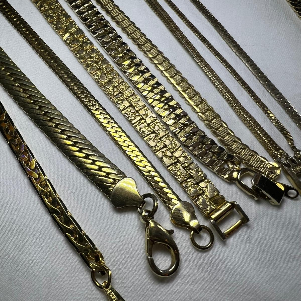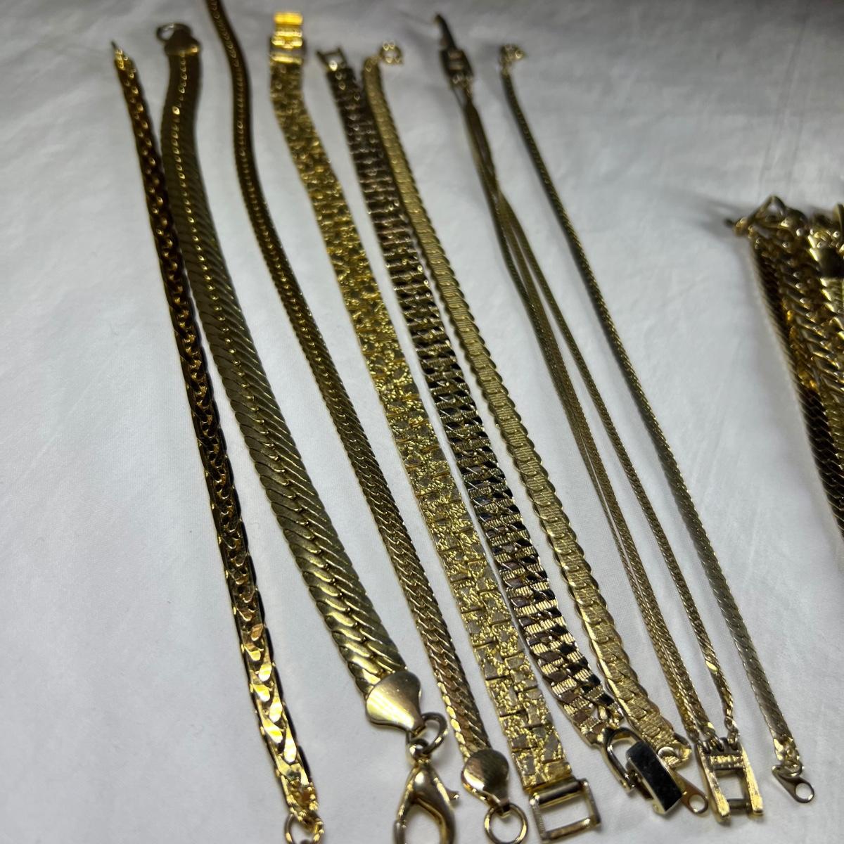 Approximately 40 pieces of gold toned necklaces and bracelets. Majority of chains have a herringbone design. See images for full inventory. Necklaces range in length from 16”-52” long.