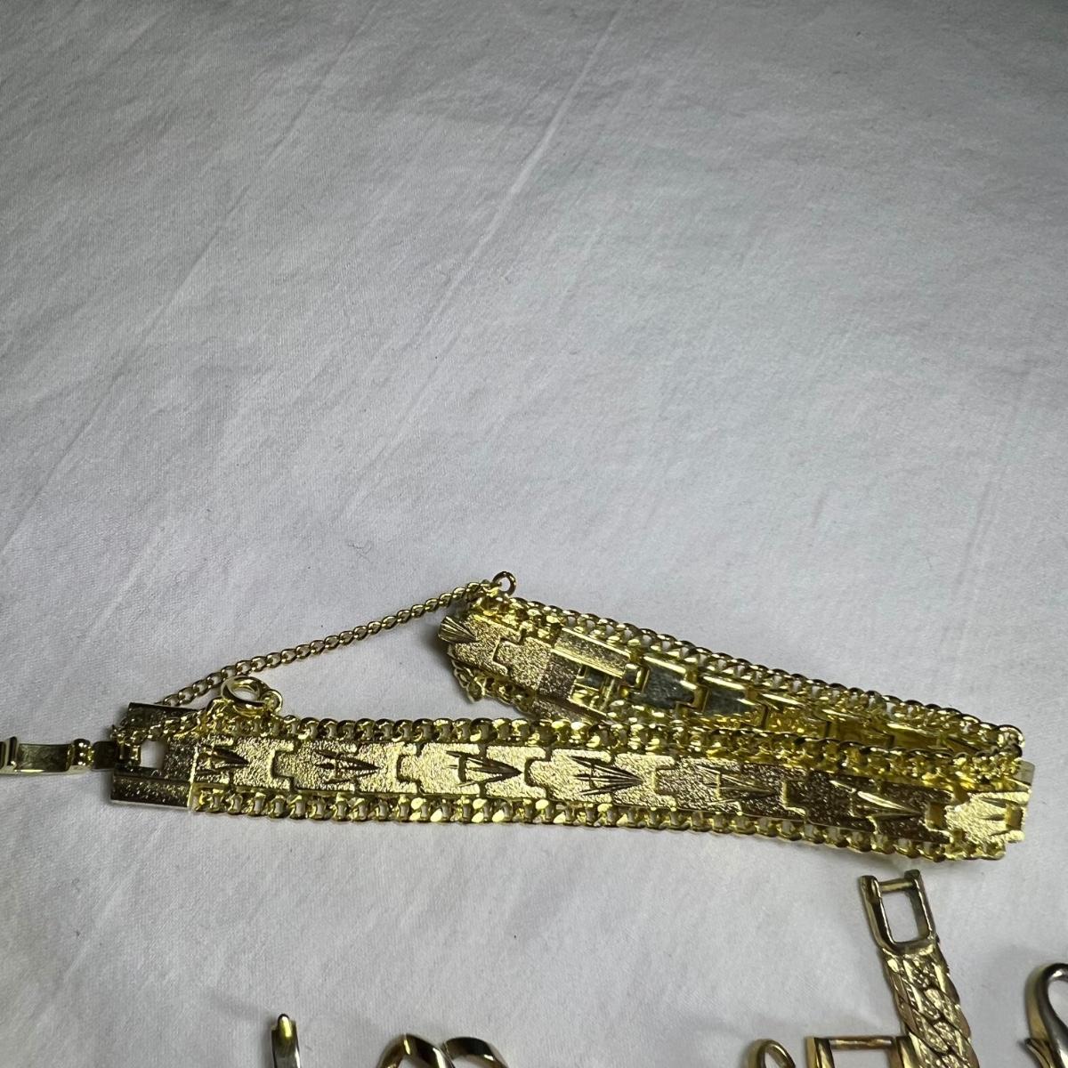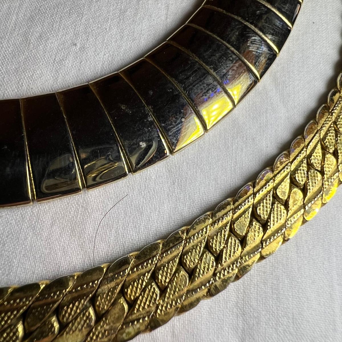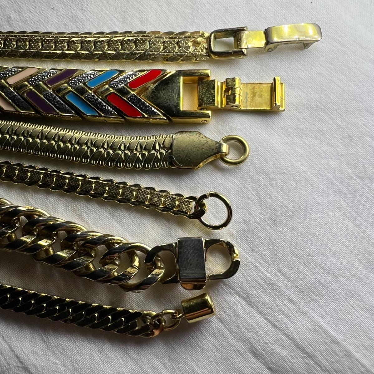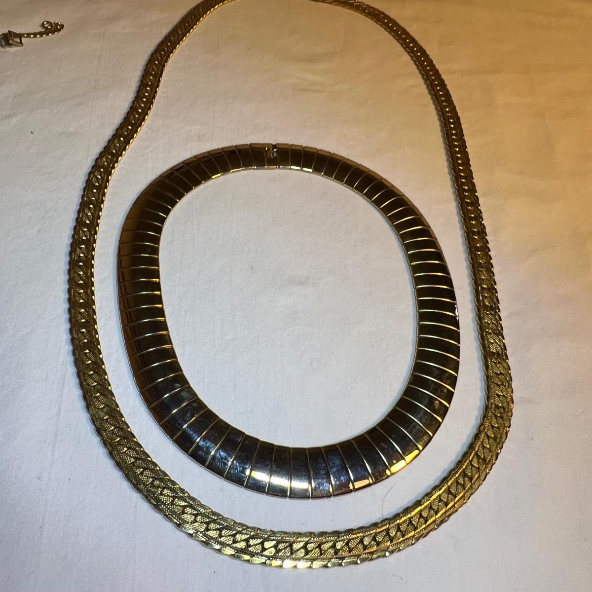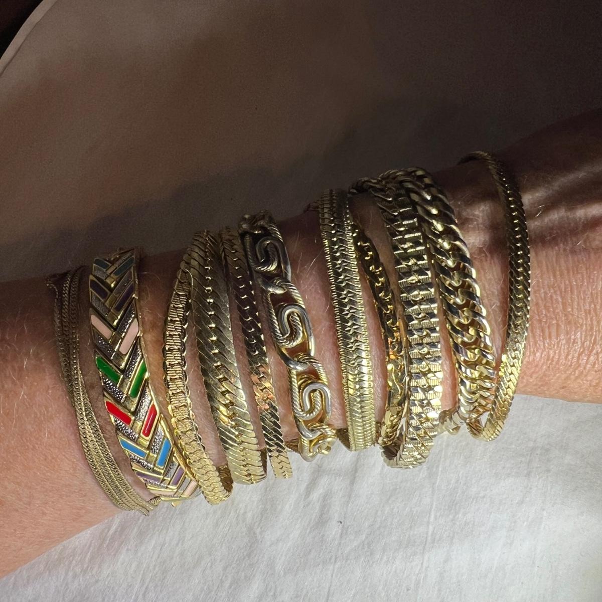 Approximately 40 pieces of gold toned necklaces and bracelets. Majority of chains have a herringbone design. See images for full inventory. Necklaces range in length from 16”-52” long.