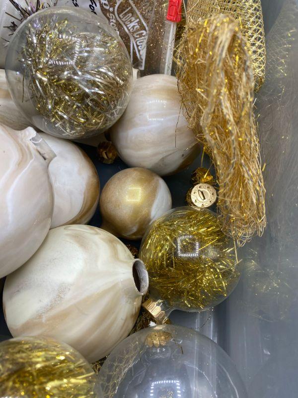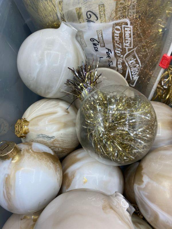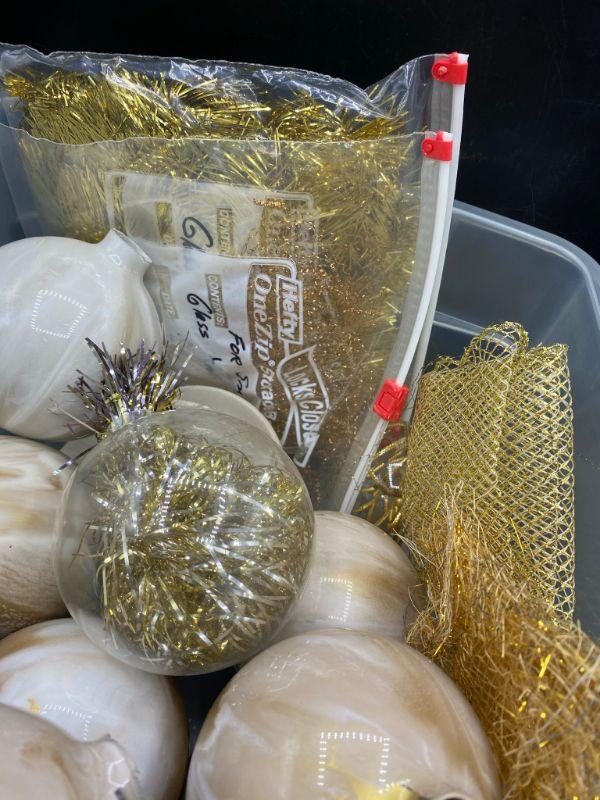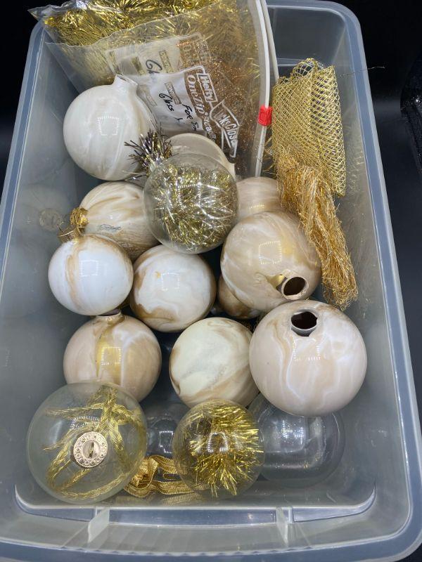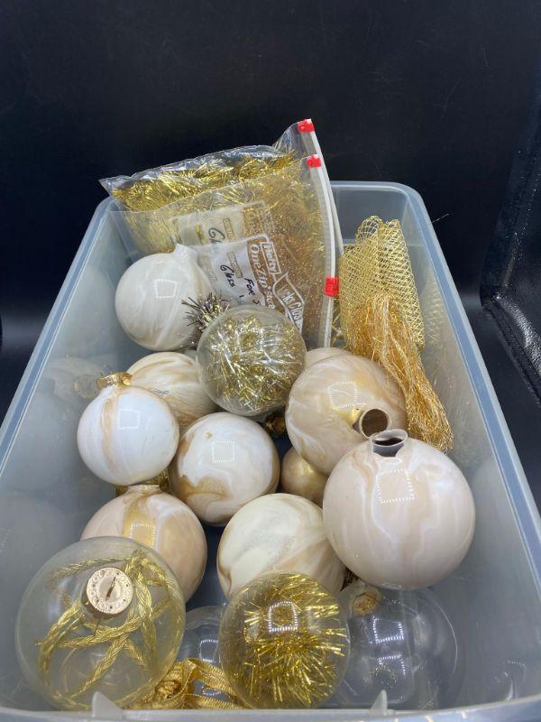 Looks like an unfinished gold holiday tree ball craft project. Swirl painted and ribbon inside. Need to be finished, don't know if all the tops are there but there are loose ones in the box.
