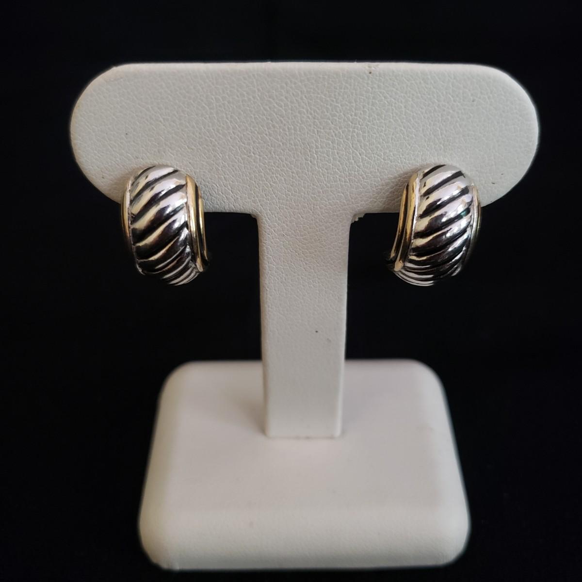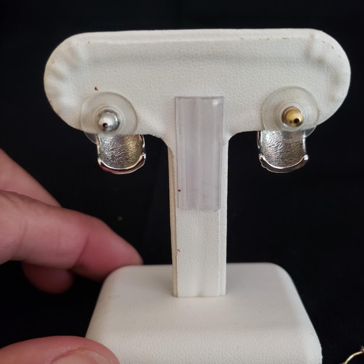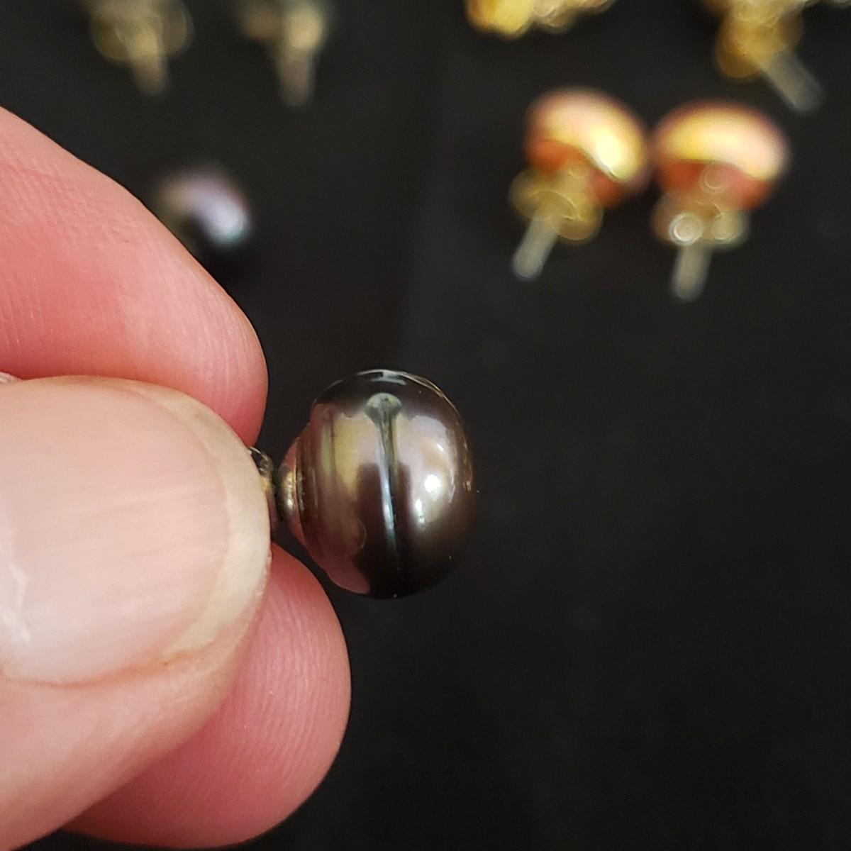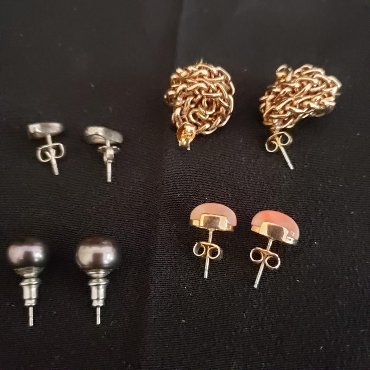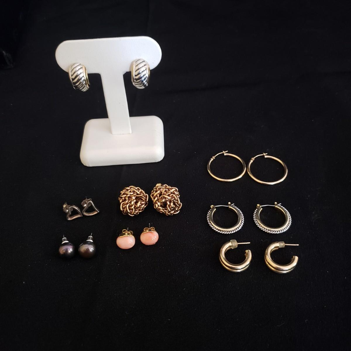 This lot has 8 pairs of hoop and post earrings. The three hoop earrings appear to be gold. The "knotty" Gold like pair are .5" in size. The peach colored like stone are partially wrapped in a gold like setting. The iridescent black balls have a groove on one side of one earring, see picture. The silver posts have a gold like edging on the sides. The heart posts are silver like.