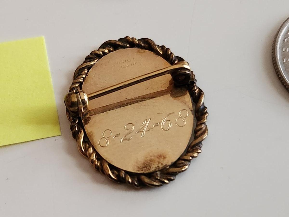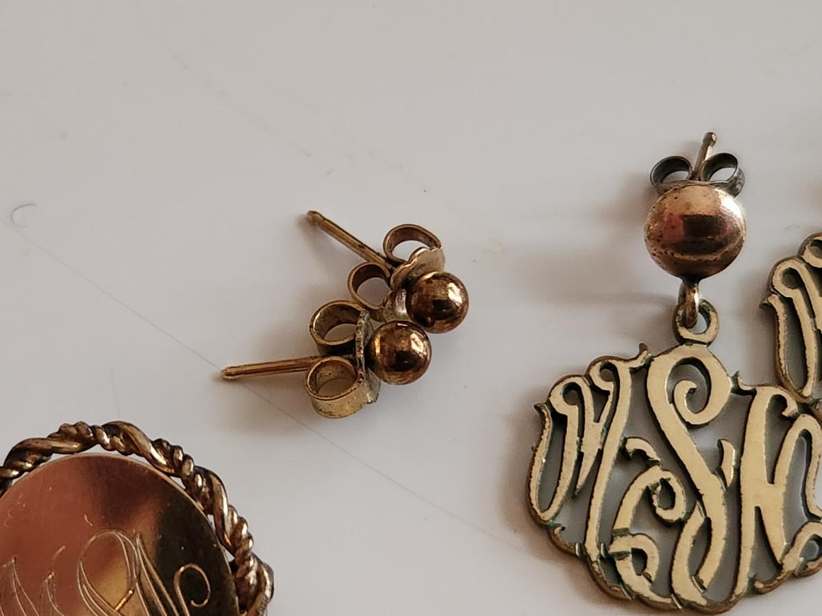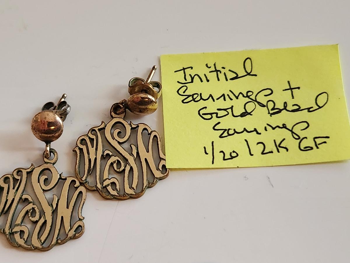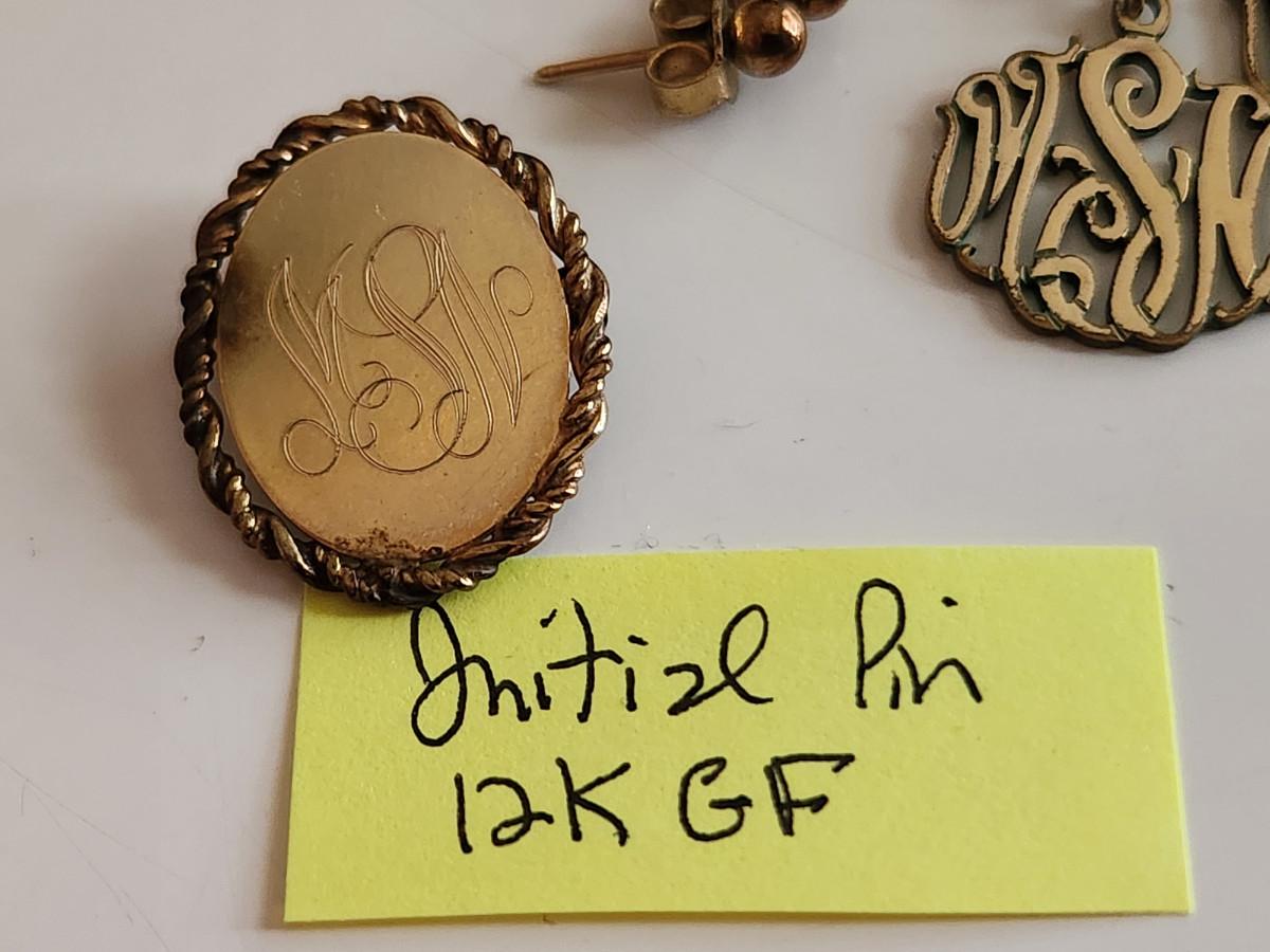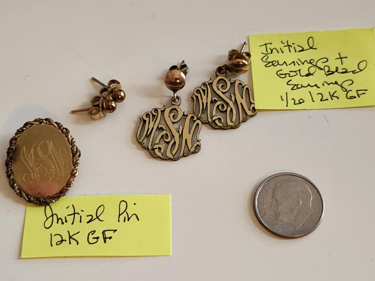 This auction lot is for a Gold Initial Pin and Earrings plus a set of studs that appear to be gold. The Initial Pin is marked 12KGF and the Initial Earrings are marked 1/20 12KGF.