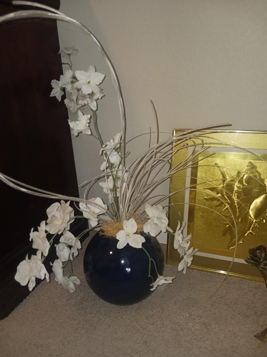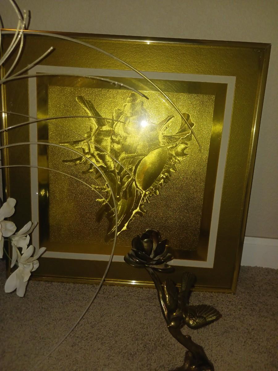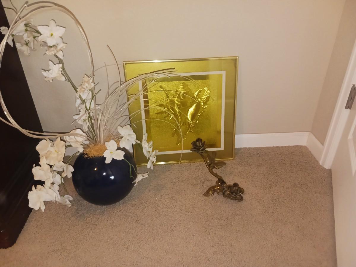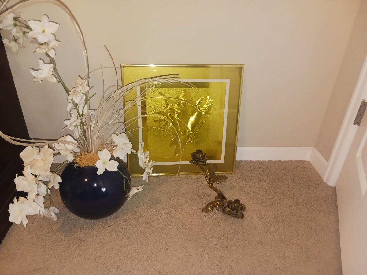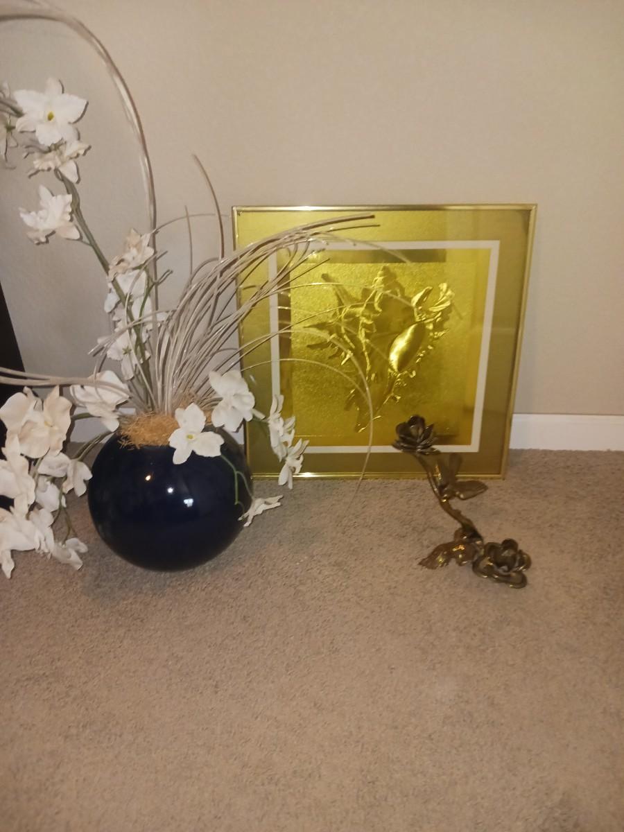 GOLD LEAF PICTURE, SOLID BRASS ROSE CANDLE HOLDER AND MORE