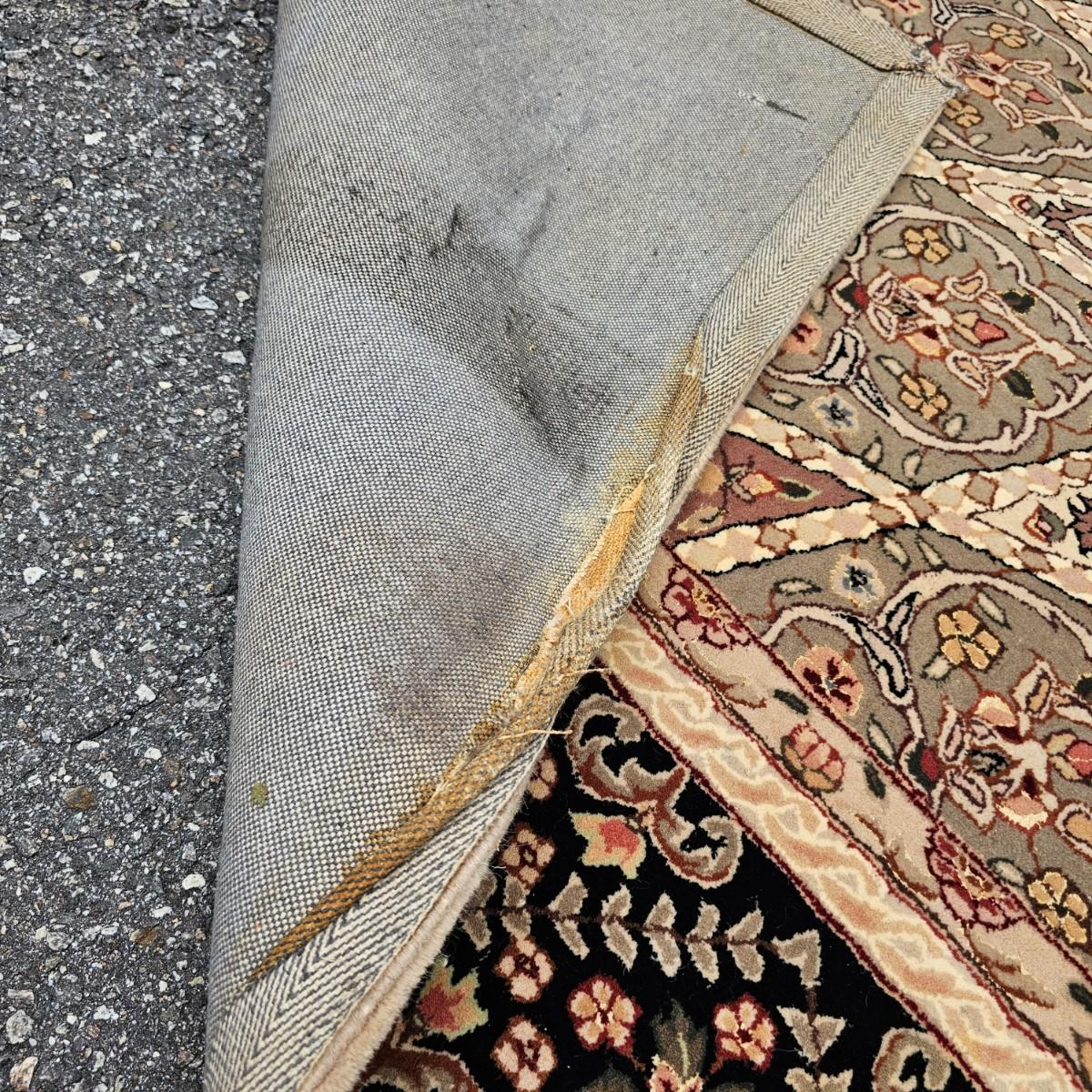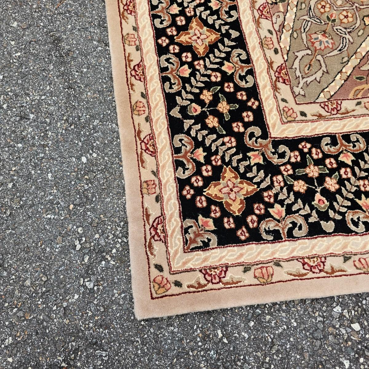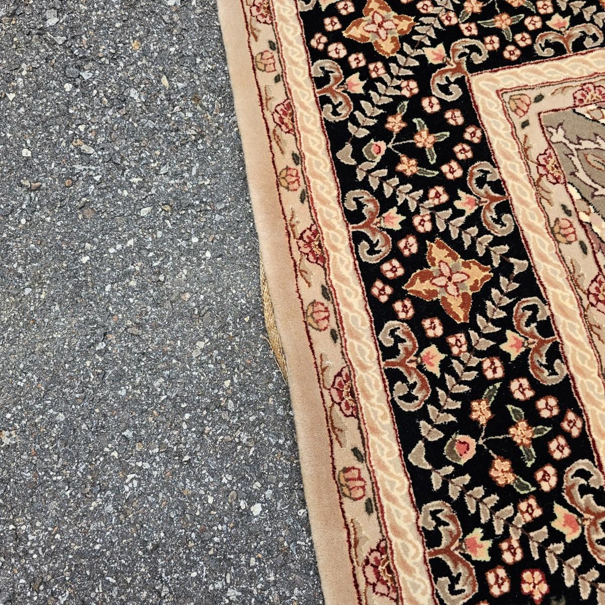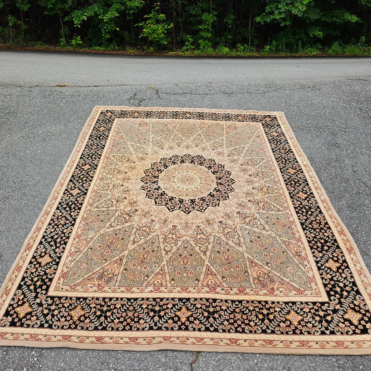 One neutral color patterned rug with gold/black medallion in center and black patterned border near outside edge. Rug measures 92" x 124". Appears to be made of wool pile. Some backside edging and corner have come loose, as well as some discoloration, but no smell evident. See photos for details. Local pickup only.