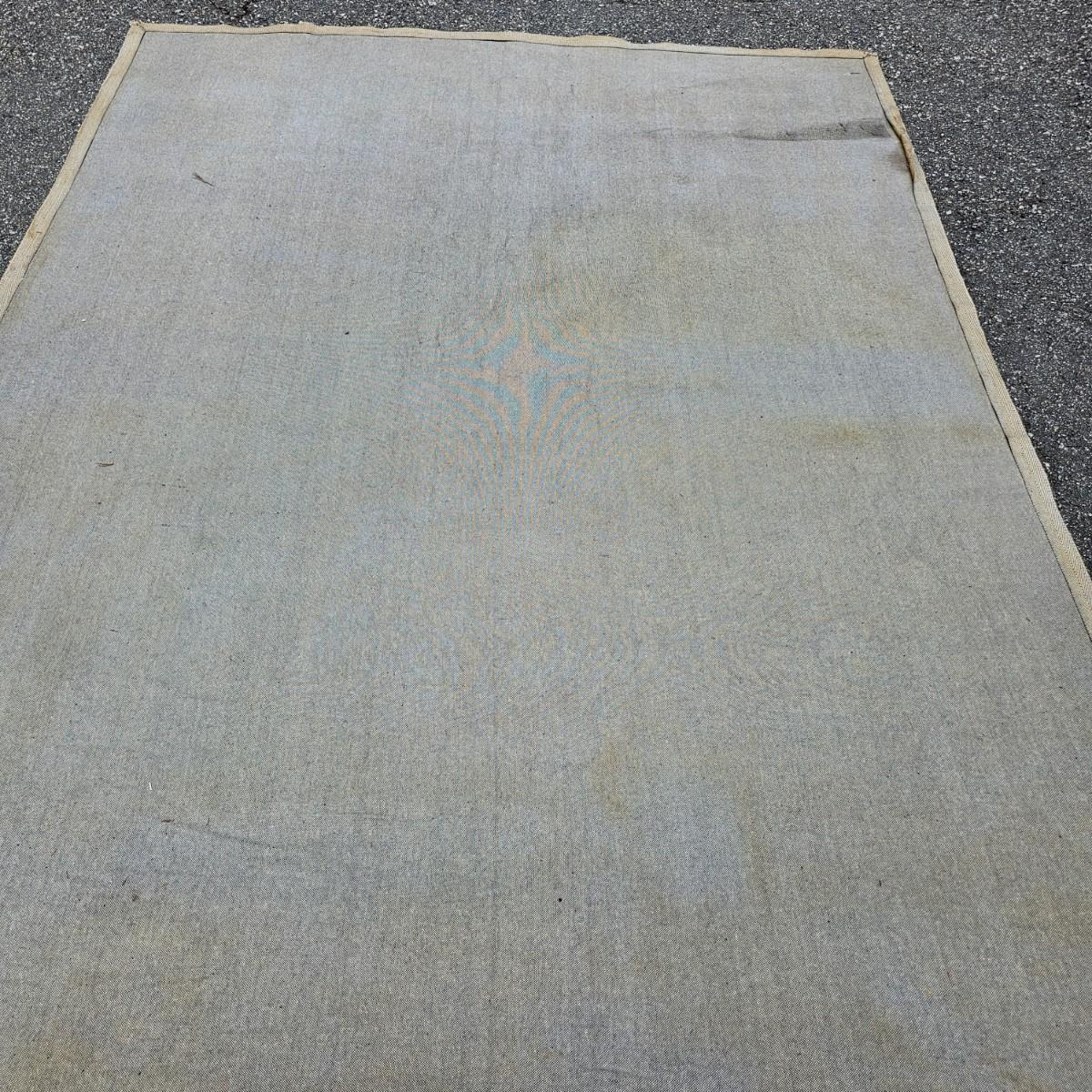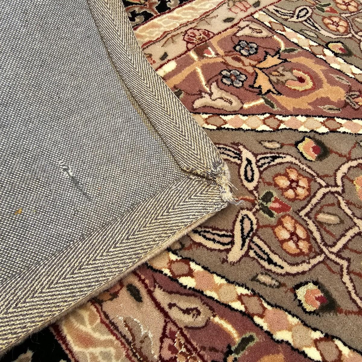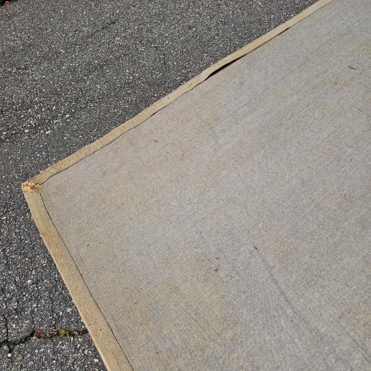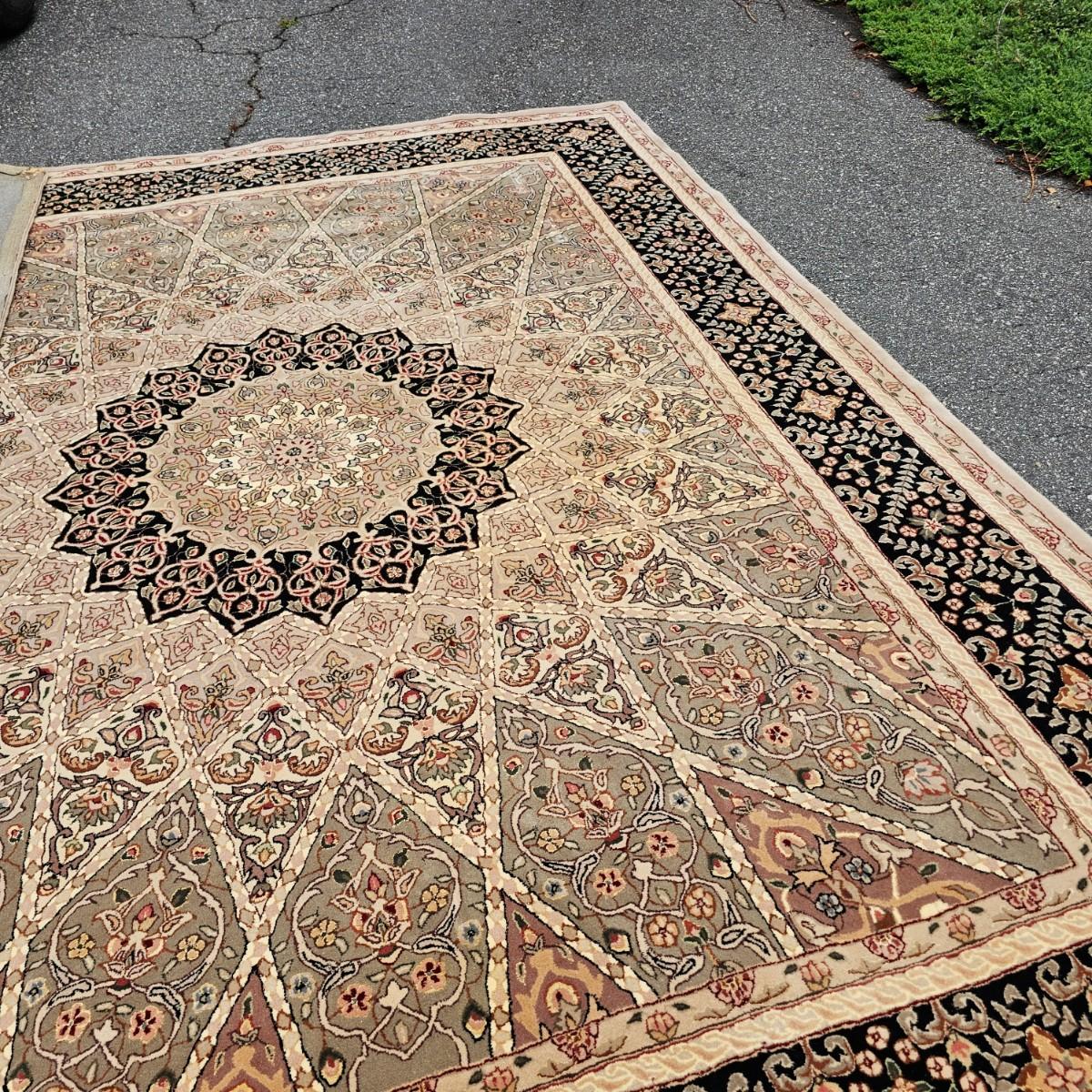 One neutral color patterned rug with gold/black medallion in center and black patterned border near outside edge. Rug measures 92" x 124". Appears to be made of wool pile. Some backside edging and corner have come loose, as well as some discoloration, but no smell evident. See photos for details. Local pickup only.