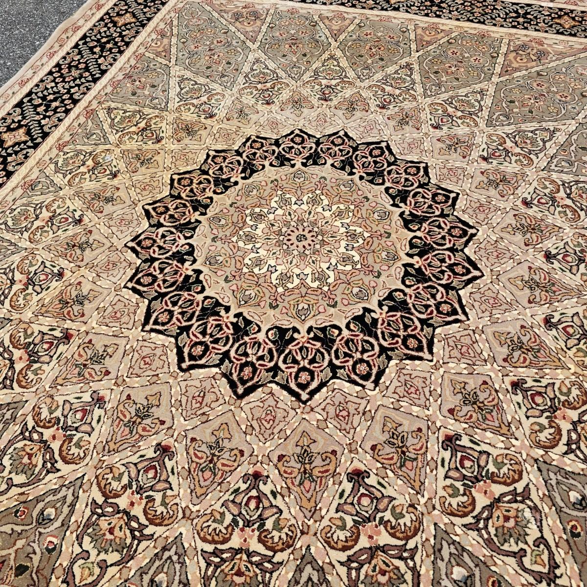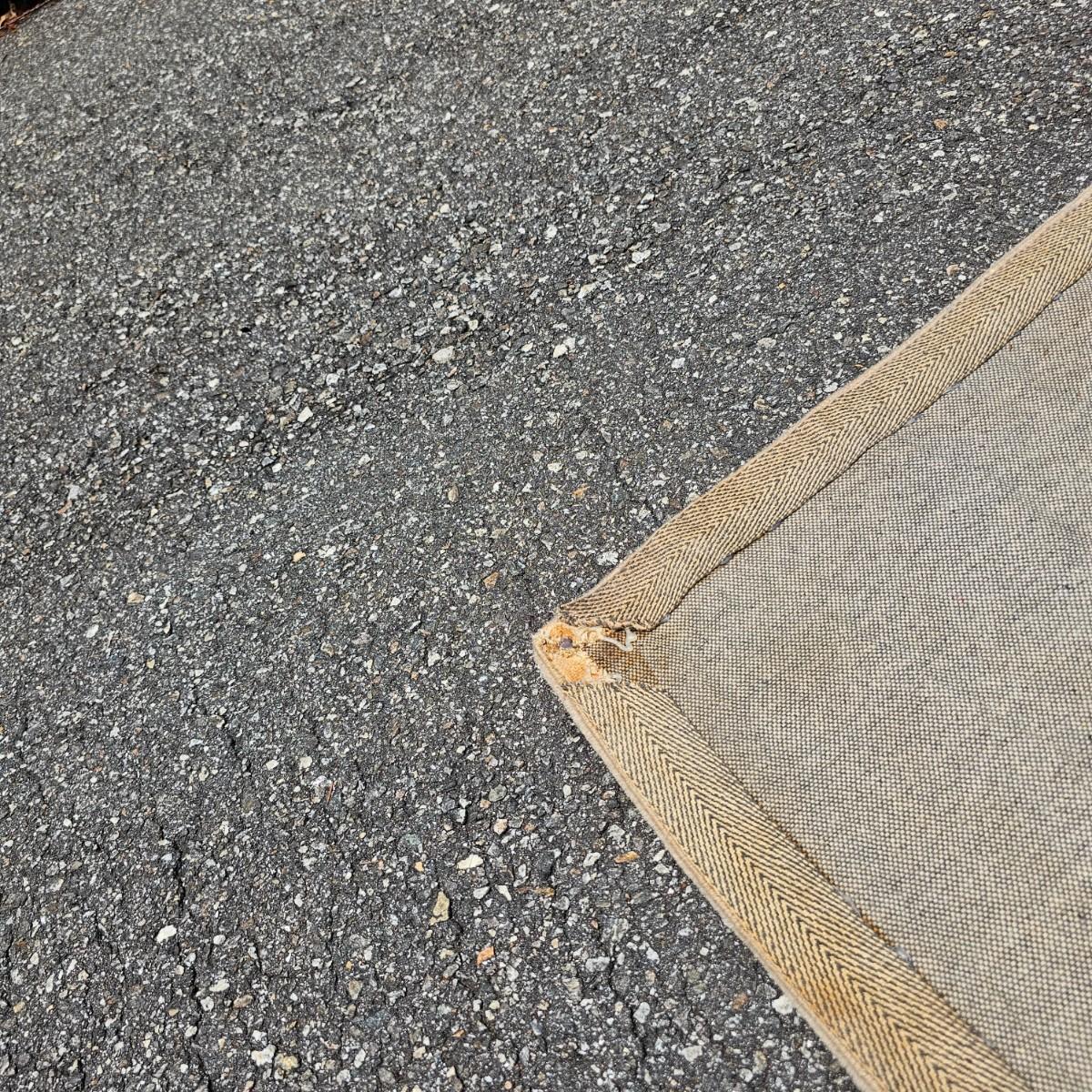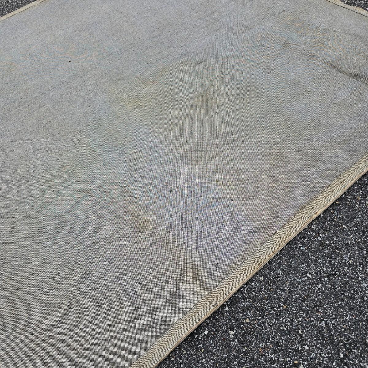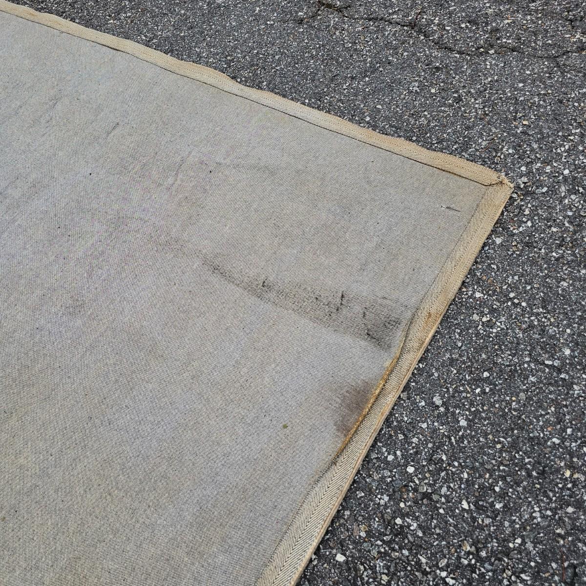 One neutral color patterned rug with gold/black medallion in center and black patterned border near outside edge. Rug measures 92" x 124". Appears to be made of wool pile. Some backside edging and corner have come loose, as well as some discoloration, but no smell evident. See photos for details. Local pickup only.