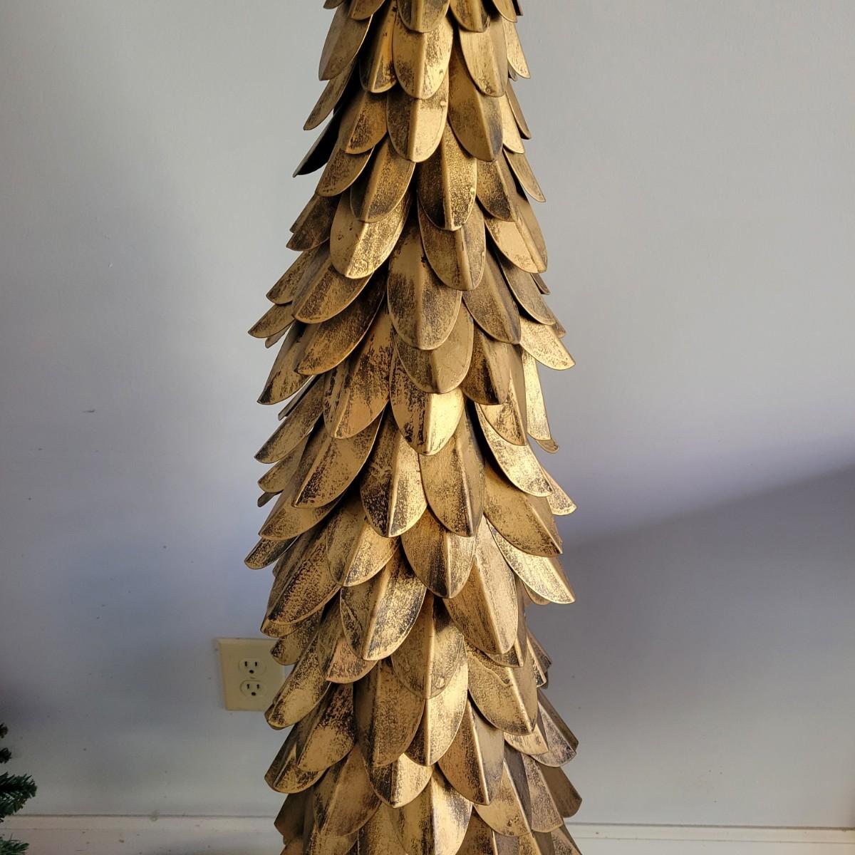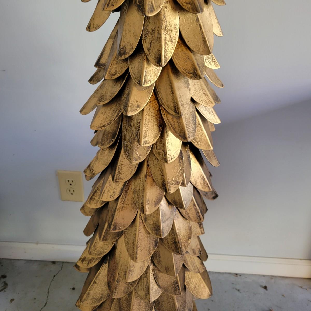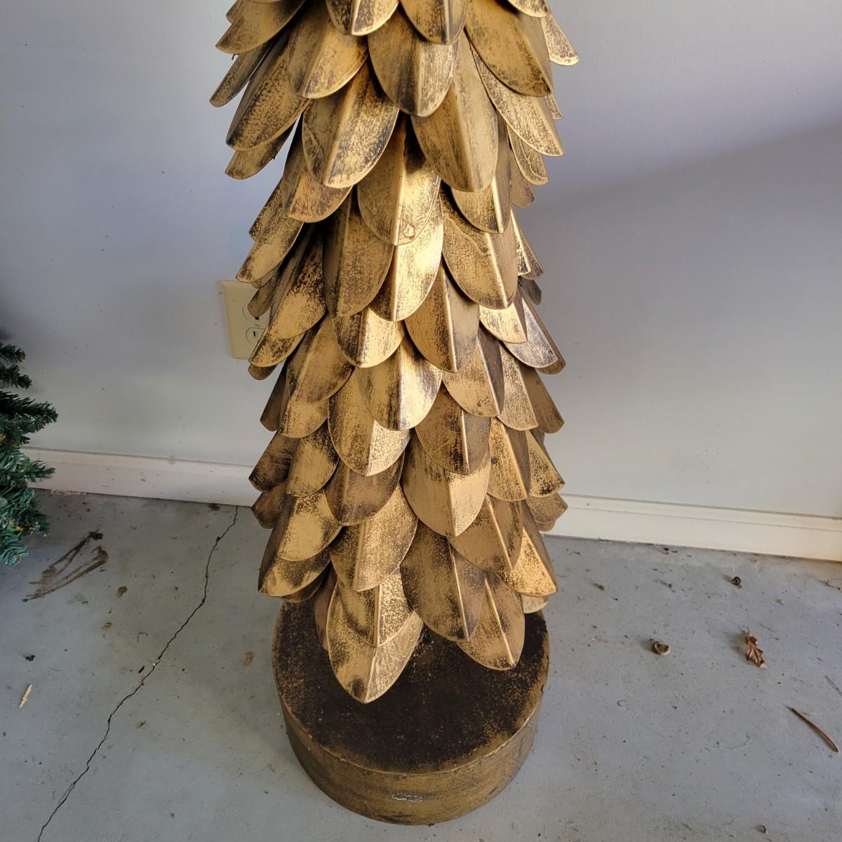 A gold colored, metal Christmas Tree in good condition with no damage. This unique Christmas tree is made of metal leaves welded circularly with leaves that increase in size from top to bottom. Tree is surprisingly heavy. Measures approximately 13" x 60". Local pickup only