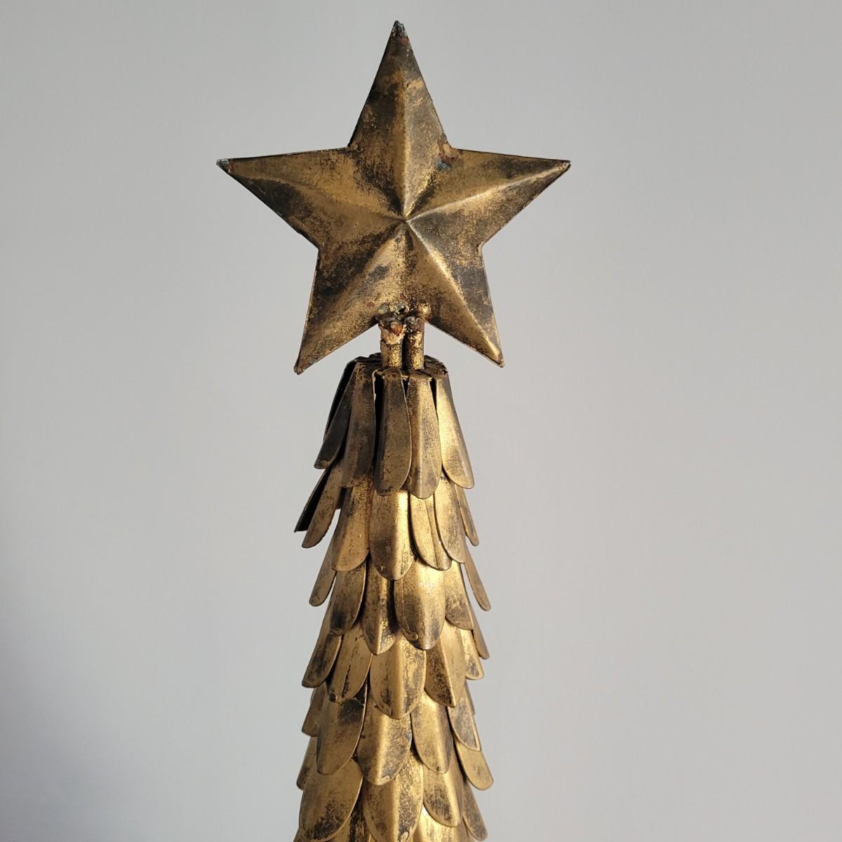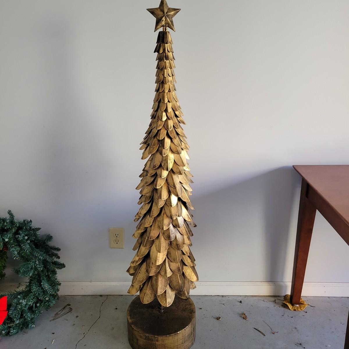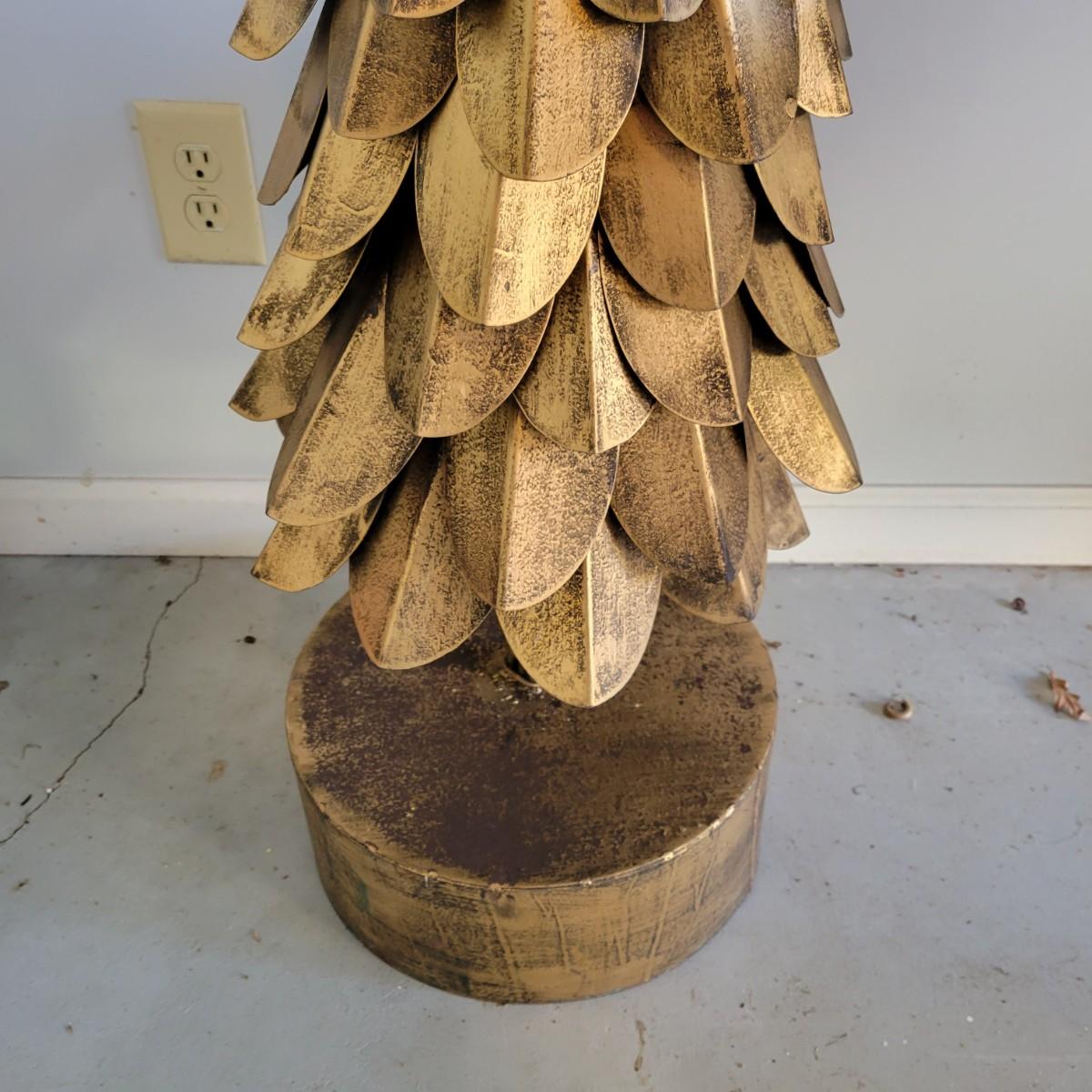 A gold colored, metal Christmas Tree in good condition with no damage. This unique Christmas tree is made of metal leaves welded circularly with leaves that increase in size from top to bottom. Tree is surprisingly heavy. Measures approximately 13" x 60". Local pickup only